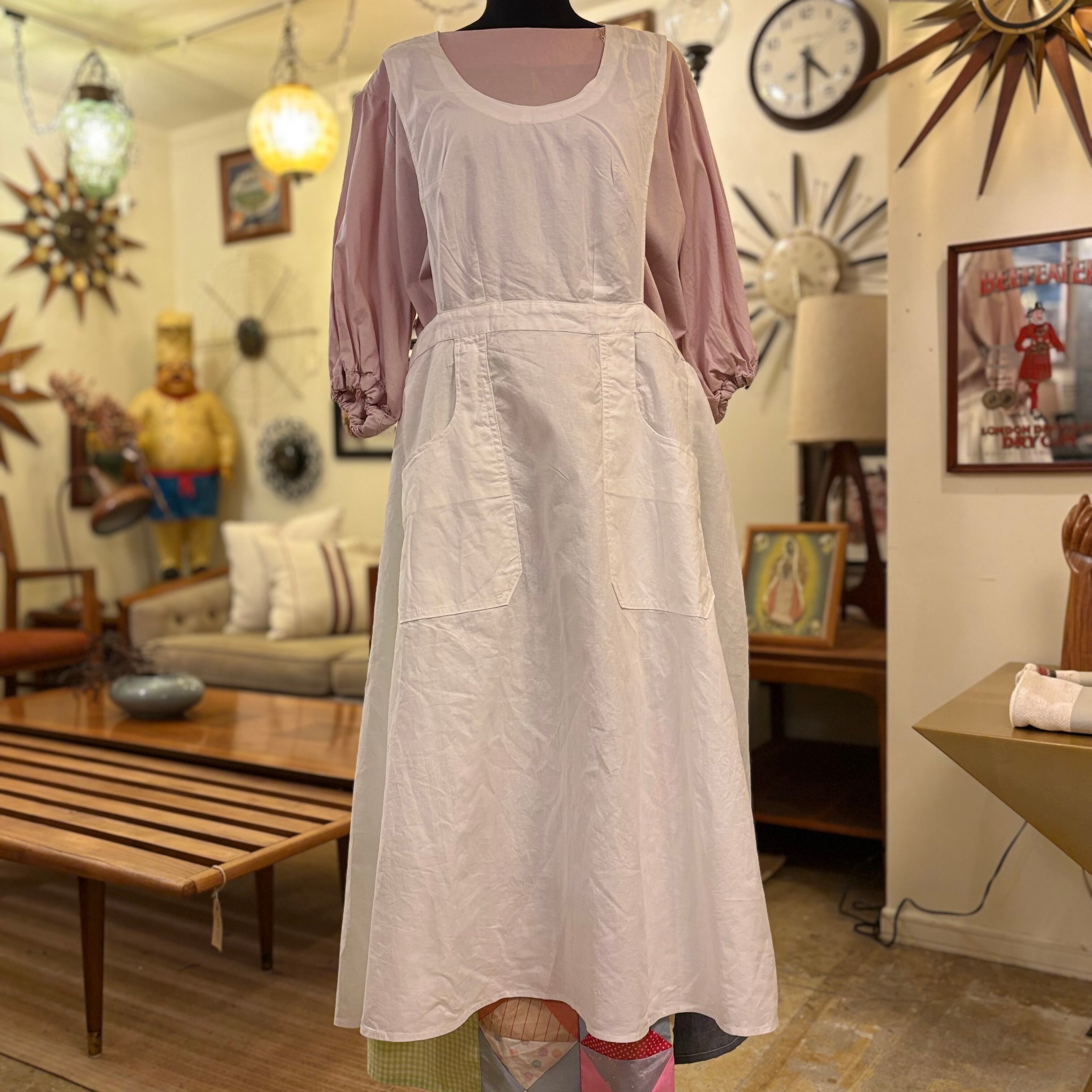 フランスのヴィンテージリネンエプロンをリメイクしたワンピースです。ポイントは、スカートの裾に愛らしい『おじさんコック』の刺繍が施されており、ヴィンテージ好きの心をくすぐるデザインです。ウエストは、ボタンで調節可能で、ゆったりと重ね着コーデをしたり、レイヤードスタイルが楽しめます。