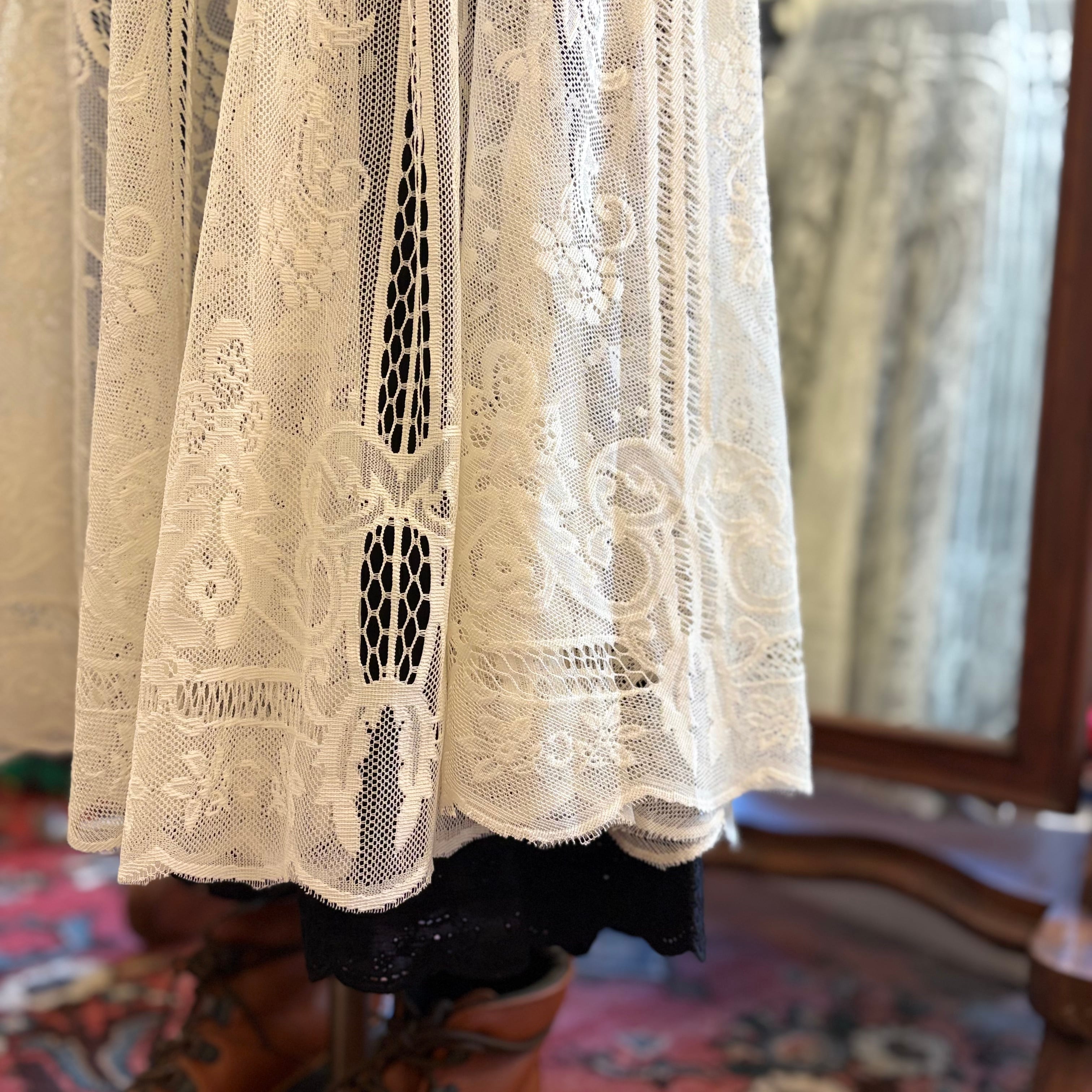 ボリューム感たっぷりのAラインロングスカートです。薄手のレース素材を使い、軽やかな印象に仕上げています。重ね着も自由自在で、多彩なコーディネートをお楽しみいただけます。ウエストはゴム仕様となっており、幅広い体型の方にフィットしやすいデザインです。色はクリームホワイトでアンティーク感のある大人の深みカラーです。