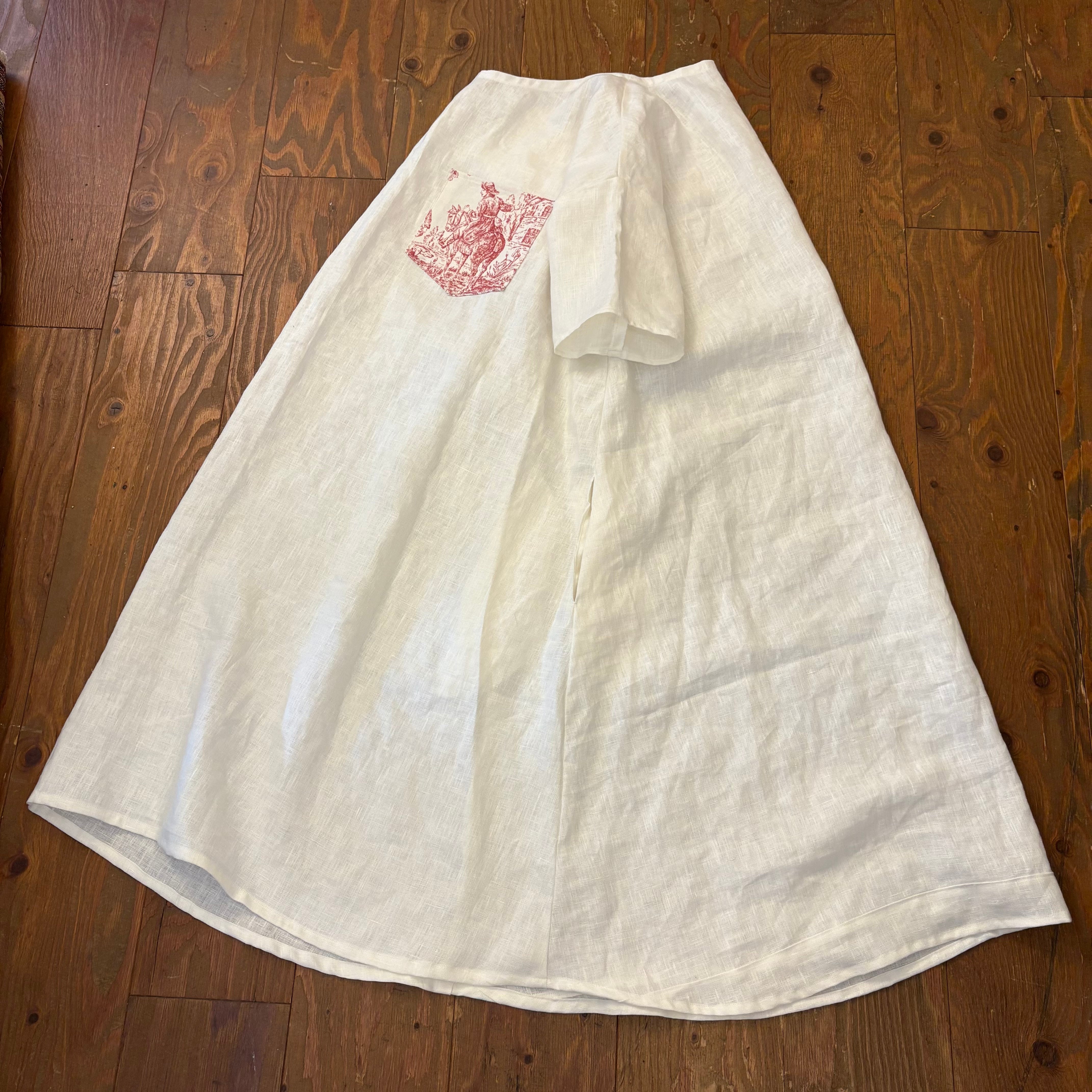 上質なリネンを使用した、ゆったりとしたシルエットのワンピースです。程よい透け感と、しっかりとしたハリのある生地感が特徴で、着心地も抜群です。胸元にはフランスのリネン生地を使用。中世の狩風景を描いた赤いプリントがアクセントに。1枚でサラッと着るのはもちろん重ね着にもぴったりなデザインです。