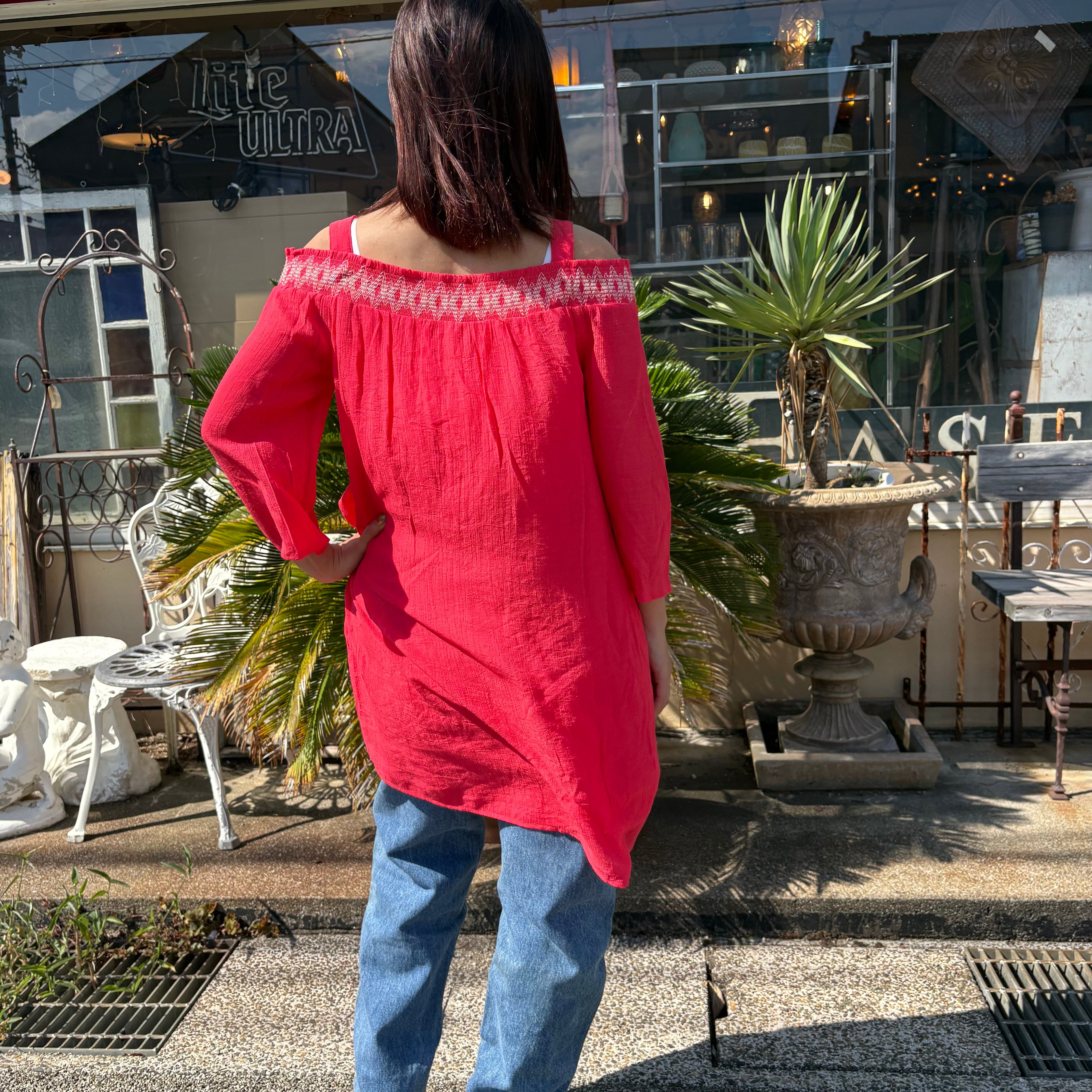 胸元のシャーリングと細やかな刺繍がポイントで、華やかさを演出します。薄手のレーヨン素材を使用しており、裏地が付いているため、着心地も抜群。肩のホルダーは取り外し可能で、オフショルダーとしての着用も可能です。さまざまなシーンで活躍するアイテムです!
