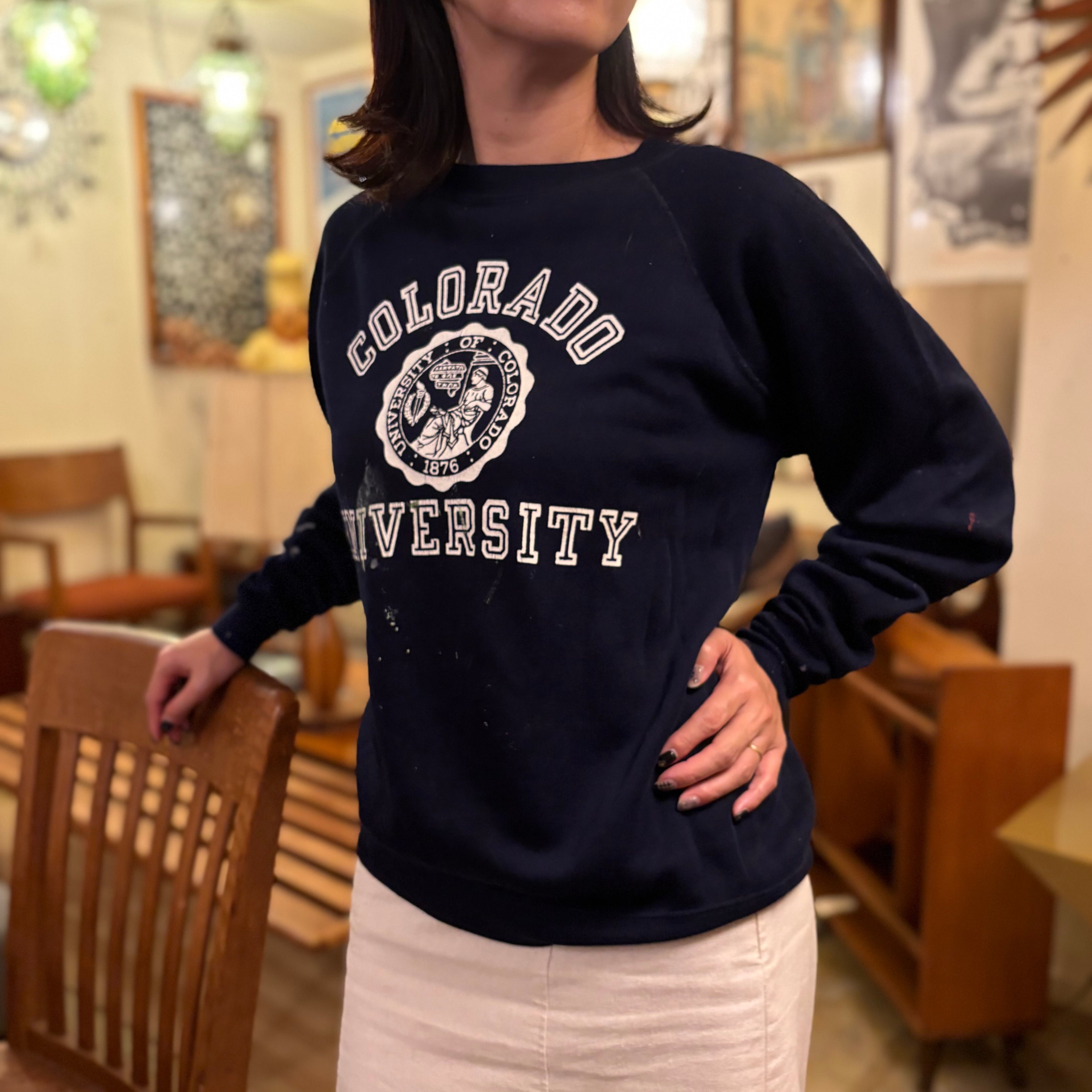 70年代ヴィンテージカレッジスウェット。ネイビーボディにホワイトのアーチのカレッジロゴ。ラグランスリーブで動きやすく、快適な着心地。ペンキ跡やプリントのクラックが雰囲気を出しています。