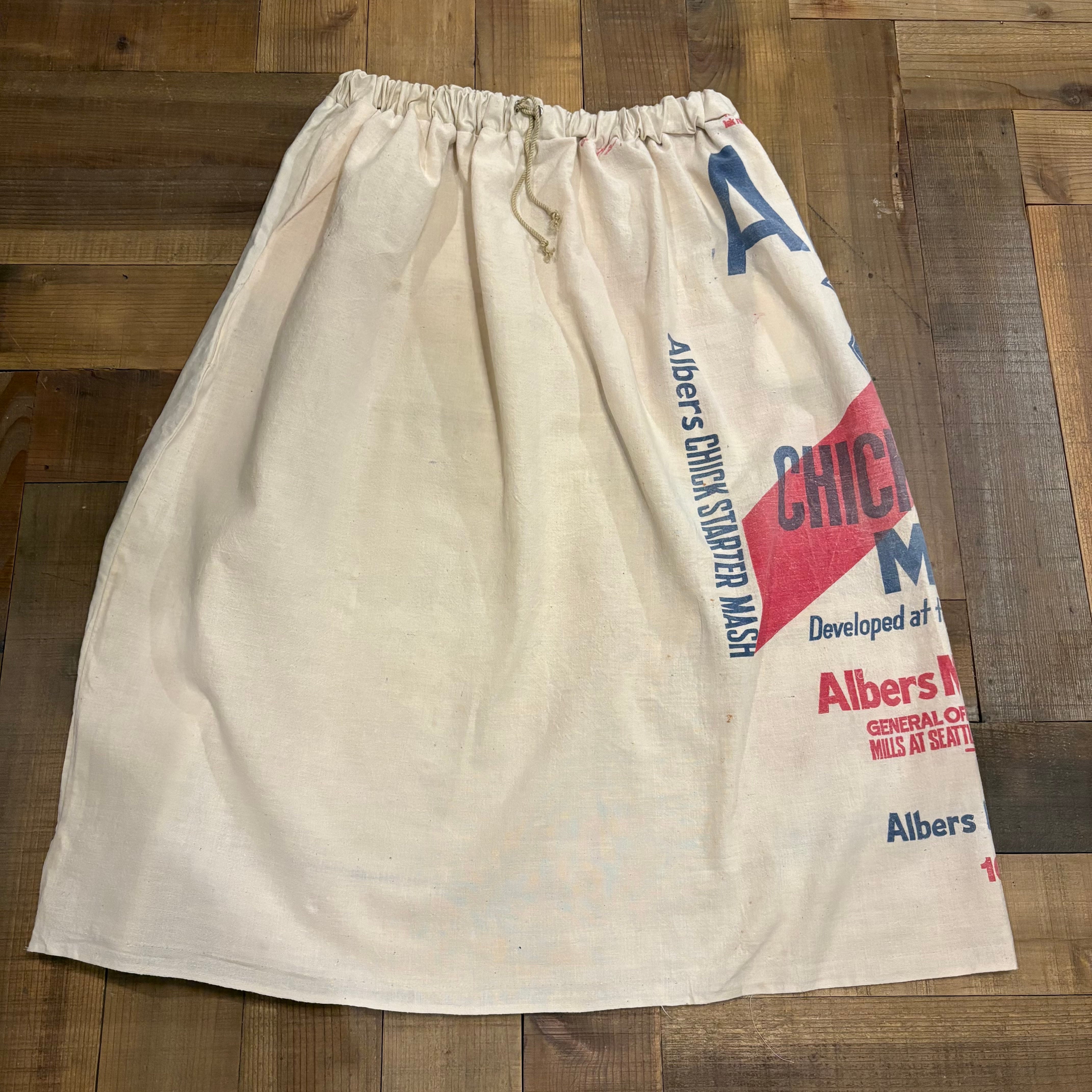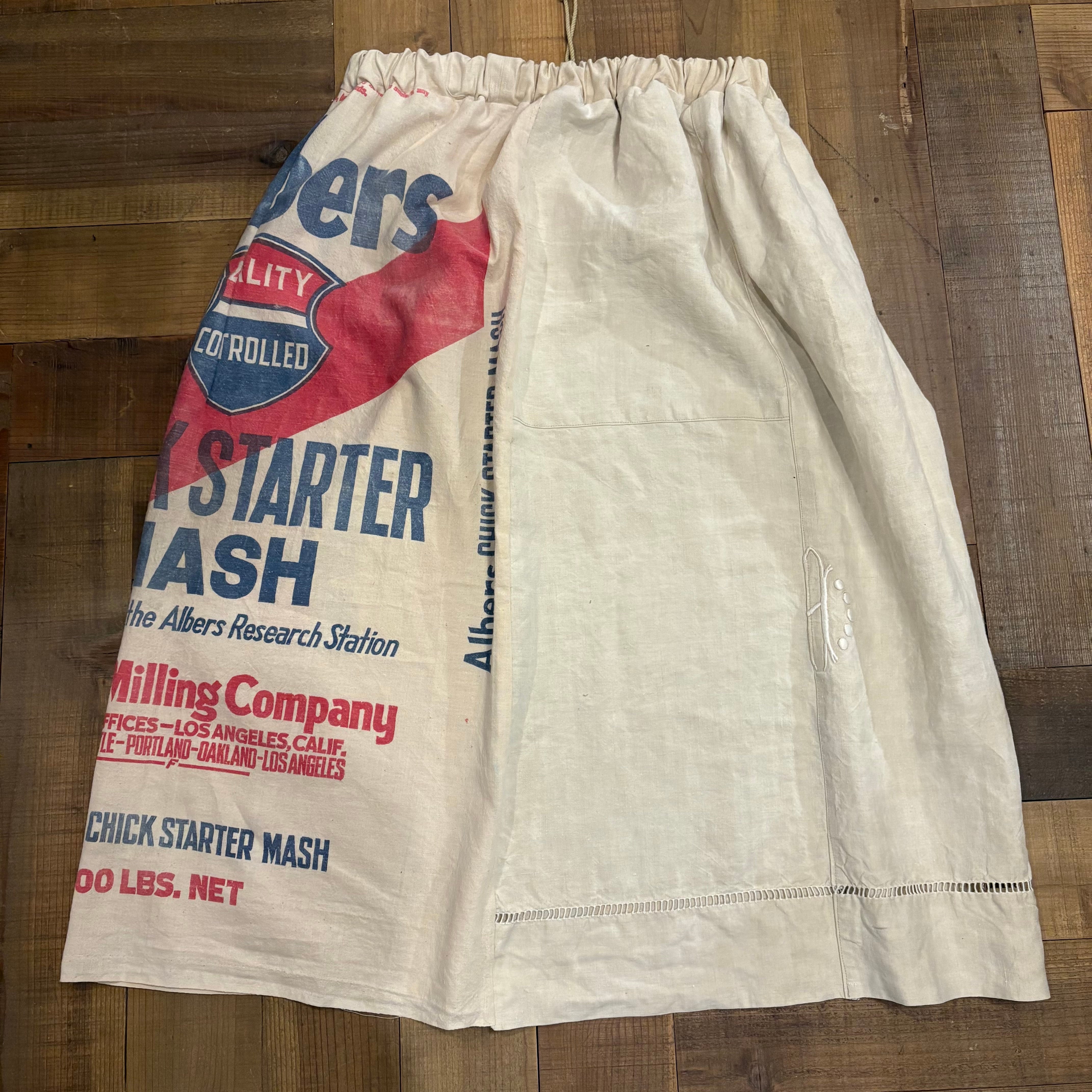 フレンチリネンとヴィンテージのフィードサックを組み合わせたリメイクスカートの第二作目です。両サイドにポケットをつけ、ウエストはゴムとドローコードで調整可能。経年で柔らかくなったフィードサックとリネンの自然な風合いがよく馴染み、着回しも抜群。長く育てて行きたくなるスカートです。