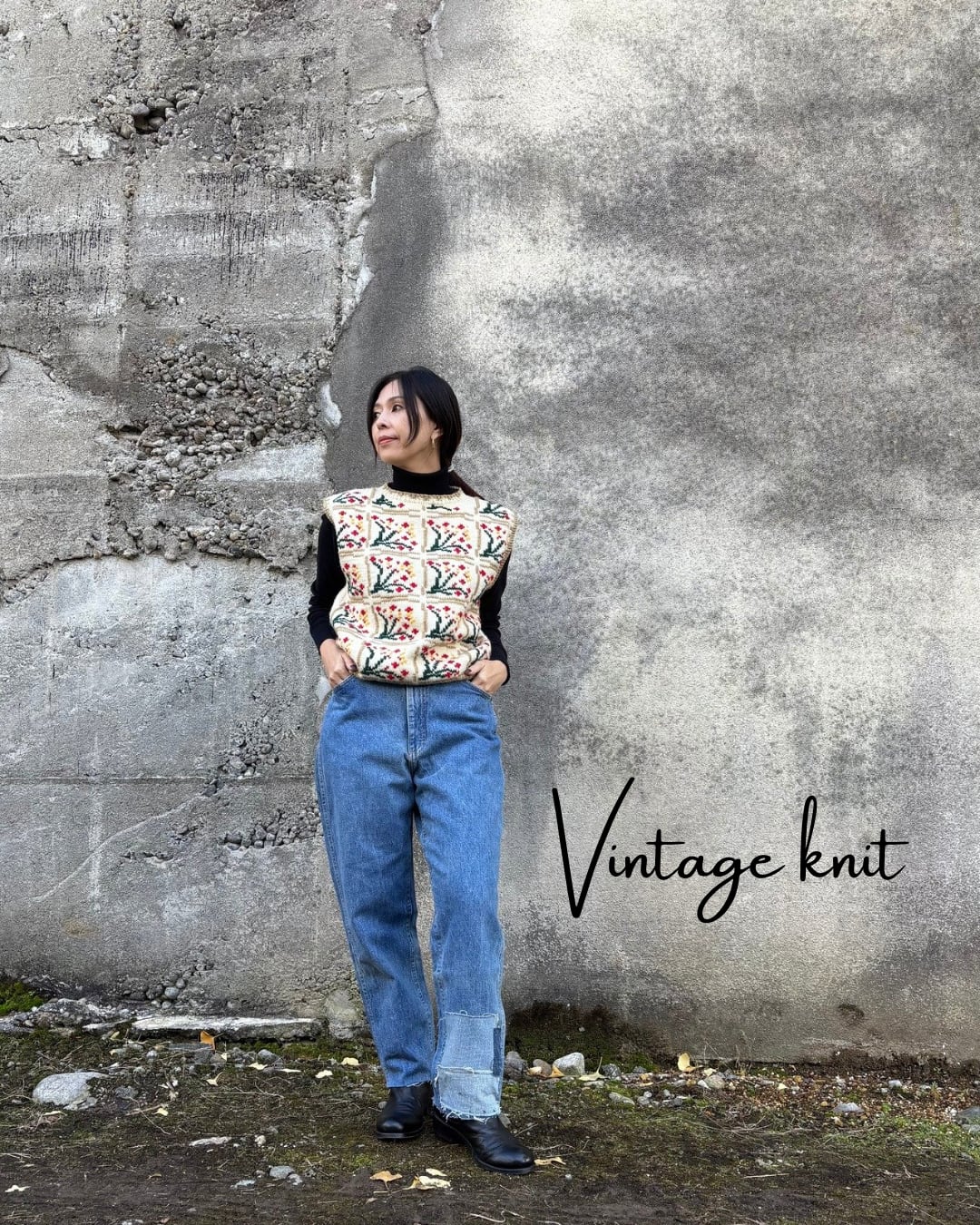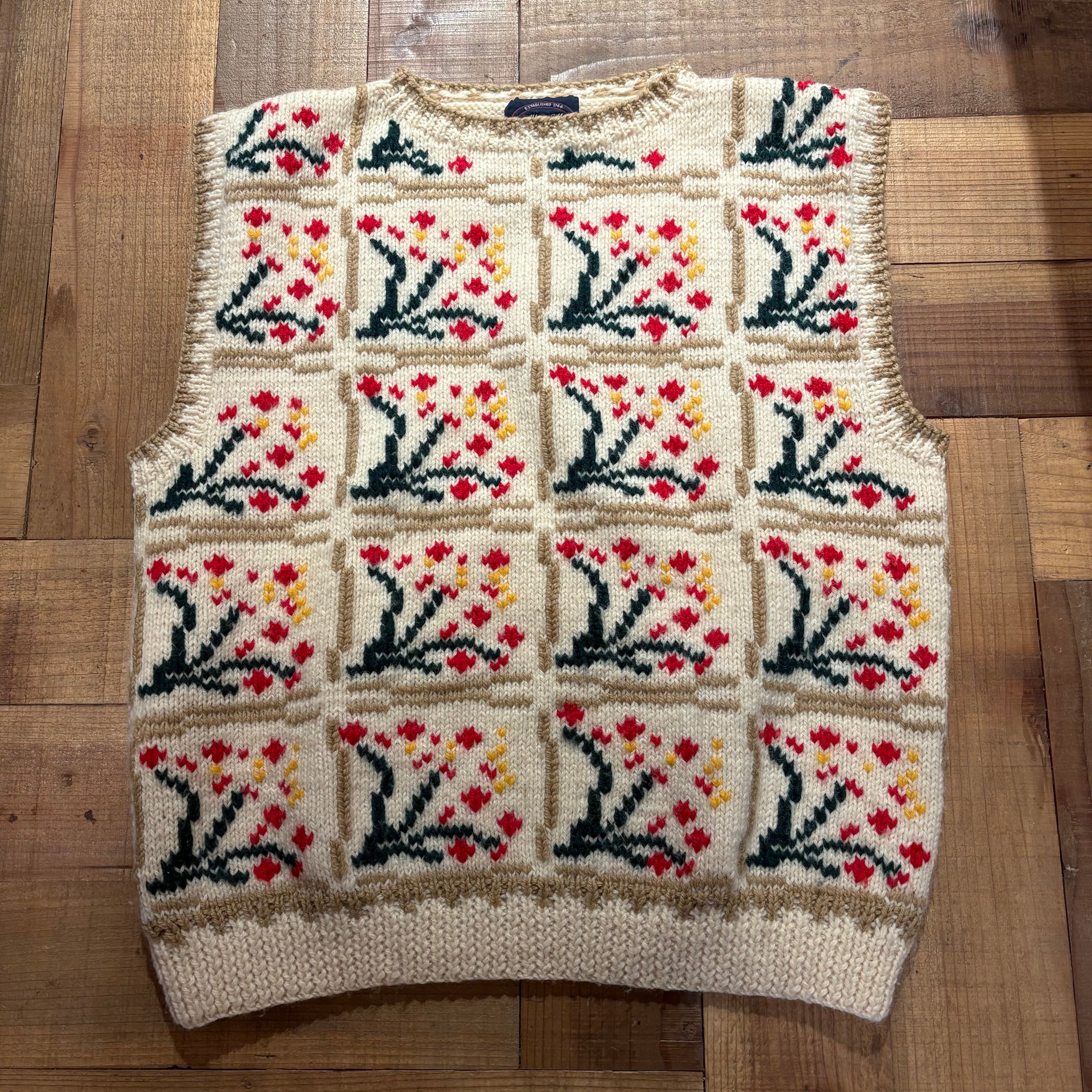 お花の刺繍が美しく施されたニットベストです。しっかりとした編み地で作られており、寒い季節でも暖かく過ごせます。レイヤードスタイルを楽しむのにぴったりなデザイン。シャツやブラウスとの組み合わせもおすすめです。刺繍部分は手仕事ならではの温かみがあり、着るたびに愛着がわく一枚です。