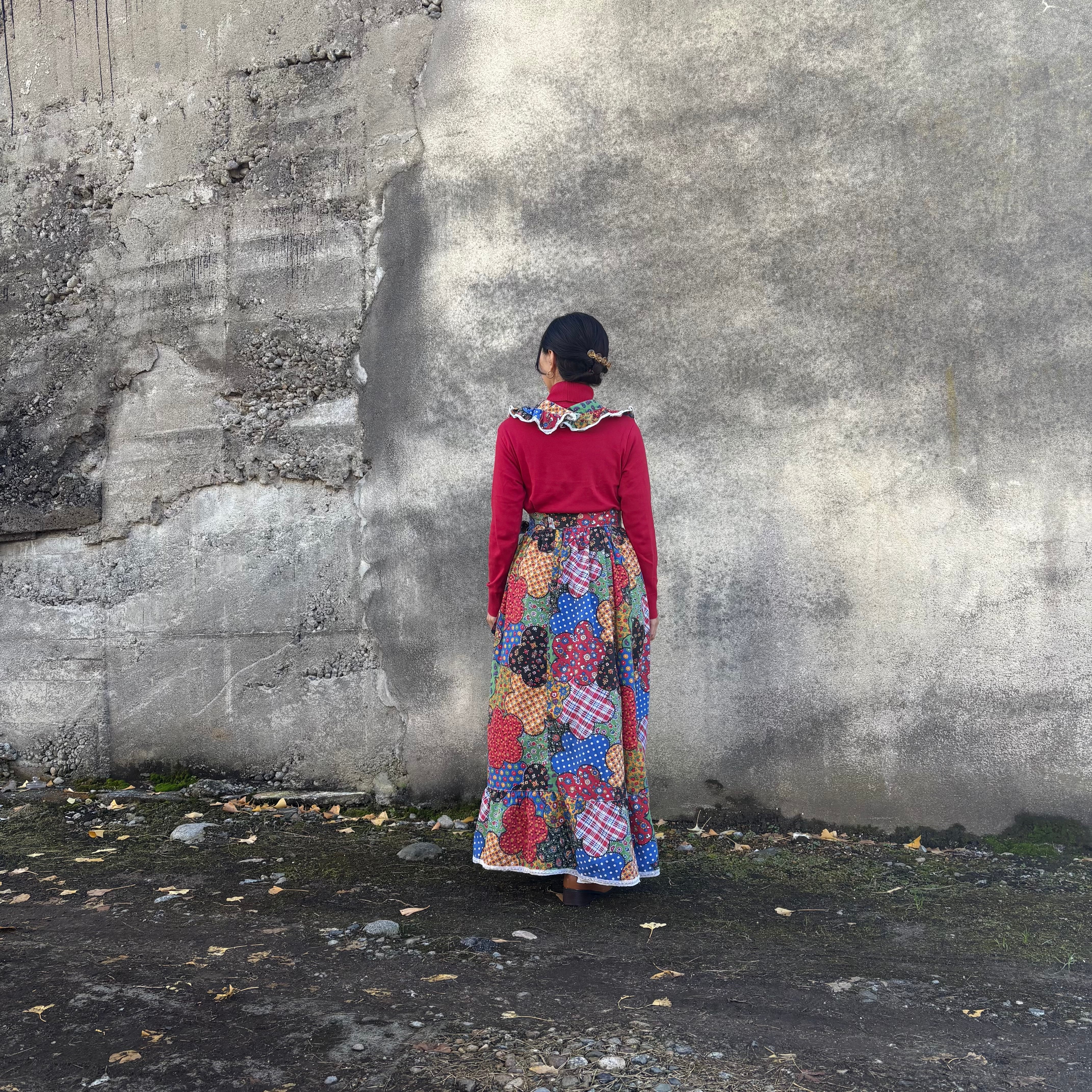 カラフルなパッチワークプリントが特徴のヴィンテージのエプロンワンピースです。ネック部分にはギャザーとヴィンテージレース使用で可愛いフリル襟のデザインになっております。マジックテープで着脱が簡単でとても便利。ウエストは巻きスカート仕様になっており、後ろもしっかりとカバーしてくれるデザインです。裾にはさりげないアンティークレースが施されていてる素敵なデザインです。マキシ丈で見た目もすっきりと見え、甘すぎない大人スタイルに。