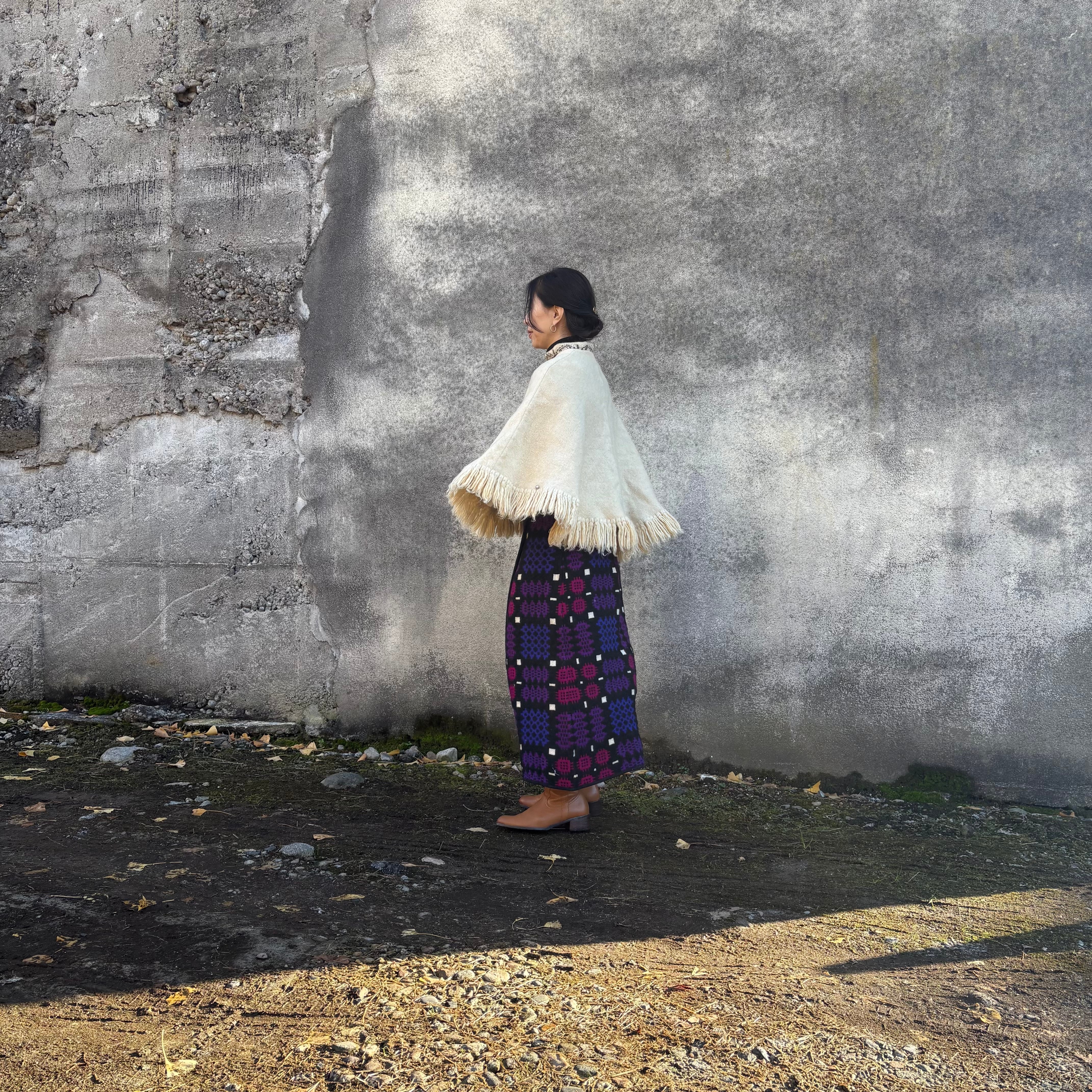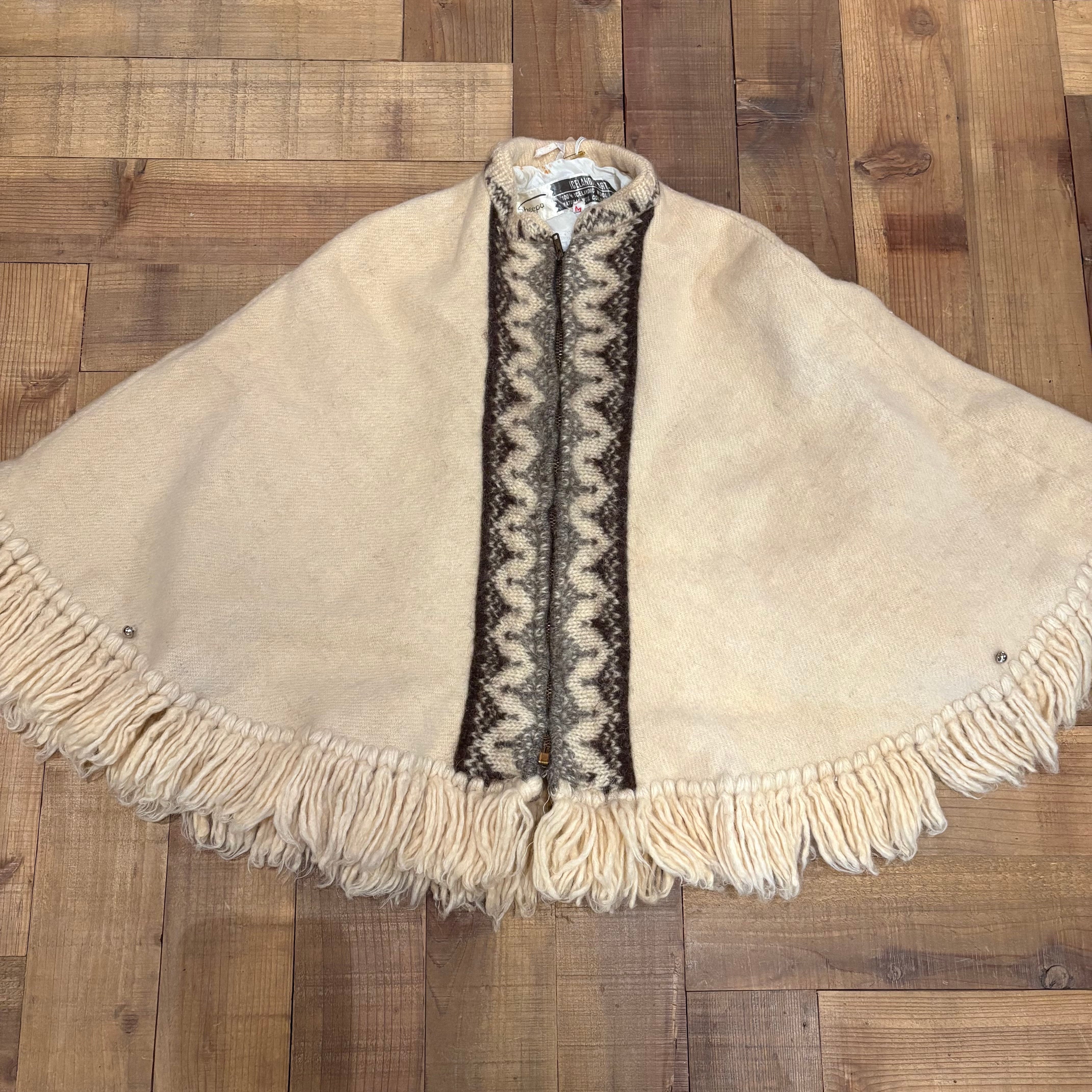 50年代アイスランド製のヴィンテージポンチョです。フロントはフルジップ仕様で、着脱が簡単。裾に施されたフリンジがアクセントとなっております。そして所々にシルバーのボタンが、ついていてさりげないアクセントに。裏地にはサテン生地を使用しており、滑らかな肌触りで着心地抜群。バンドカラーでフロントのニットパターンが北欧らしいデザイン。