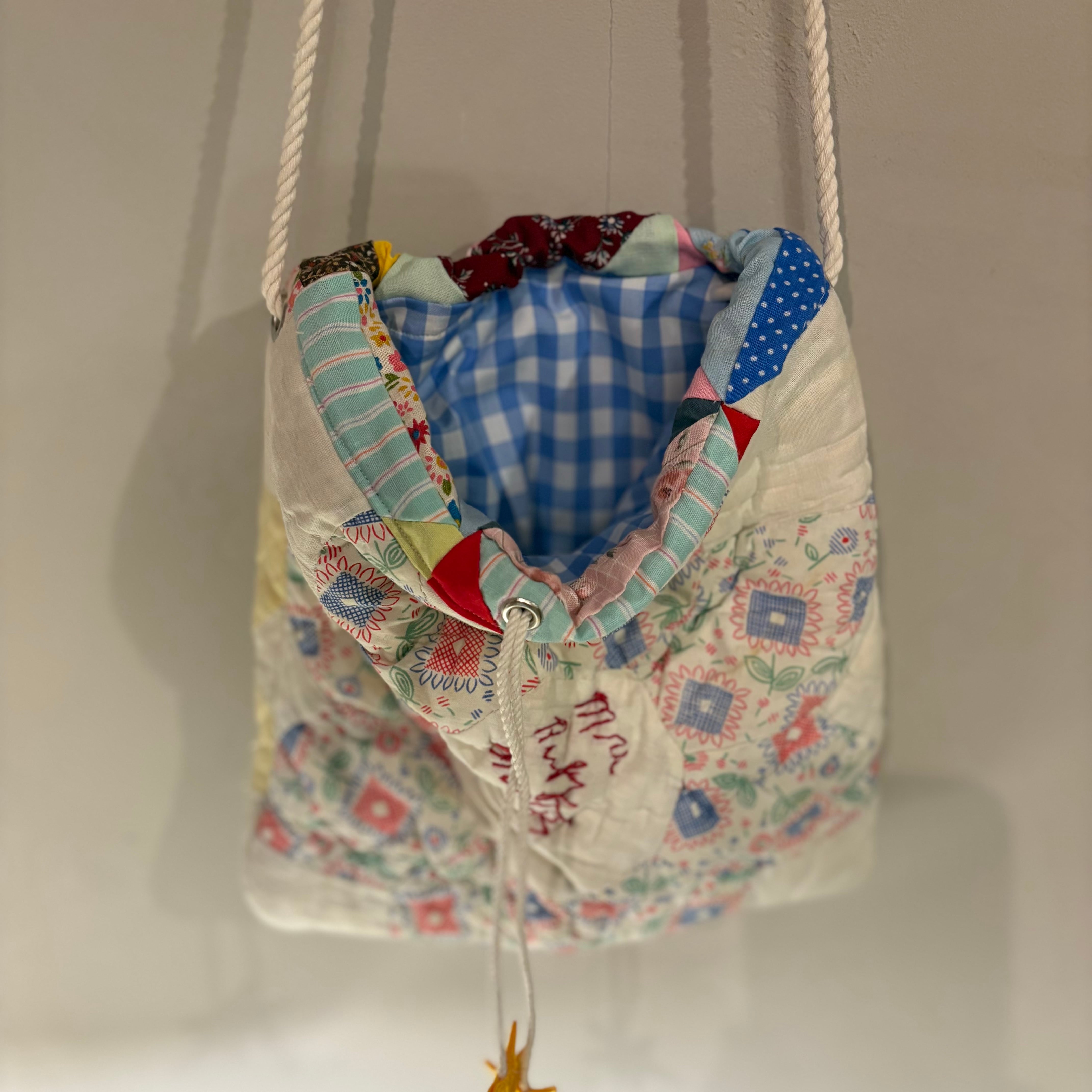 希少な古いフィードサックの星パターンキルトを贅沢に使用した、巾着ショルダーバッグです。当時の刺繍がそのまま残っており、素朴な雰囲気です。生地の薄くなっている部分に補給も兼ねて星の刺繍をプラスしました。紐の先端にも星モチーフをあしらいました。裏地はチェック柄。紐はお好みの長さに調整可能です。もこもこキルトはオーガニック素材で肌触りも良いです。