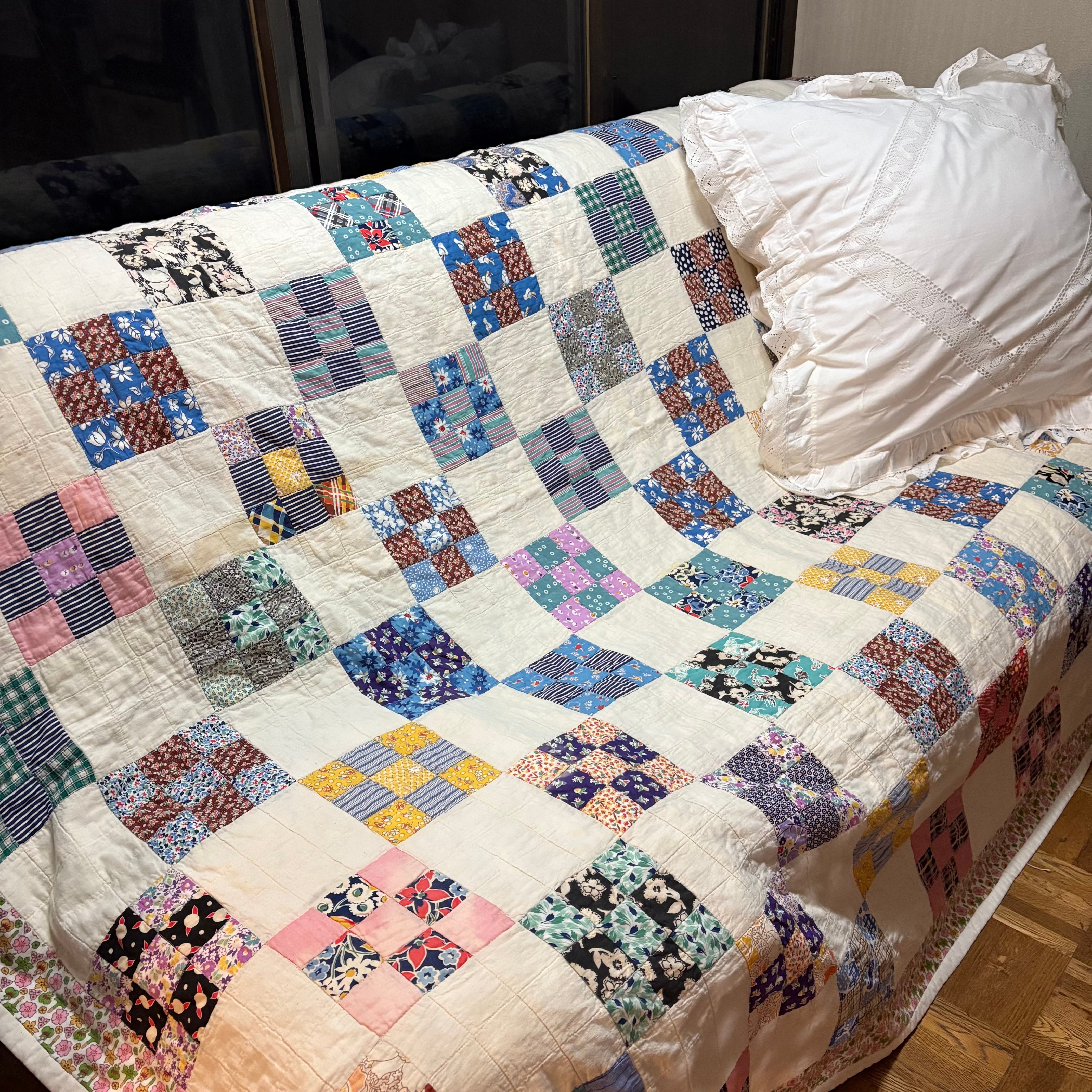 小さなピースを丁寧につなぎ合わせた1930年代から40年代ごろのアンティークパッチワークキルト。four patchパターンをベースにしており、定番のクラシックなパターンです。花柄、ストライプ、チェックなどのフィードサック生地を使用。長年の風合いとオーガニックコットンのとても良い肌触りを実感してください。細かなハンドメイドステッチも素晴らしいです。