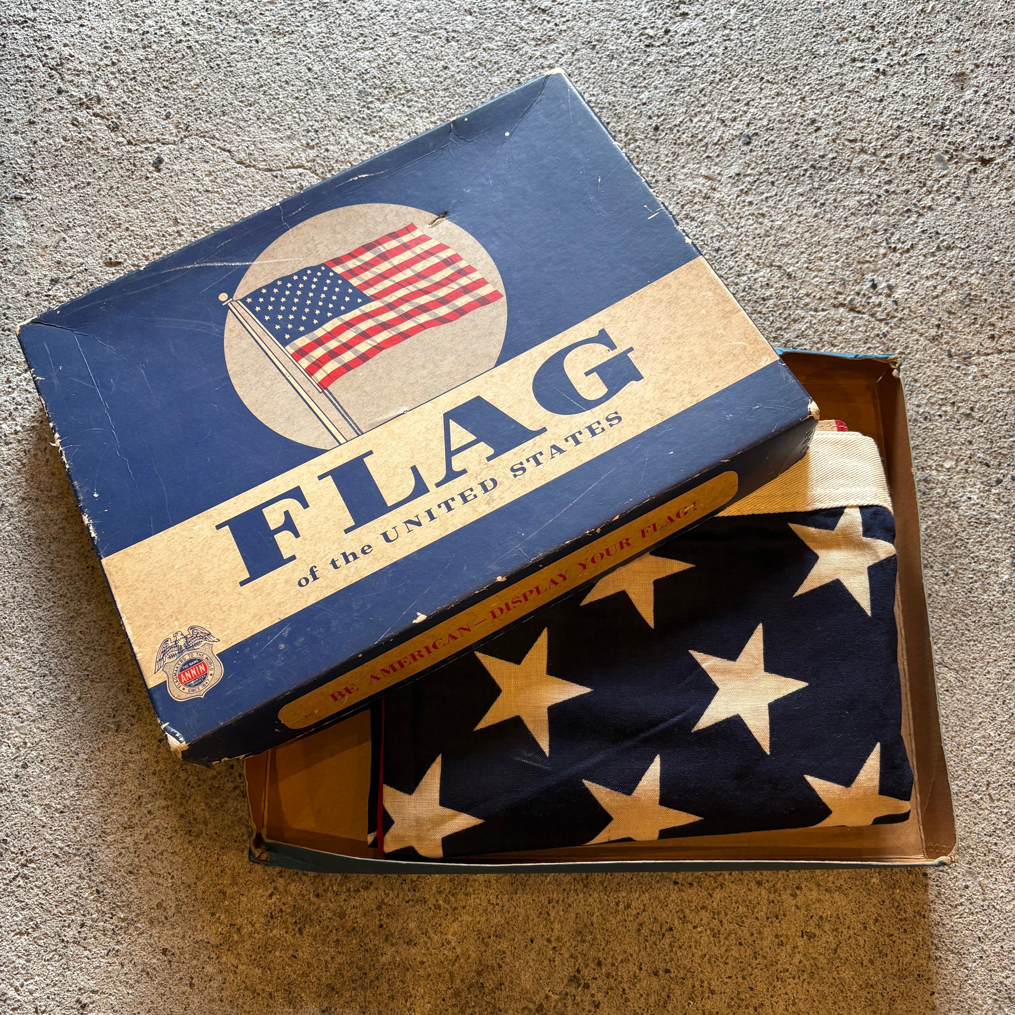 ANNIN社製のオリジナルボックス付きアメリカ国旗です。老舗フラッグメーカーANNIN & Co.によるアメリカ国旗。箱付きは希少です。星は50スターで、ハワイ州が加わり50州になった直後(1960年代初期)のものではないかと思われます。素材はコットン製。デットストックに近いコンディションですが、経年によるうっすらとしたシミが一部見られます。