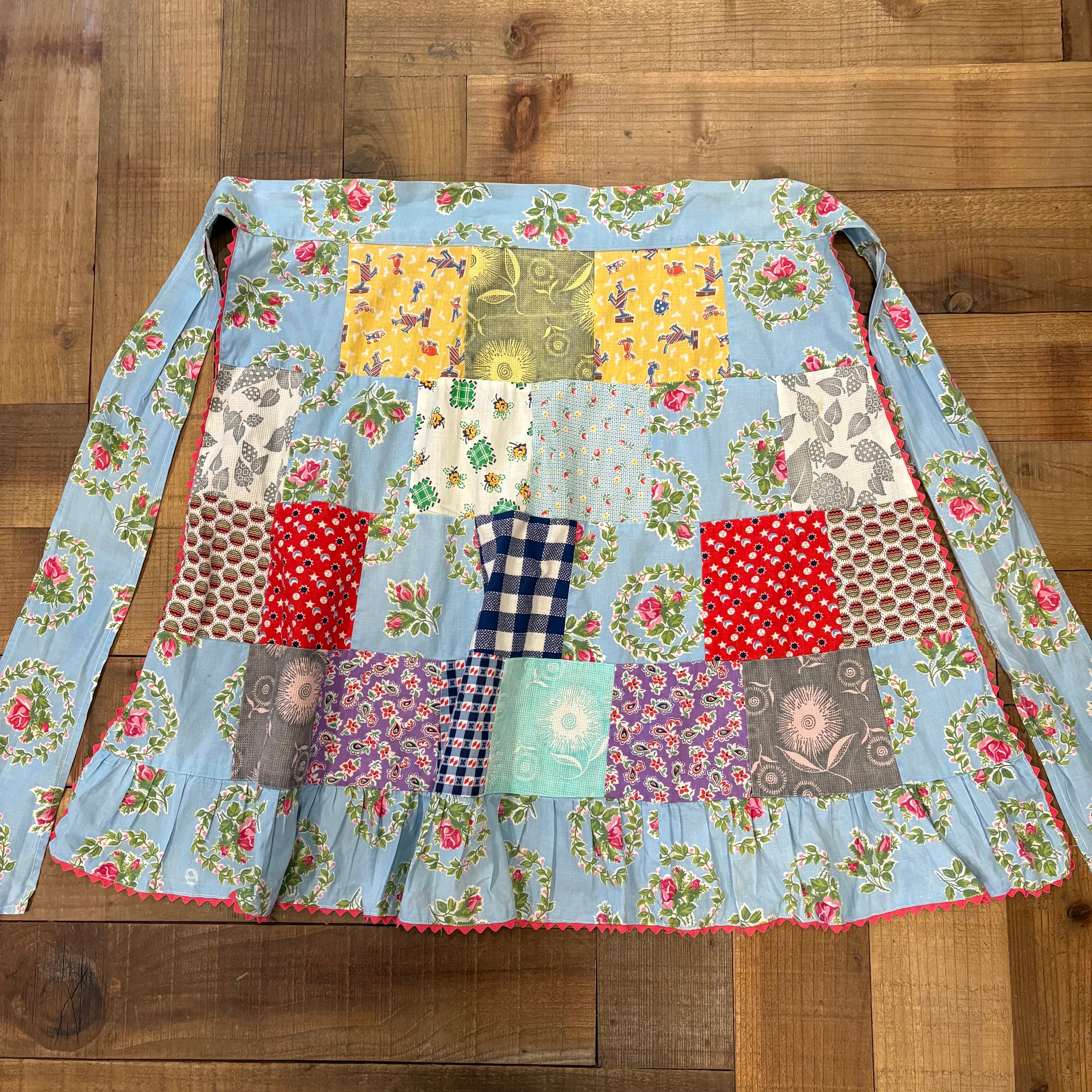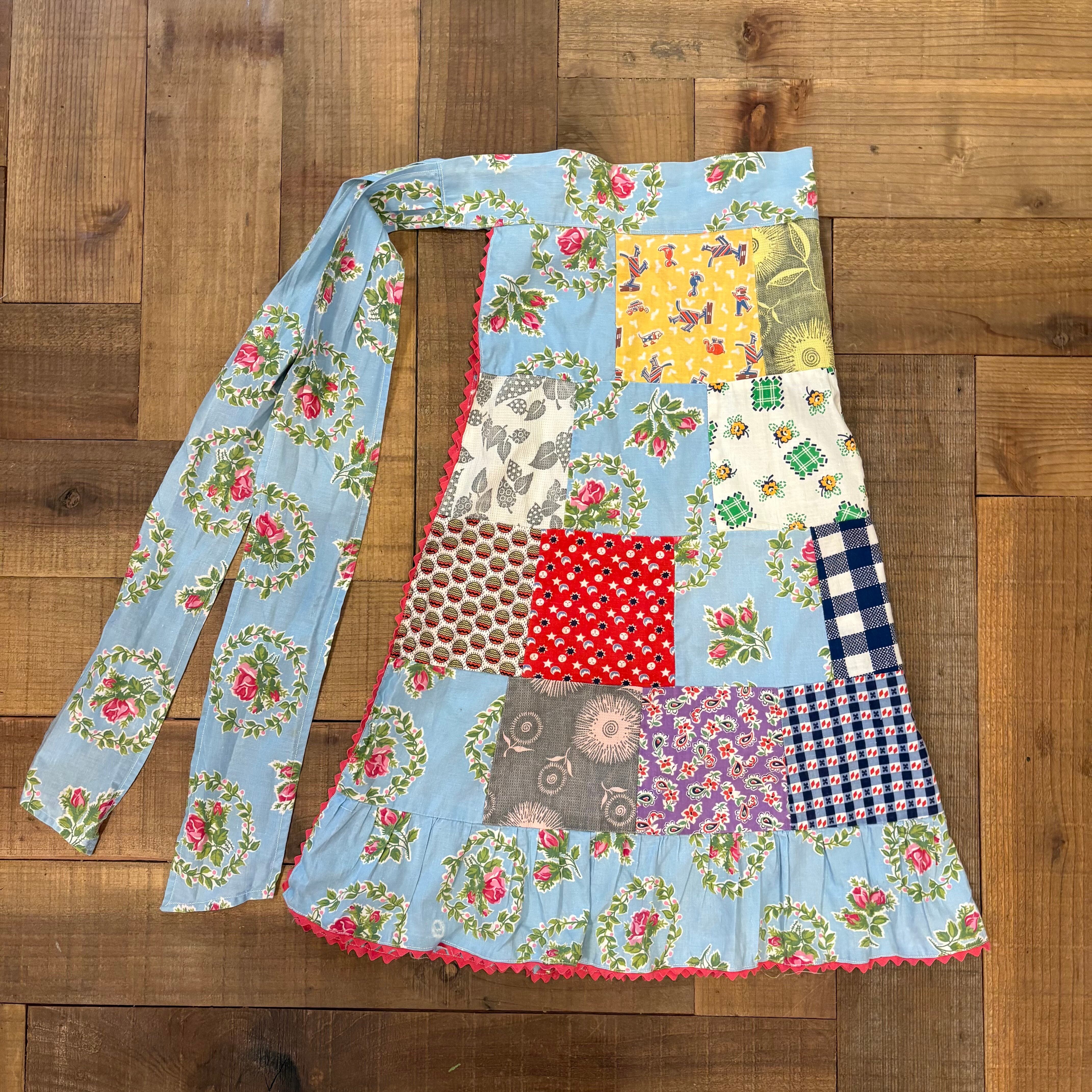 希少なヴィンテージフィードサックを使用しているパッチワークエプロンです。色とりどりのフィードサックが組み合わさり、POPで華やかな配色が目を引きます。日常のコーディネートのアクセントにも大活躍!レイヤード次第でファッションアイテムとして楽しむことができ、様々なシーンでご利用いただけます。