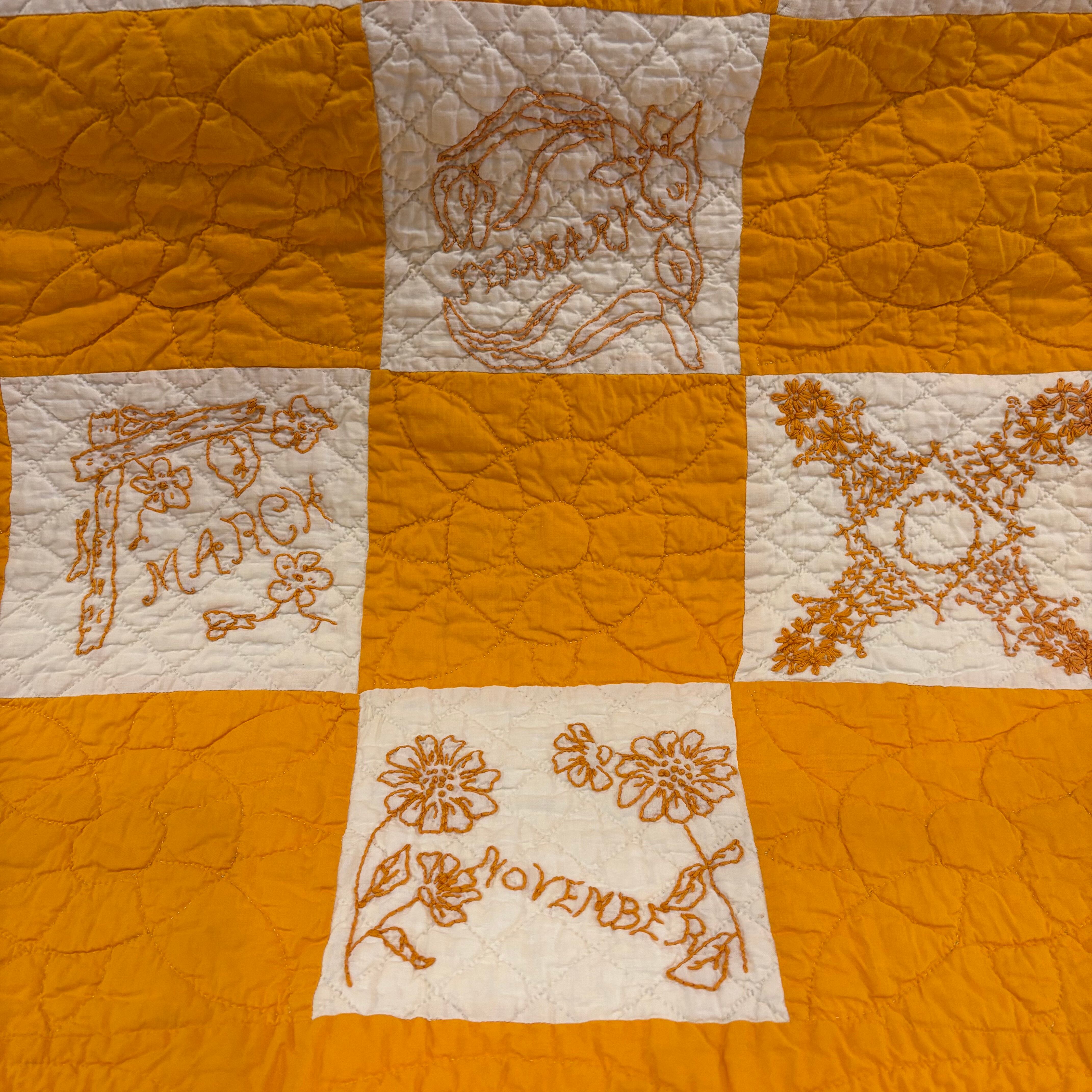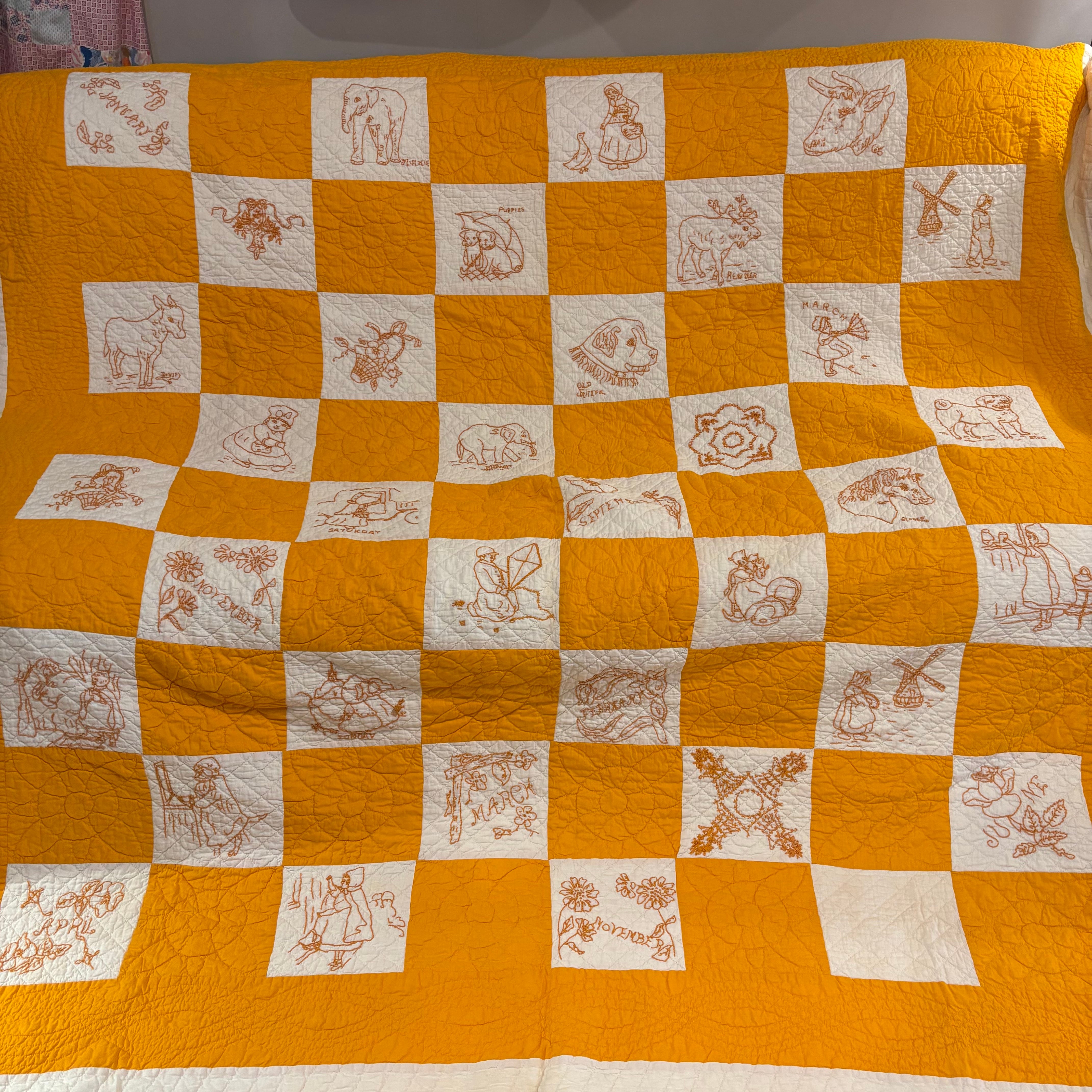 細かな刺繍が施されたアンティークパッチワークキルト。特に動物モチーフが中心となっているデザインが魅力的です。一つ一つのパネルには、繊細な刺繍の技術が光り、視覚的にも触覚的にも楽しめる逸品となっています。こちらのパッチワークパターンは ”チェッカーボード”。構成はとてもシンプルでその分、刺繍やキルトステッチの美しさを主役にするためのパターンです。花や波模様の細かなキルトステッチはすべて手仕事。圧巻の手刺繍とキルティング、まさに手仕事を味わうためのアートキルトです。