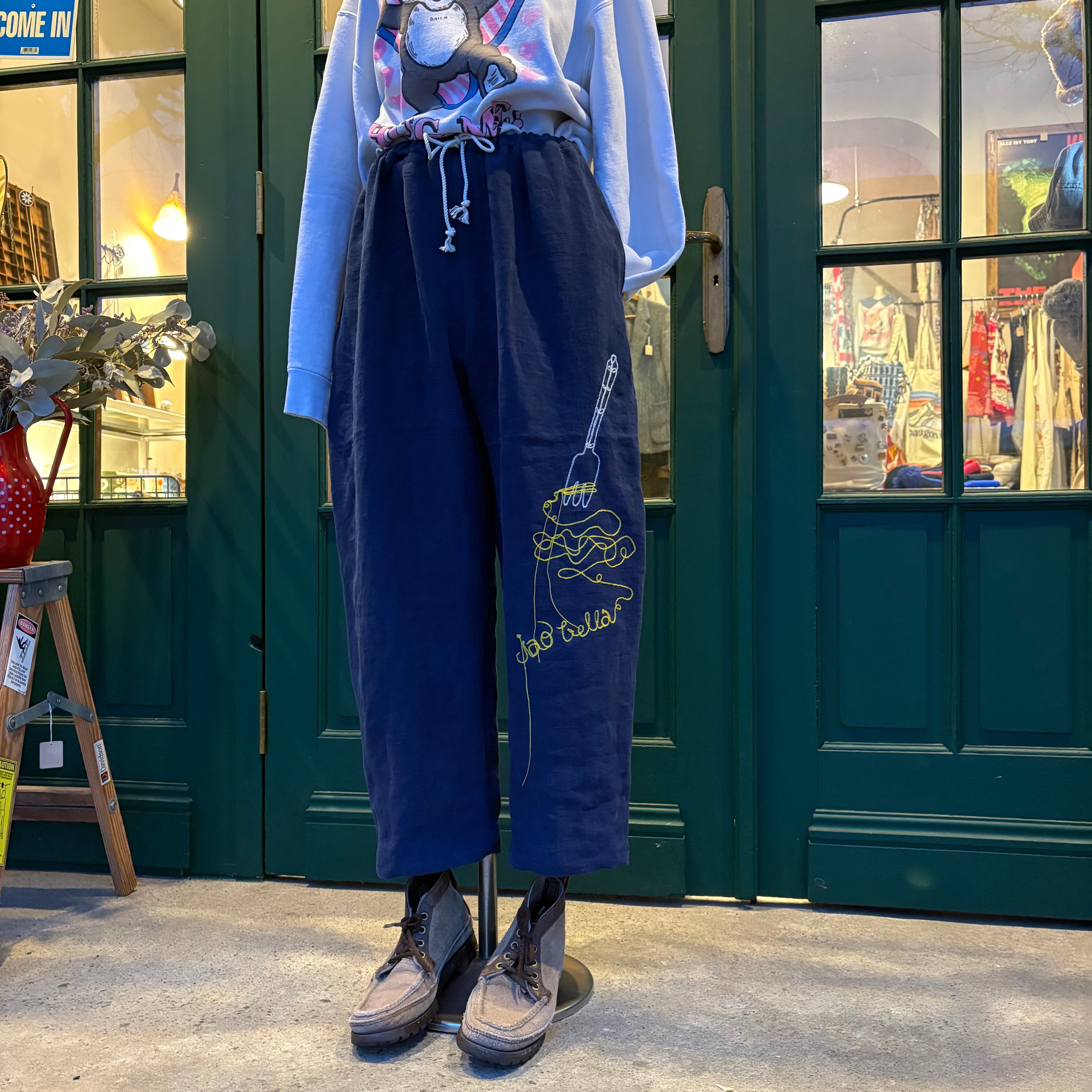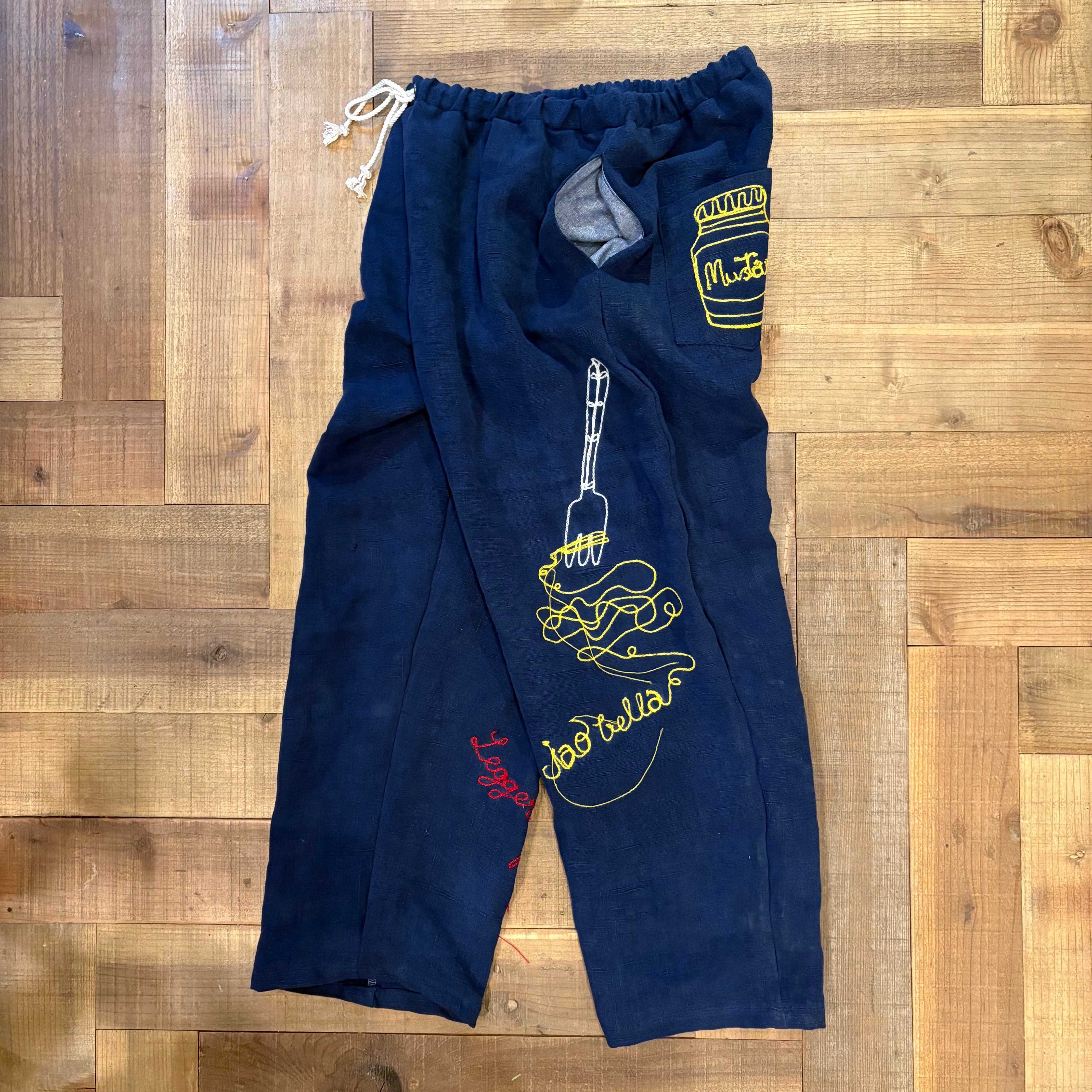 アンティークフレンチリネンをインディゴに染め上げ、シェフパンツに仕立てました。フロントには、フォークとパスタ、ヒップポケットにはマスタードとホットチリソースの刺繍を施しました。そして、イタリア語のメッセージ刺繍”Leggermente piccante"(ほんのり辛め)