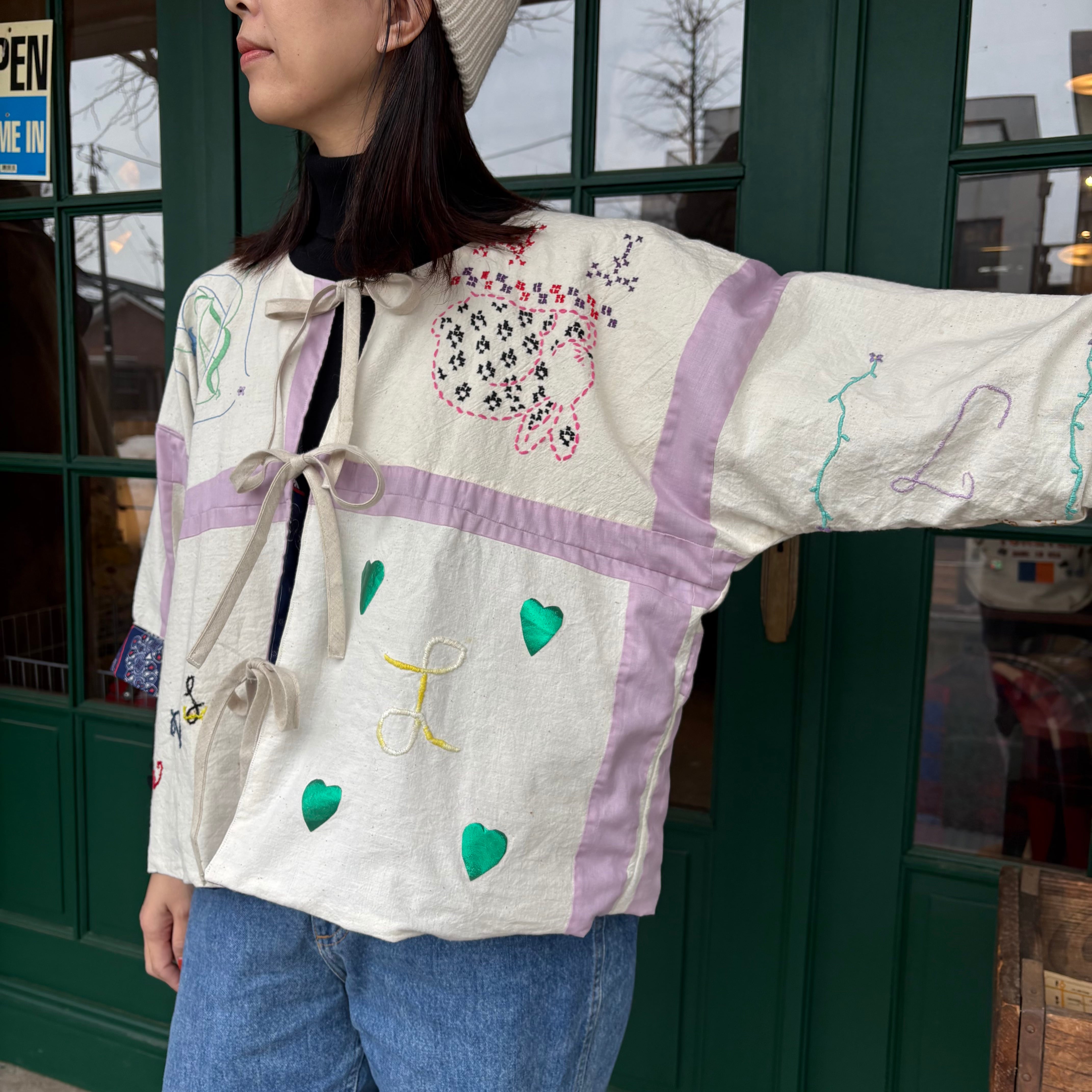 とても可愛い刺繍クロスを贅沢に使用し仕立てたシャツジャケット・第2弾。こちらの生地は、今回で終了となります。ブラウスとしても、軽く羽織るおしゃれなジャケットとしても楽しめます。フロントはリボンで結ぶデザイン。裏地には、デッドストックのヴィンテージ・バンダナ柄生地を使用。ポケット付きでリバーシブル使用となります。気分に合わせて選べるのが嬉しいですね。袖口を折り曲げてチラリと裏地を見せるオシャレも楽しめます。