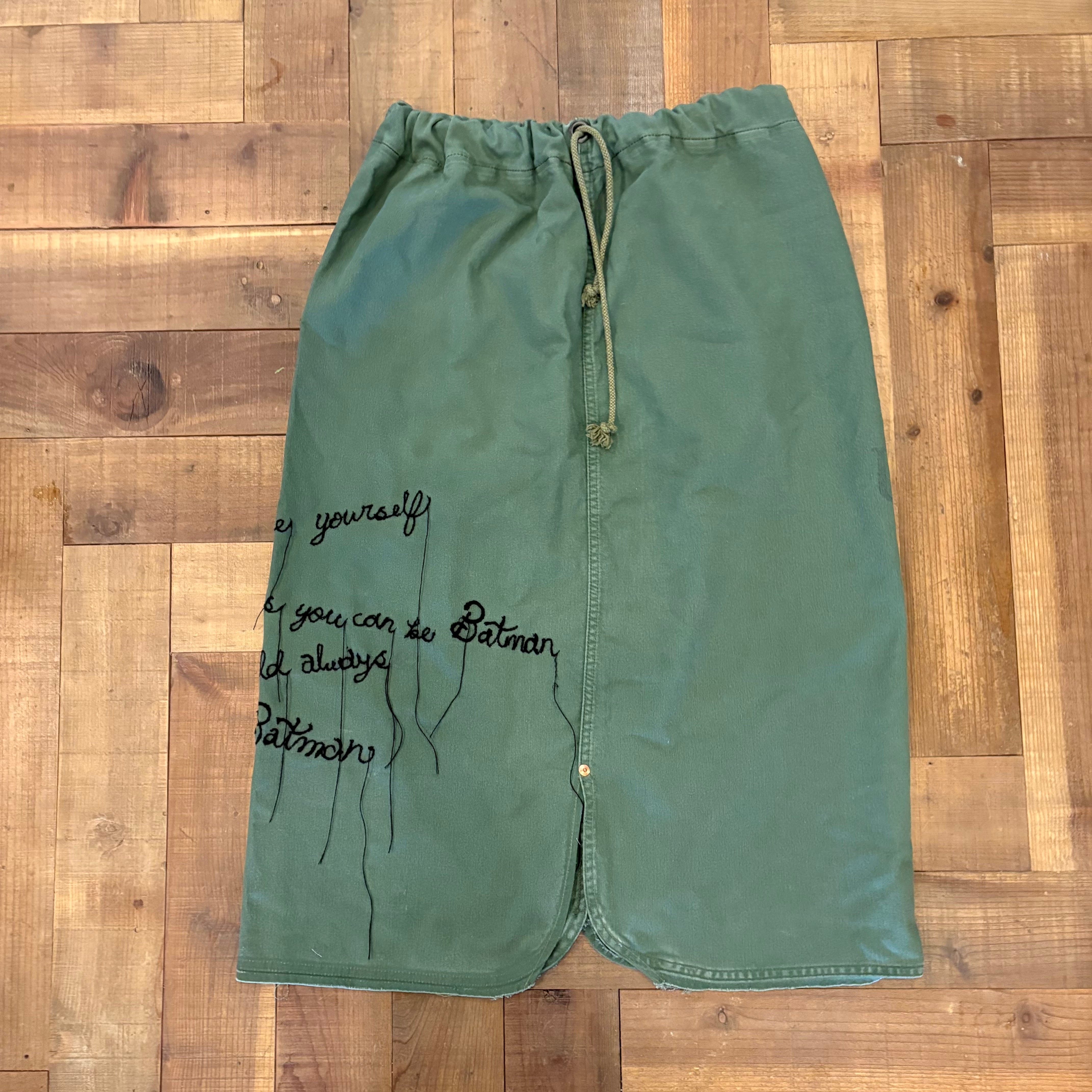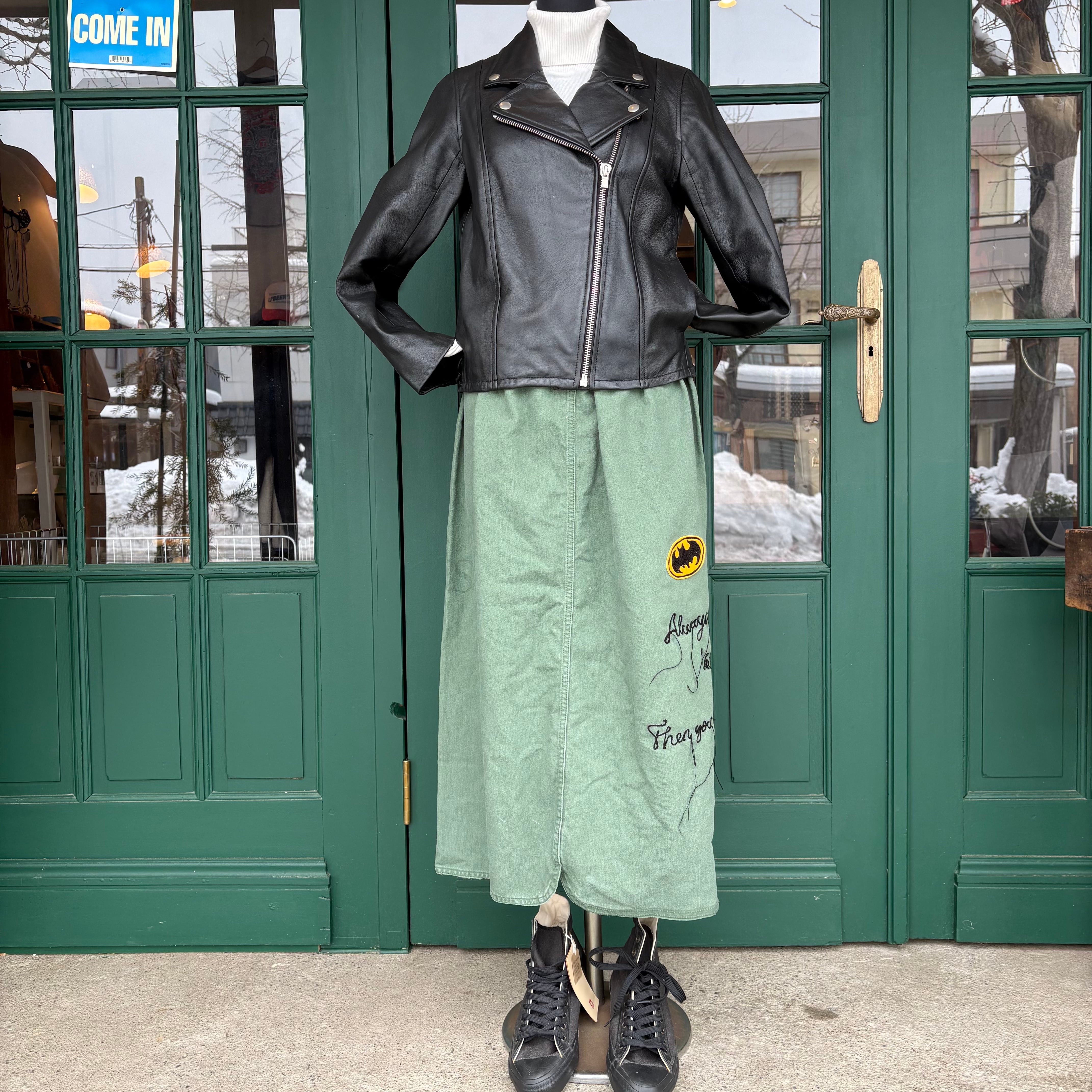 US AMYのバッグを使用し、仕立てたLong Skirt です。以前からご好評いただいているアイテム。シンプルなストレートシルエットに後ろスリットを入れ動きやすく。ポイントとしてリベットをつけました。ウエストはゴムとドローコード仕様でリラックス感のある履き心地。裾は切りっぱなし。サイドにステンシルが施され、さらに"バットマン"モチーフの刺繍をプラス。