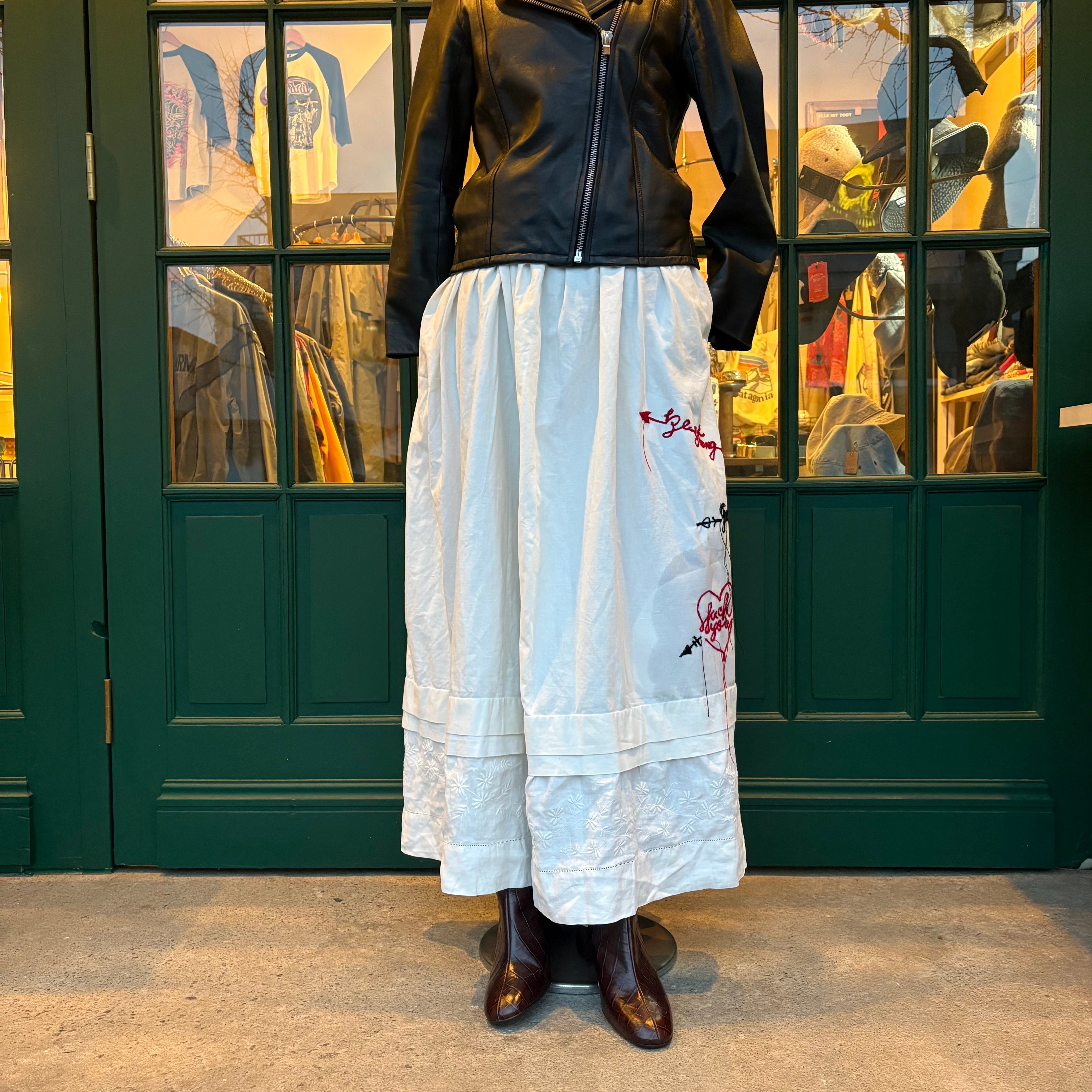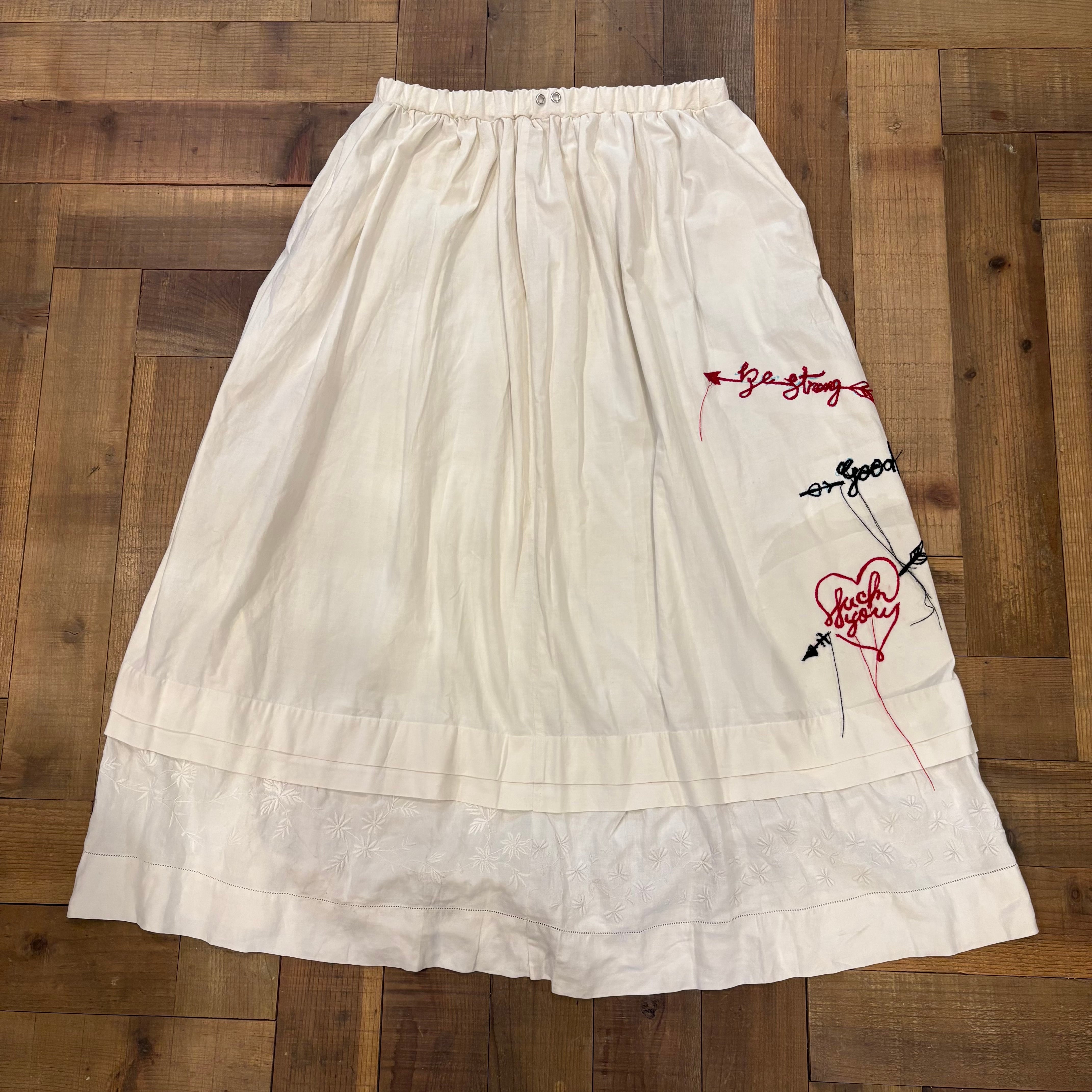 ヴィンテージのペチコートに矢のメッセージ刺繍を施しました。ウエストにはゴムとドローコード使用に変更。両サイドには便利なポケットを付けました。レーヨンとコットンの柔らかな質感でたっぷりギャザーでも重くならず、揺れるシルエット。透け感はなく、1枚でも、重ね着にもおすすめの一着です。裾には、密かにクローバーの刺繍が入っています。