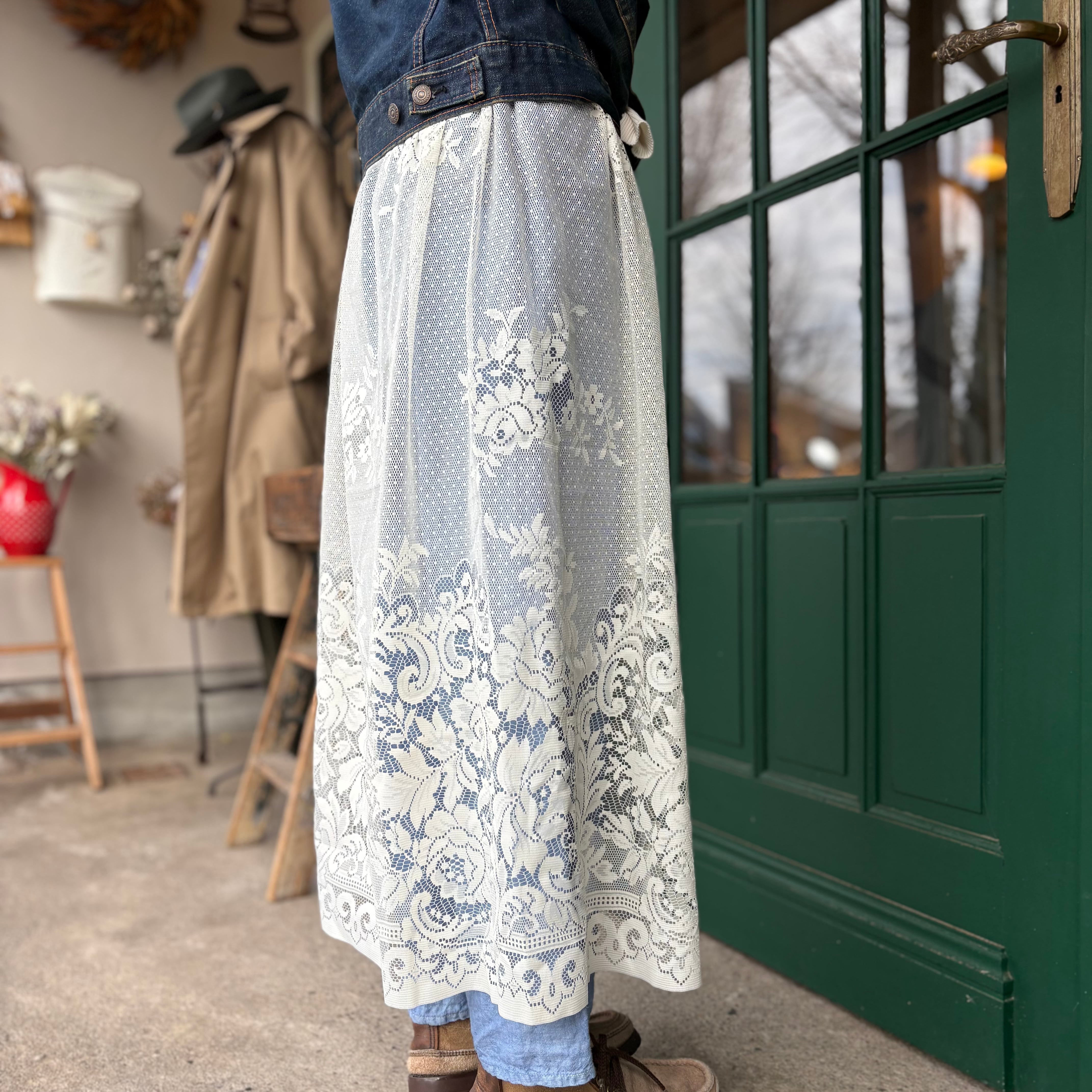素敵なデザインのヴィンテージレースを使用し、手作業で仕立てたエレガントなスカートです。ウエストはゴムとサテンリボンで調整可能。スリット入りで、動きやすく前後のアレンジも自在。甘さを抑えたストレートシルエットで、大人カジュアルスタイルに。ヴィンテージクリームカラーで重ね着にも合わせやすく、色々自分なりにレイヤードが楽しめます。