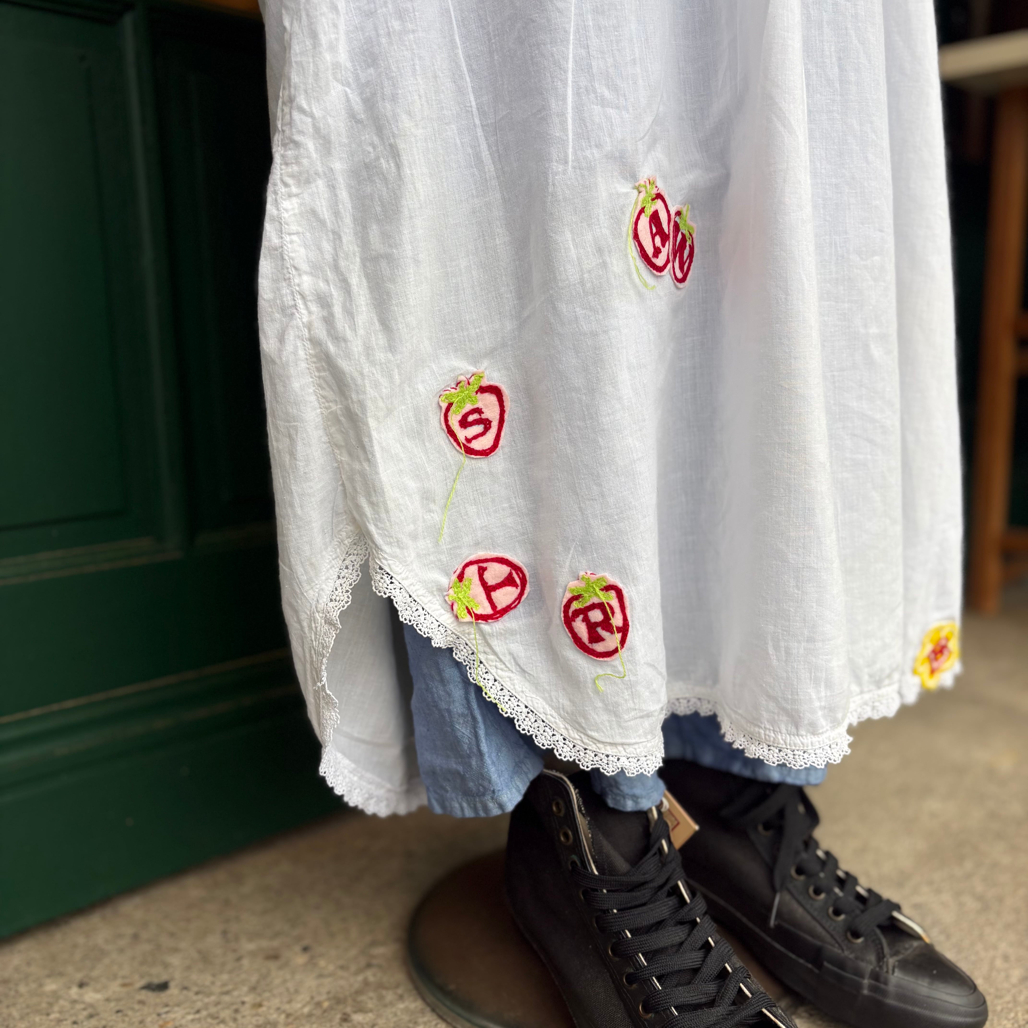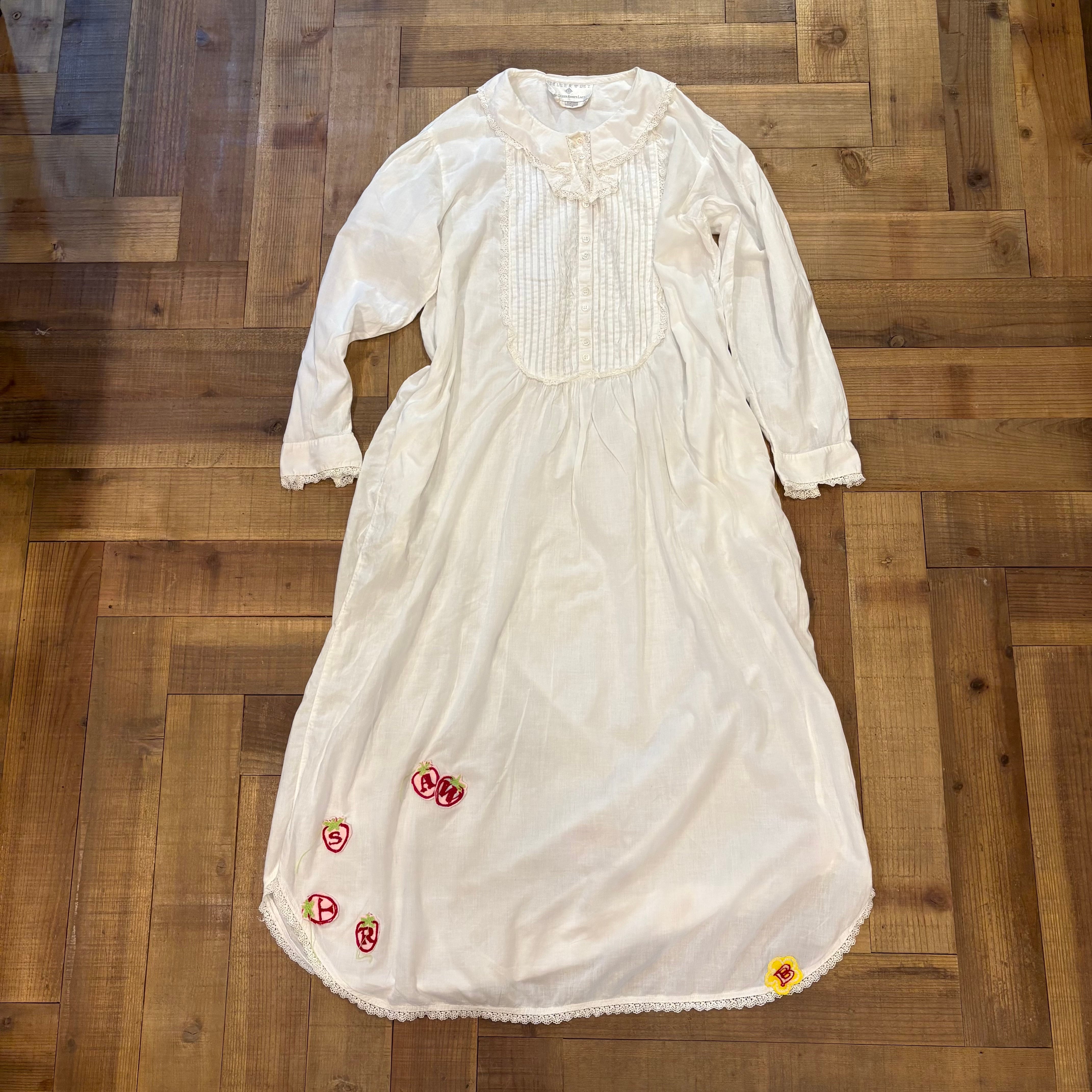 ヴィンテージワンピースにいちごのワッペン刺繍を散りばめました。ヴィンテージの雰囲気が出ている襟元のデザイン。胸元には丁寧なピンタックとレースを施し、上品さをプラス。フロントはボタン仕様で前開きになっており、着脱もスムーズです。いちごにはアルファベットが入り、つなげると「STRAWBERRY」に。楽しさを感じられる大人のいちごワンピースです。全体的にふわっとしたデザインですが、ウエストにベルトを合わせてメリハリもつけれます。薄手のコットン素材で透け感あり。重ね着コーデにおすすめです。