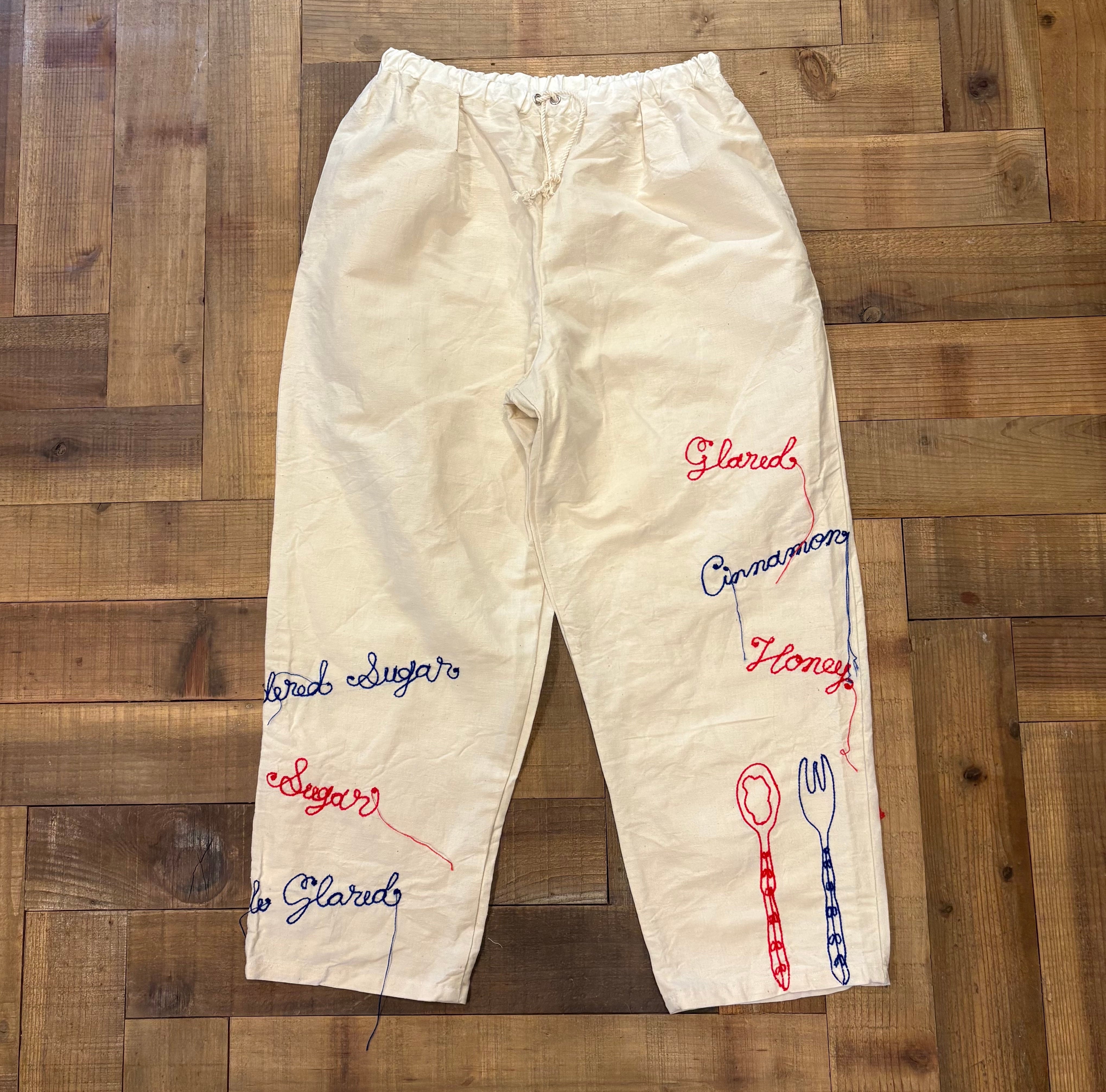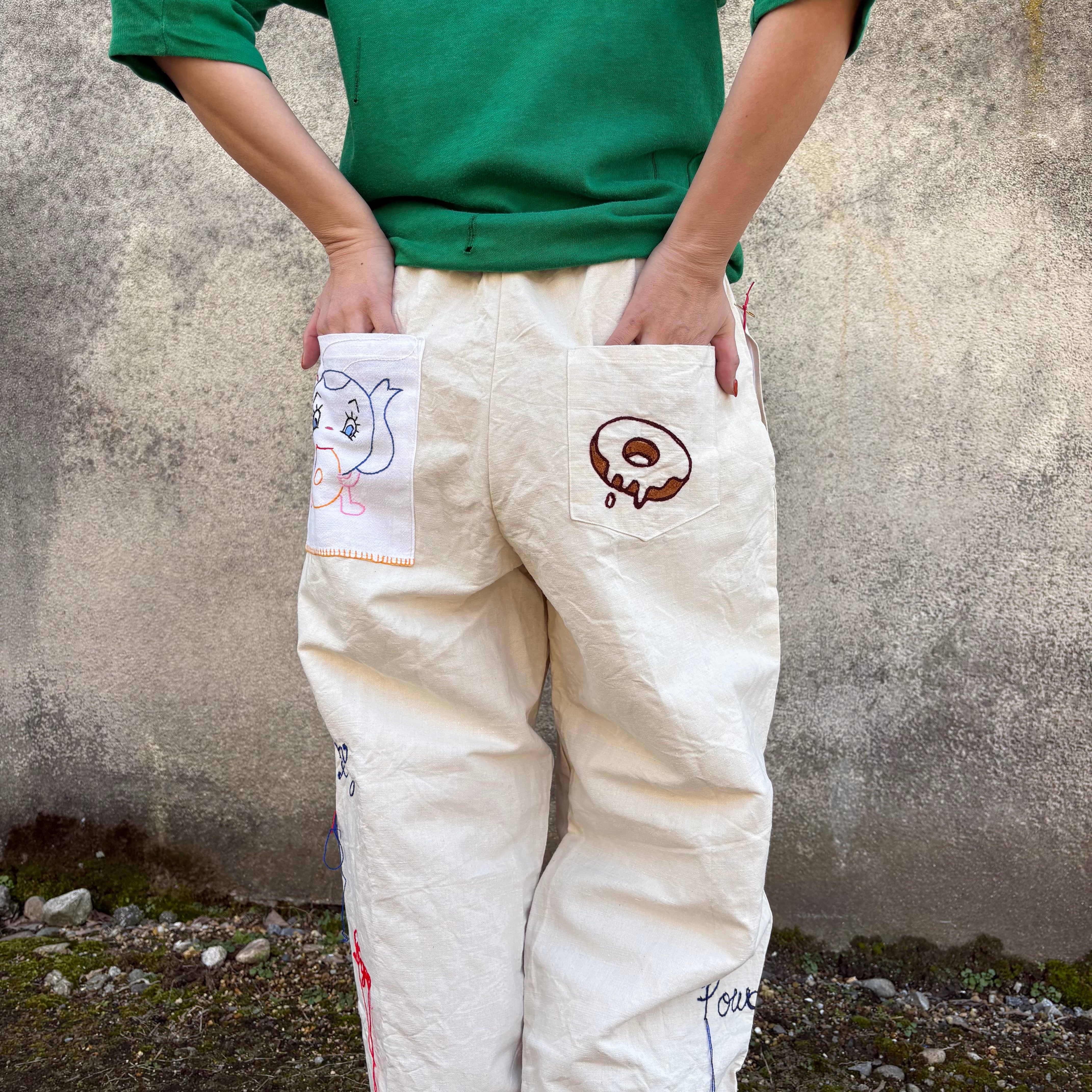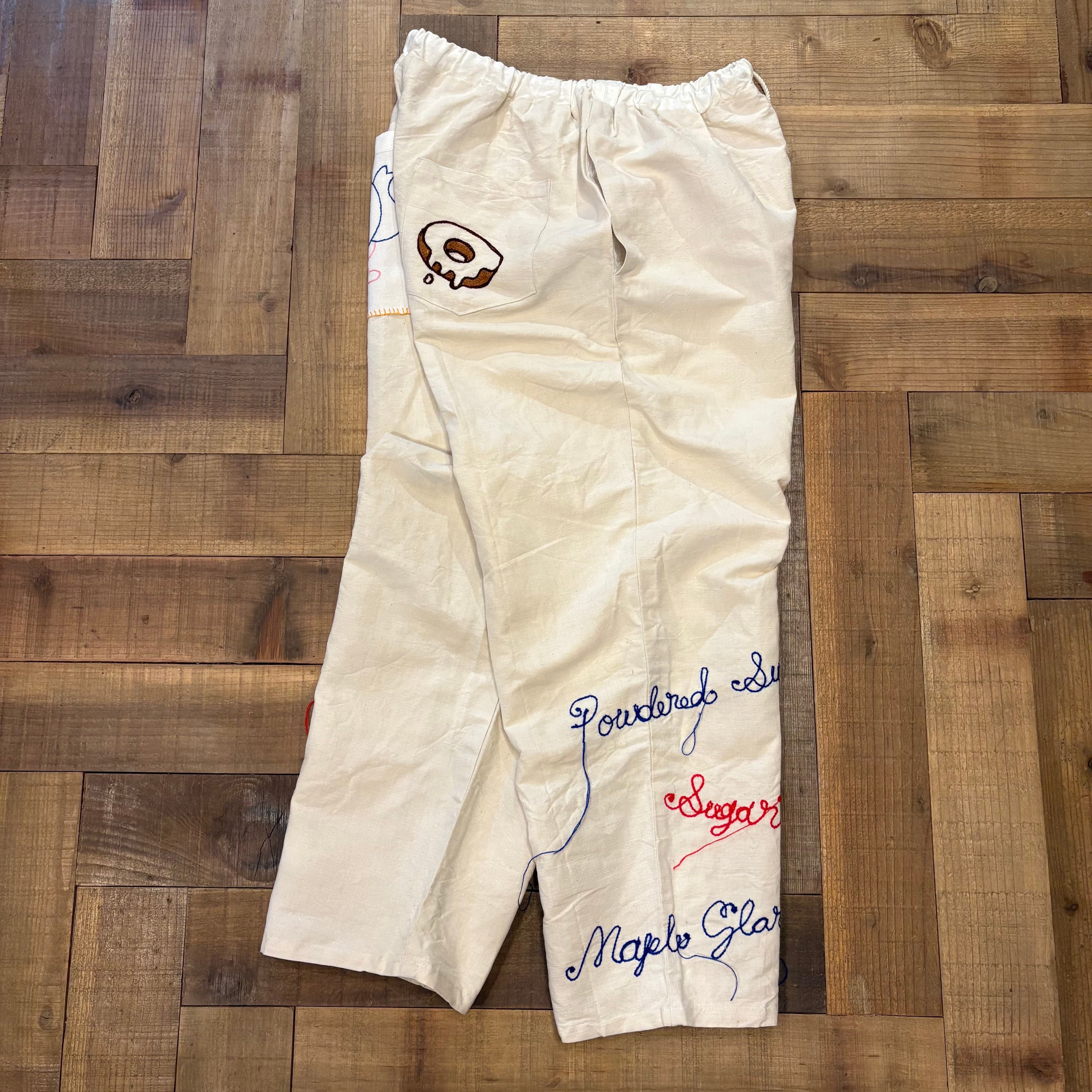 アンティークフレンチリネンを使用し、仕立てたワイドシェフパンツ。今回は、ドーナツをテーマにフレーバーの刺繍を施しました。赤とネイビーの糸でどこか懐かしいアメリカンダイナーの雰囲気に。フロントの裾にはスプーンとフォーク。さらに、バックポケットにはドーナツを頬張るポットさんと、とろりとしたリアルドーナツの刺繍を。両サイドにもポケット付き。