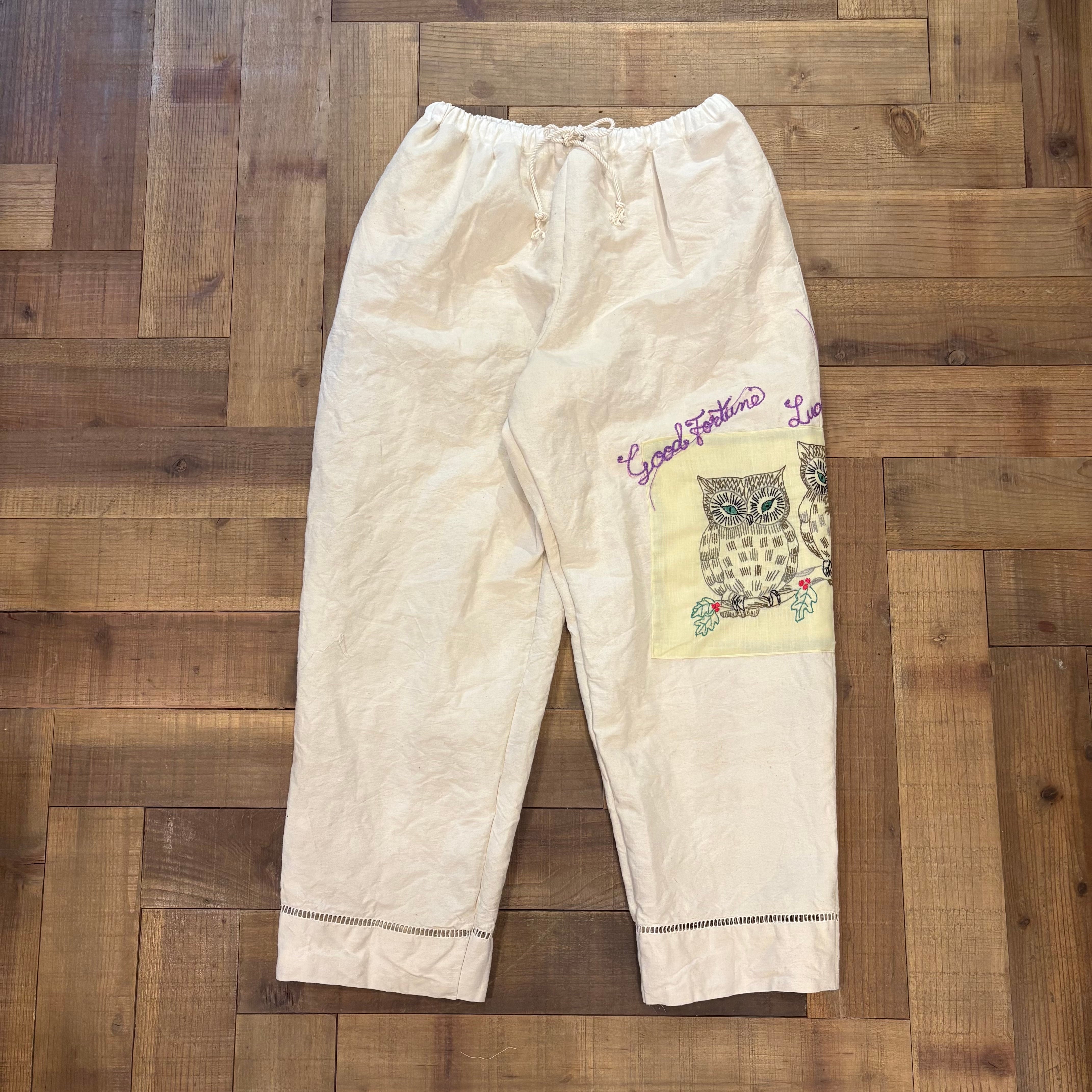 アンティークフランスリネンを使用し仕立てたワイドシェフパンツ。しっかりとしたリネンで透け感はありません。サイドには、愛らしいフクロウの刺繍。ステッチしたワードには ”Good fortune & Lucky owl" 幸運を運ぶお守りのようなメッセージ刺繍。裾にはさりげなくアイレットレースがあしらわれています。バックポケットには、月と星の刺繍を施しました。両サイドには便利なポケットも付いており、ウエストはゴムとドローコード仕様でサイズ調整が可能。ゆったりしたシルエットとの相まって、リラックスしたスタイルを楽しむことができます。