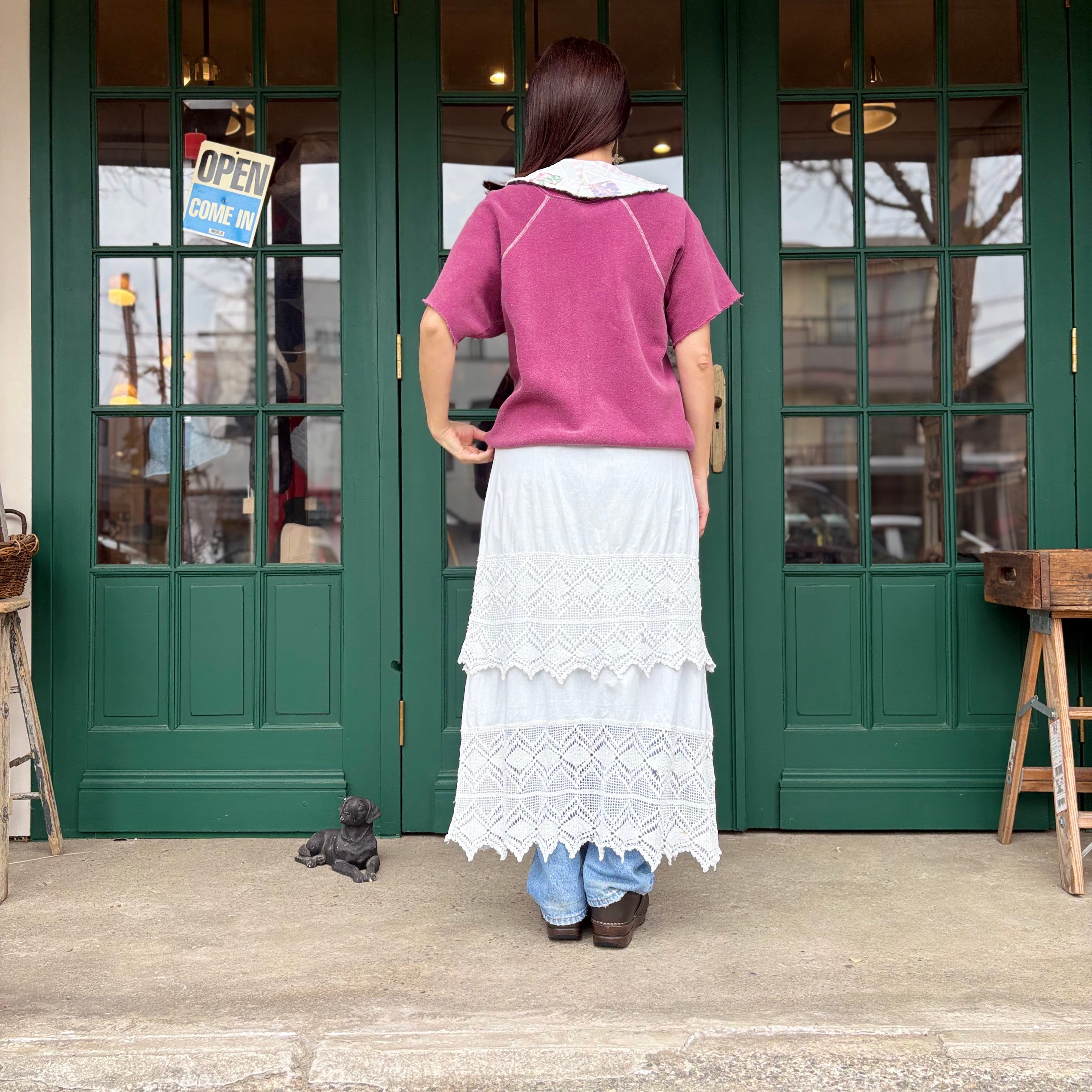 贅沢なレース使いと段になったティアードデザインが特徴のヴィンテージのペチコートです。透け感がないため、1枚でサラッと着用でき、さらりとしたコットンの肌触りが心地よいです。すっきりとしたタイトなラインが美しいシルエットを演出しており、さらに繊細なレースがヴィンテージ感を増しています。重ね着のレイヤードも楽しめる1枚です。