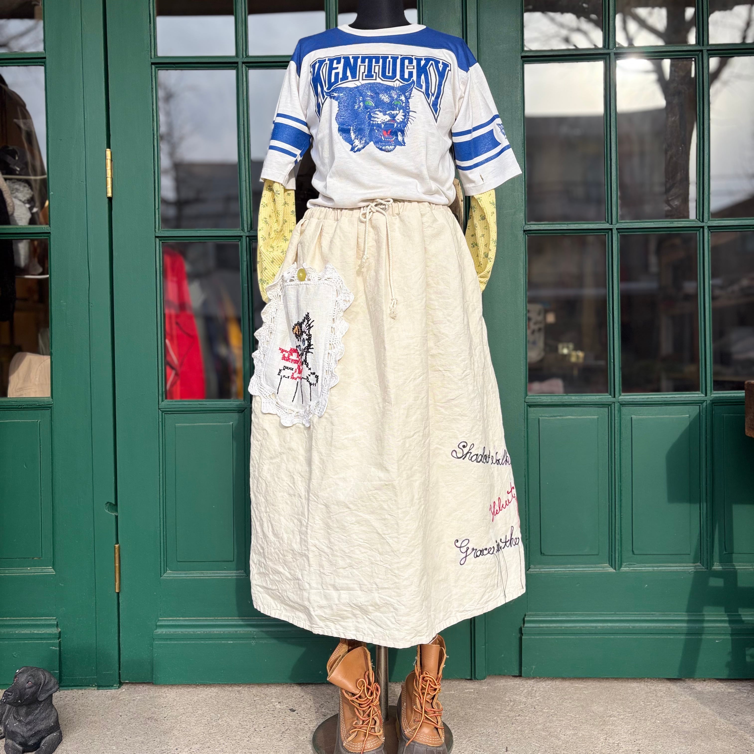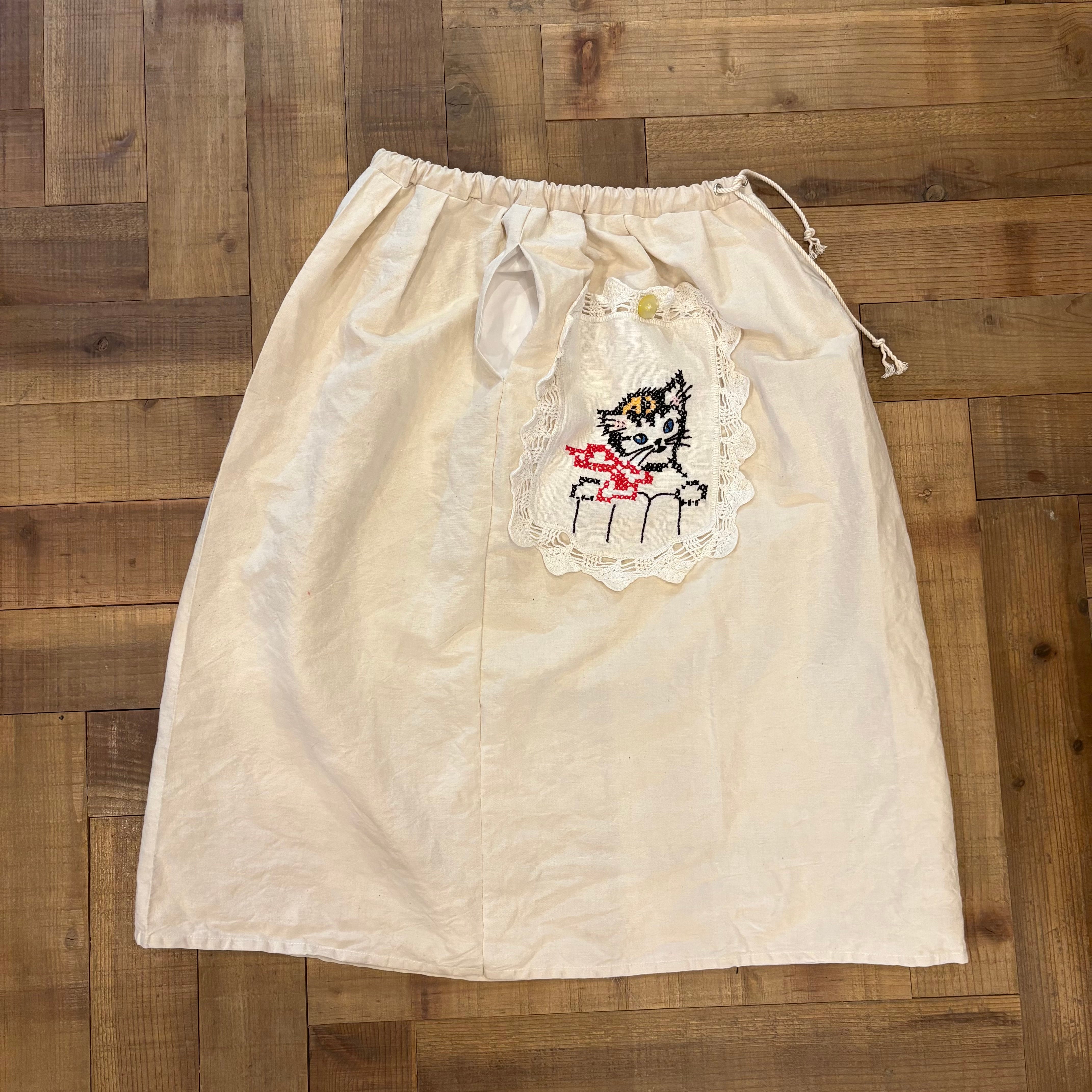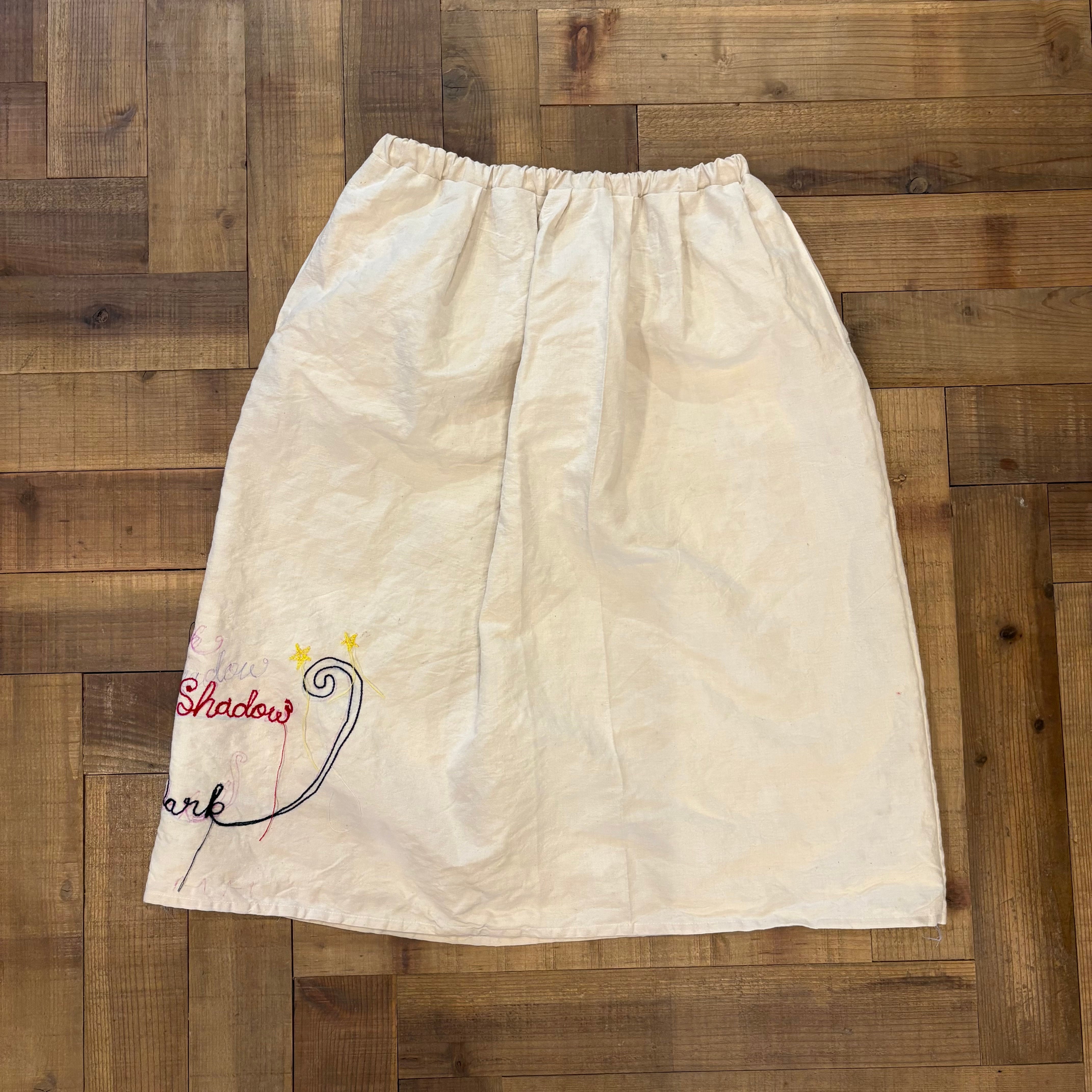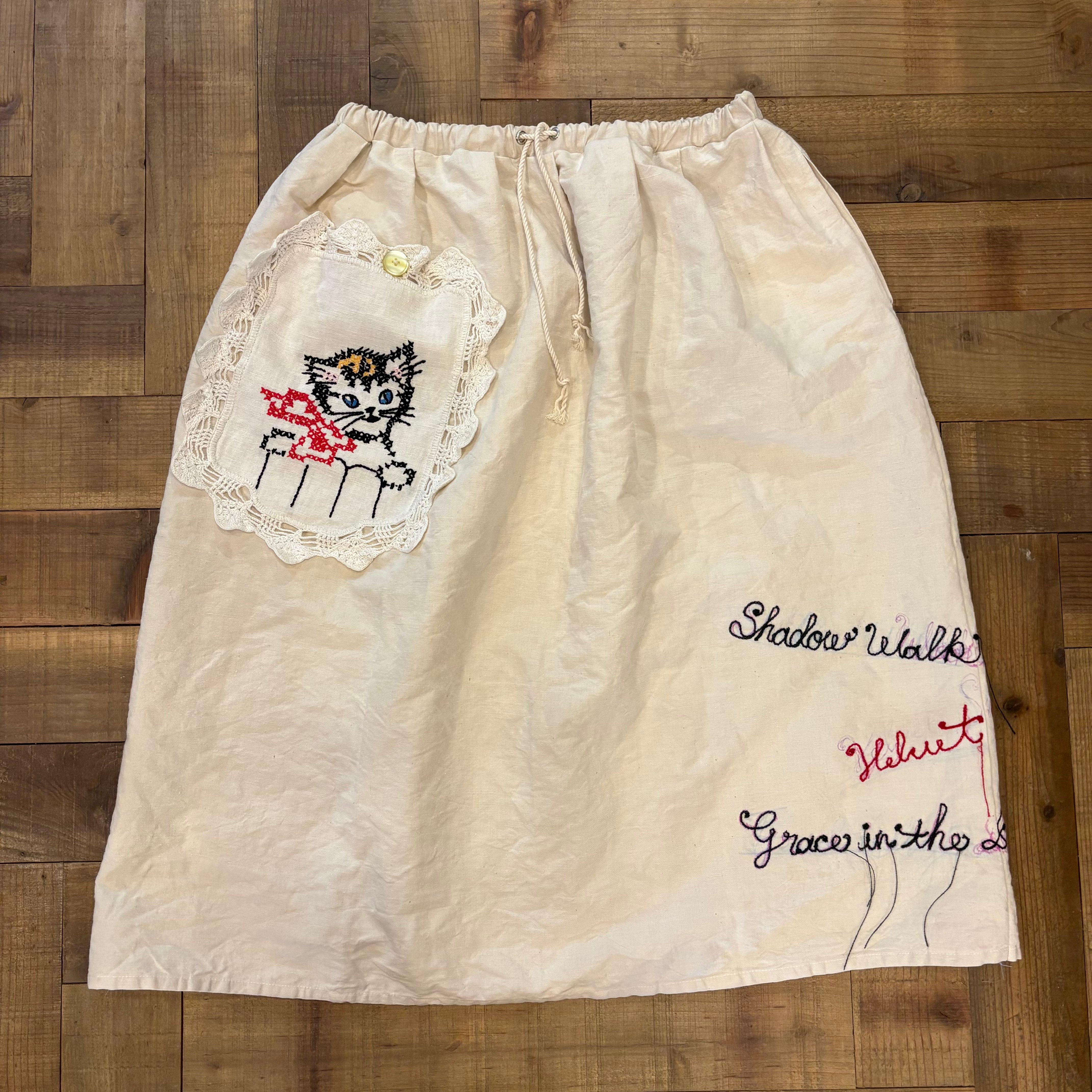 フレンチの上質なリネンを使用し、仕立てたギャザースカートです。しっかりとした生地感ながら透け感はなく、安心して着用できる1枚です。サイドポケットにはかわいらしい猫の刺繍を施したレースクロスをあしらい、さらに、裾にはメッセージ刺繍と黒猫の尻尾。影の中にも美しさがある。そんなミステリアスな黒猫(芯のある女性)をイメージしました。ウエストは、ゴムとコードを使用し調整可能に。両サイドポケット付き。