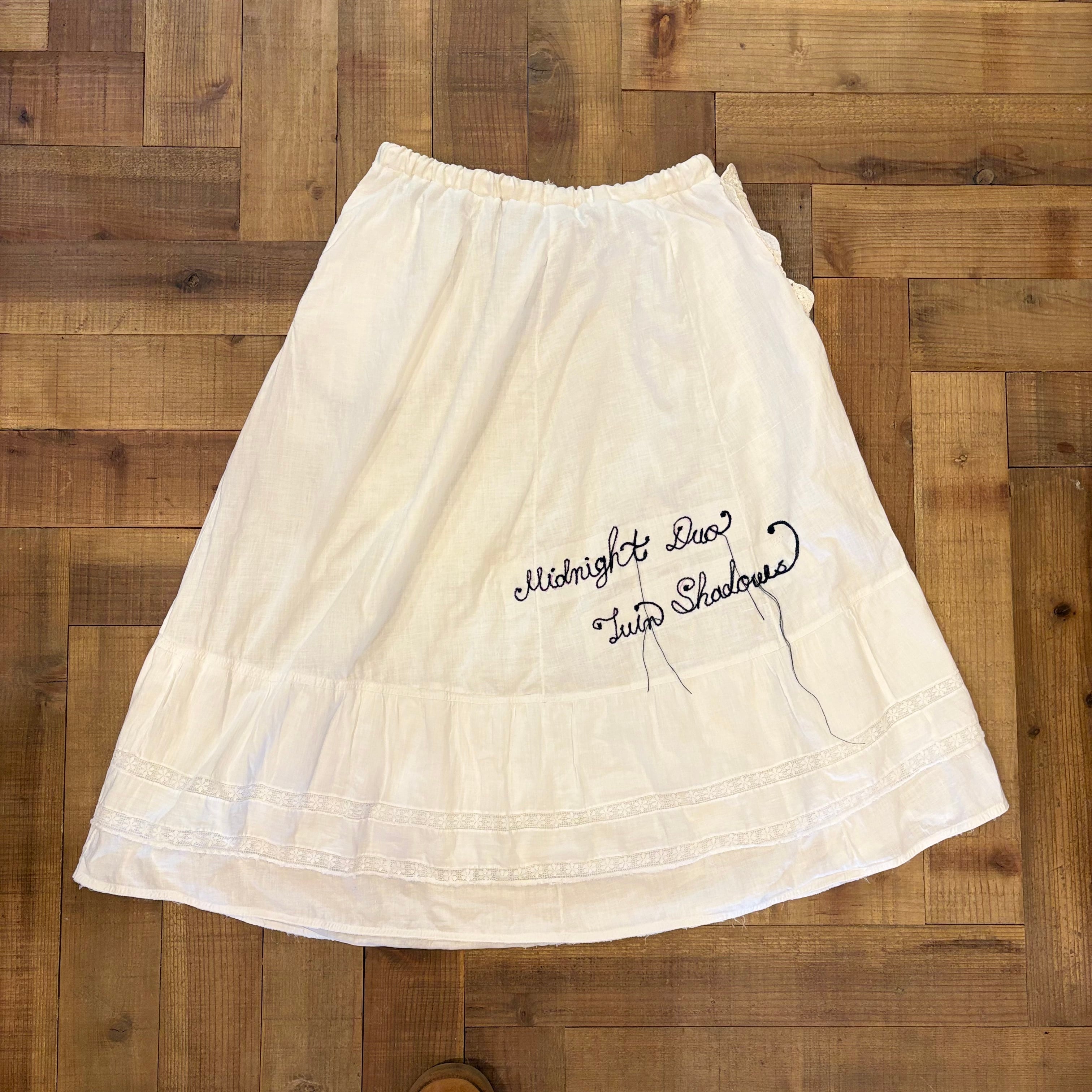 ヴィンテージのペティコートをベースに、仕立てた猫刺繍スカート。両サイドには愛らしい猫のクロスステッチ刺繍が施されたポケットをあしらい、さらにバックにはメッセージ刺繍を。