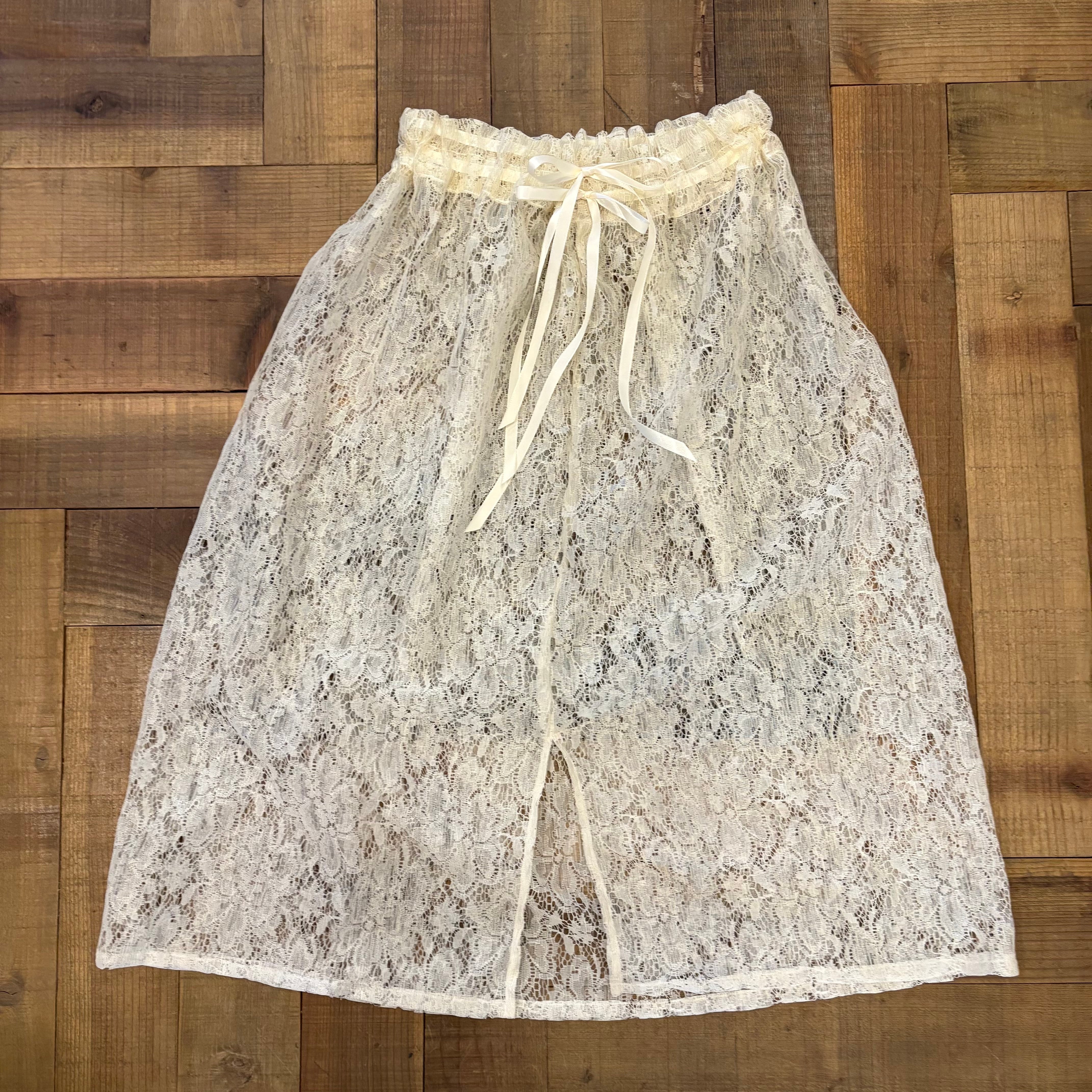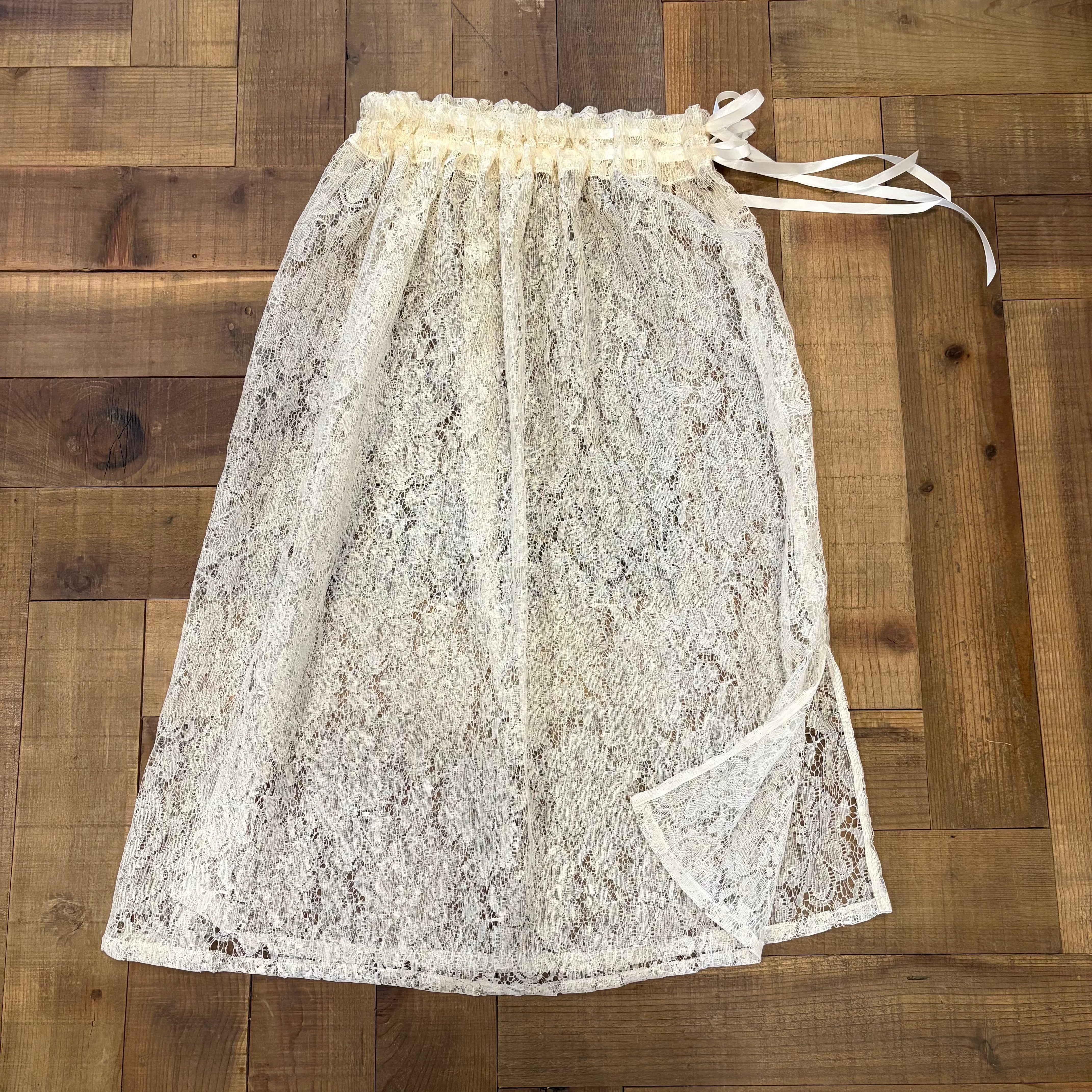 素敵な総柄のヴィンテージレースを使用し、仕立てたレーススカートです。ボリュームを抑えたタイトめなシルエットが、大人っぽい雰囲気を醸し出します。ウエストには、サテンリボンを用いた2段デザインで、リボンアレンジを楽しむことも可能。