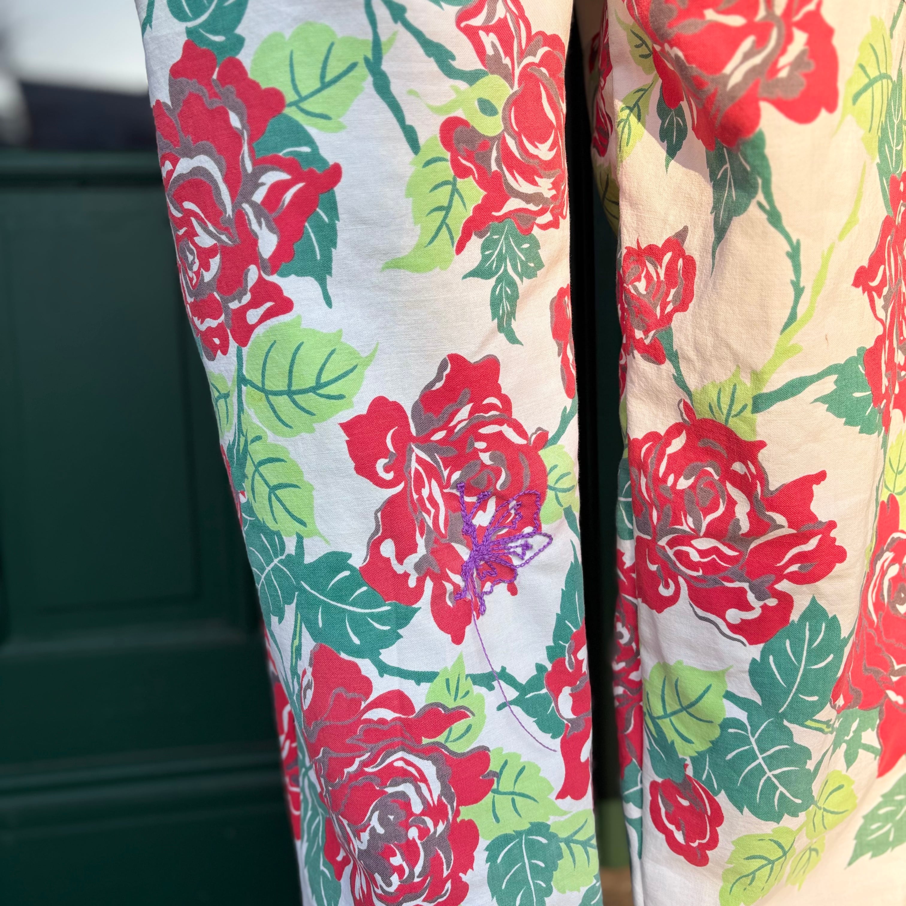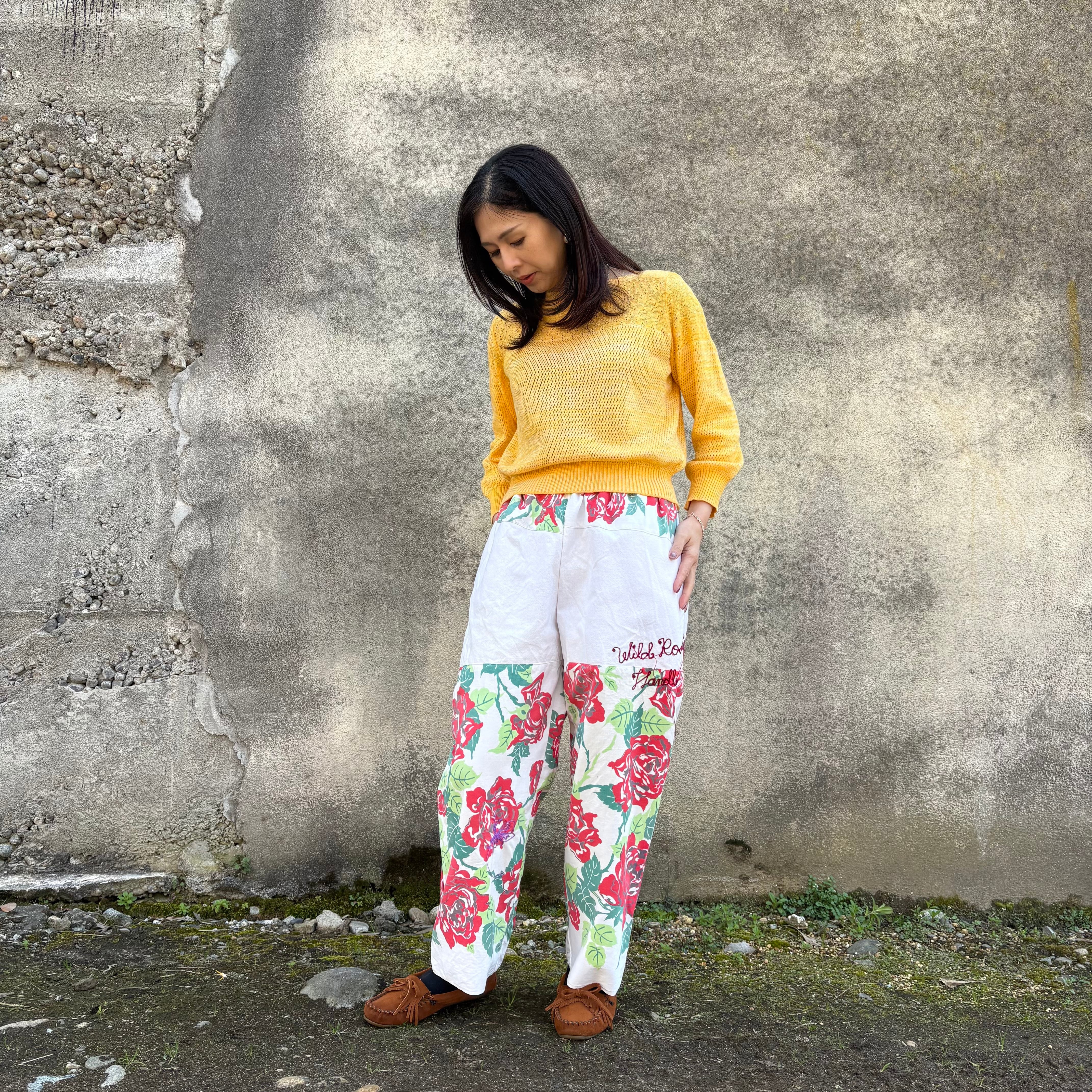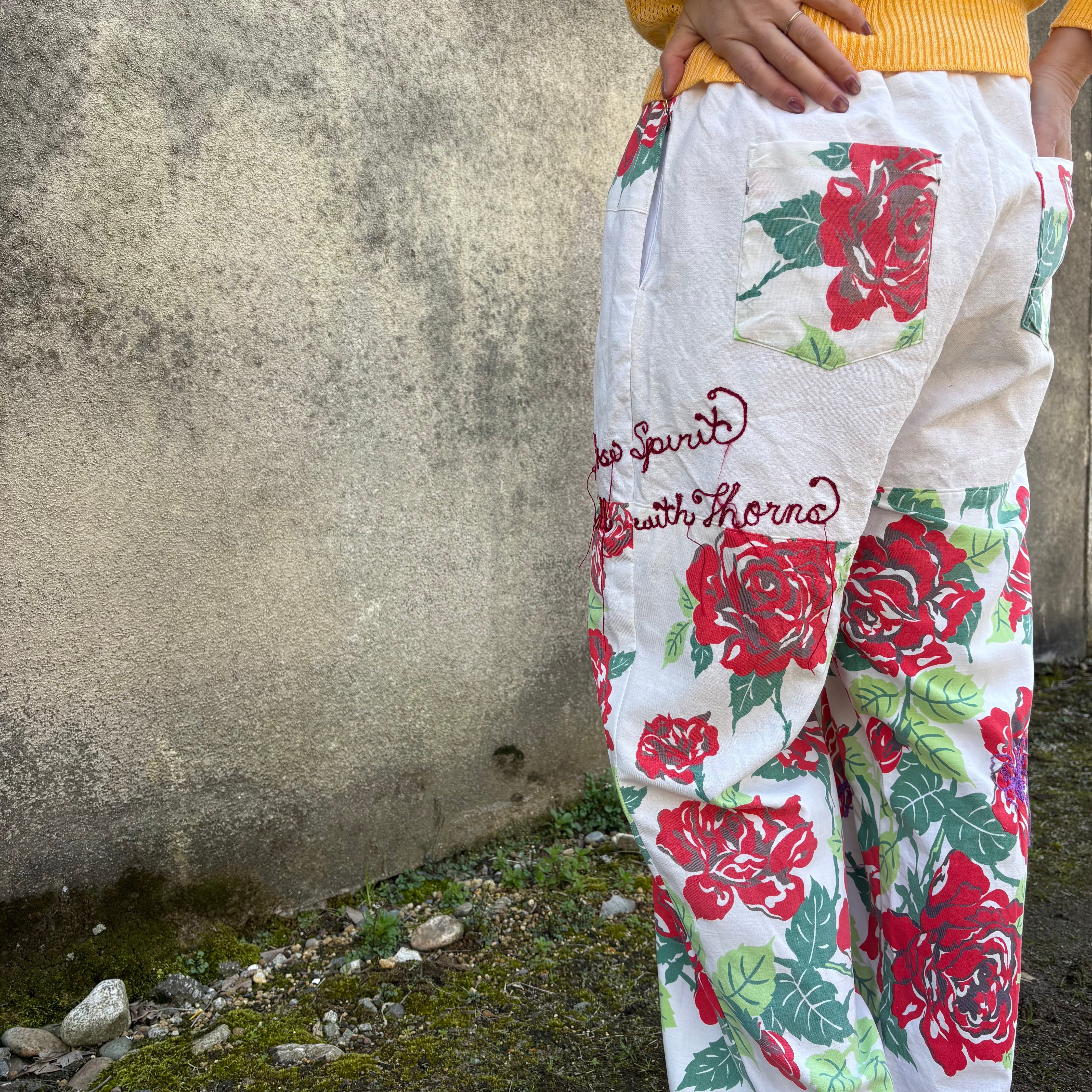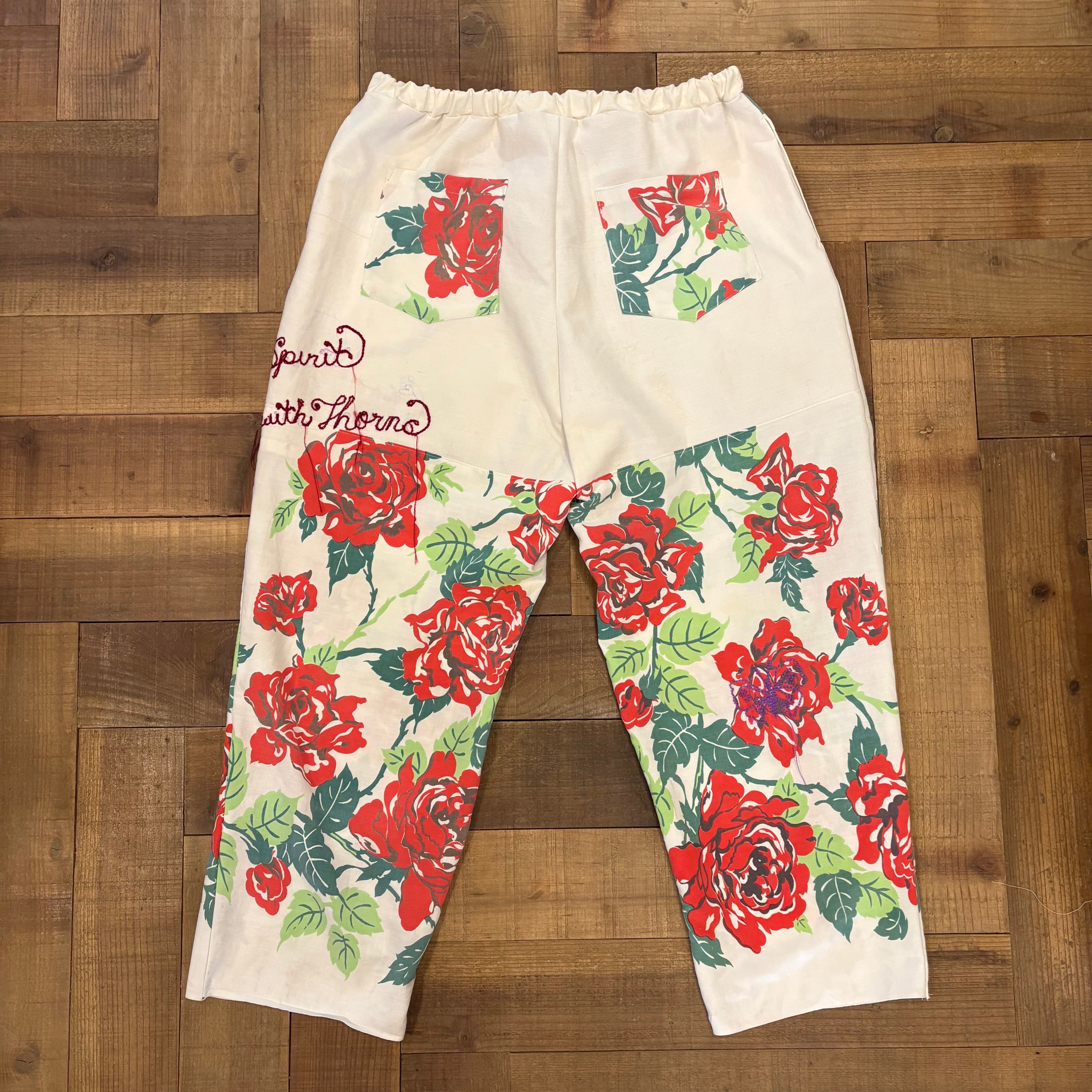ヴィンテージの薔薇柄クロスを使用し、仕立てたワイドパンツです。優れたリネンを切り替えで使用しているため、ピップから上の部分は透けません。気にすることなく安心して着用することができます。左サイドにはメッセージ刺繍を施しました。"Wild Rose Spirit" 芯のある美しさ ”Handle with Spirit" 美しいほど繊細で簡単には触れられない。