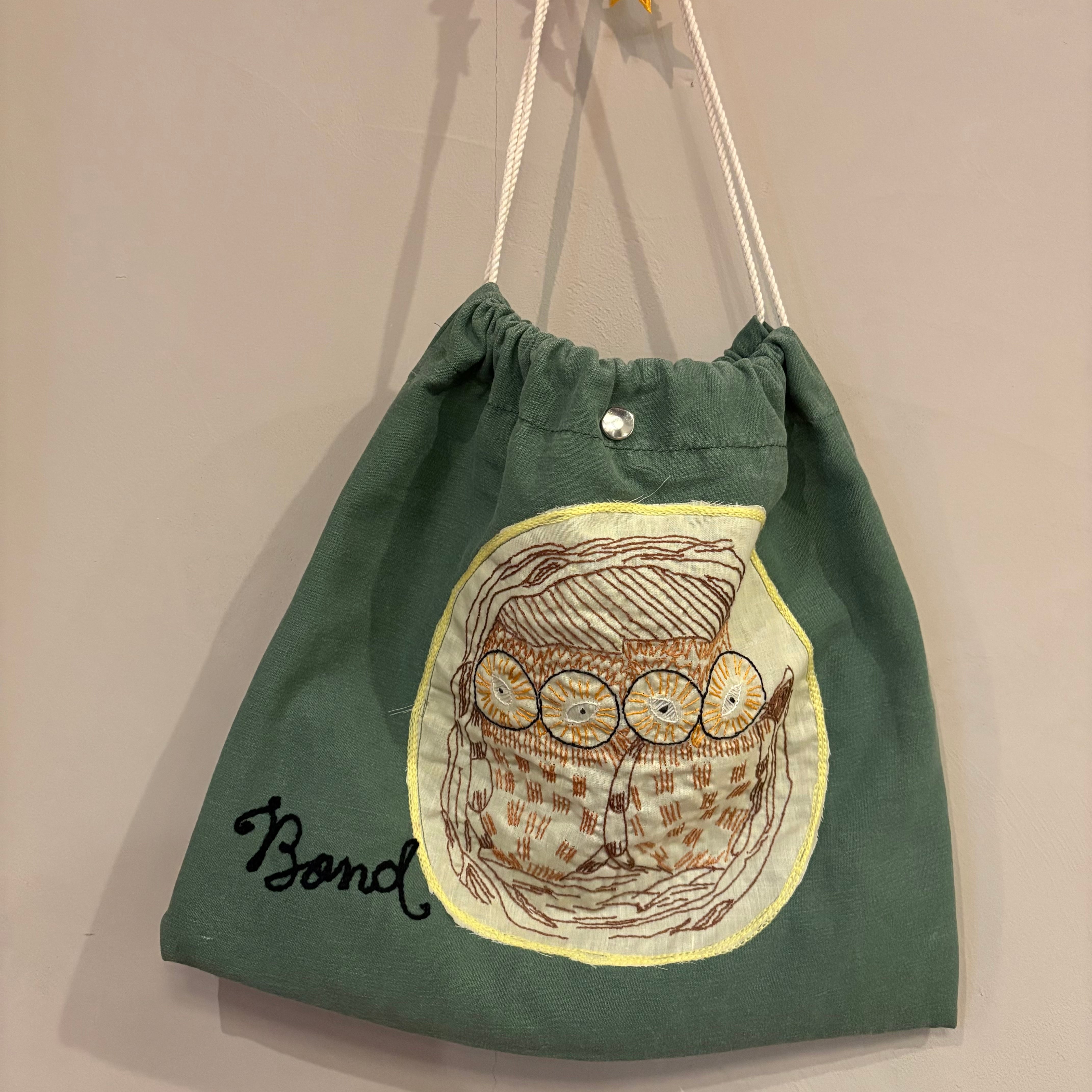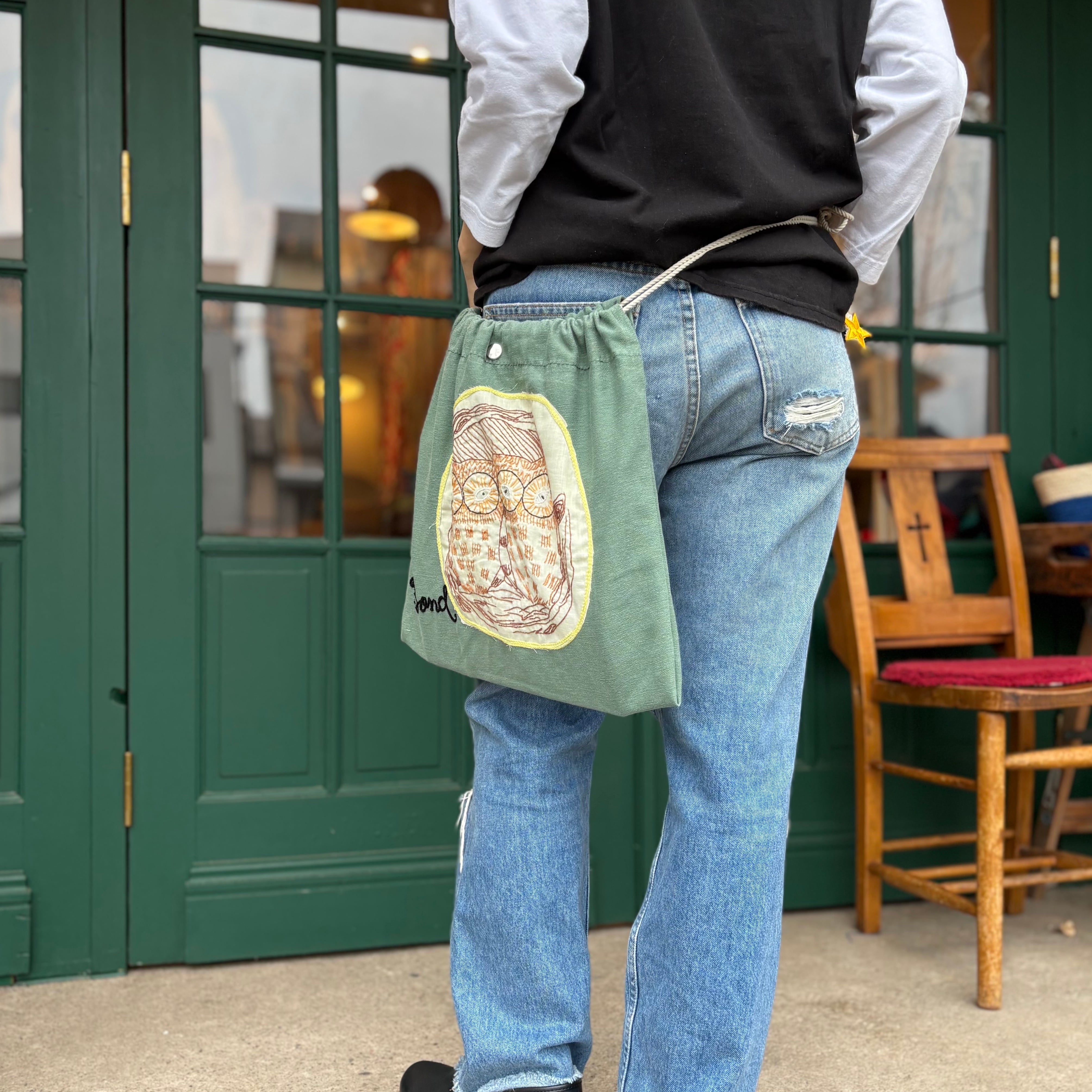 ミリタリーバッグをベースにリメイクで仕立てた巾着バッグです。フロントにはピタリ寄り添う2匹のフクロウの刺繍が施されており、そこには「Bond」絆を意味する刺繍を入れました。さらに、バッグ全体には星の刺繍と古き魂を意味するメッセージ刺繍デザインを入れました。紐の先端には、さりげなく星のチャームを。用途に合わせて、ショルダー、ハンドバッグ、ウエストポーチにとアレンジできます。持っているだけで気分が上がる巾着です。