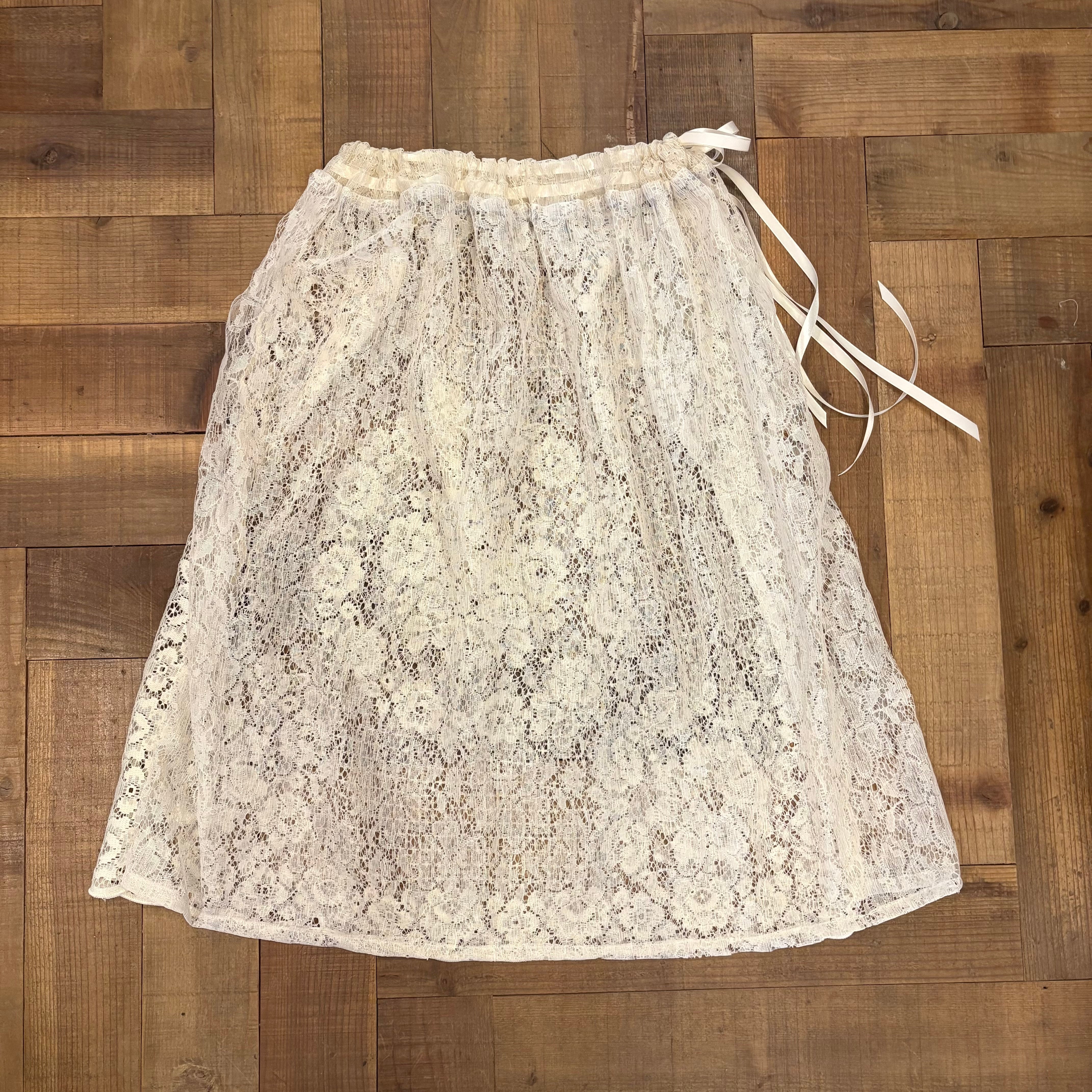 70年代のヴィンテージレースを使用し、贅沢に仕立てた特別なレーススカートです。前後で異なるレース柄を組み合わせ、個性的なデザインを実現しました。羽織るように着こなせるポンチョ風のスリットが多めに施されており、スタイリングの幅が広がります。ウエストは、サテンリボンをダブルで使用しており、サイズ調整可能に。ストンと落ちる大人のシルエットデザイン。レイヤーアレンジでさらに魅力が引き立つヴィンテージならではの一着です。