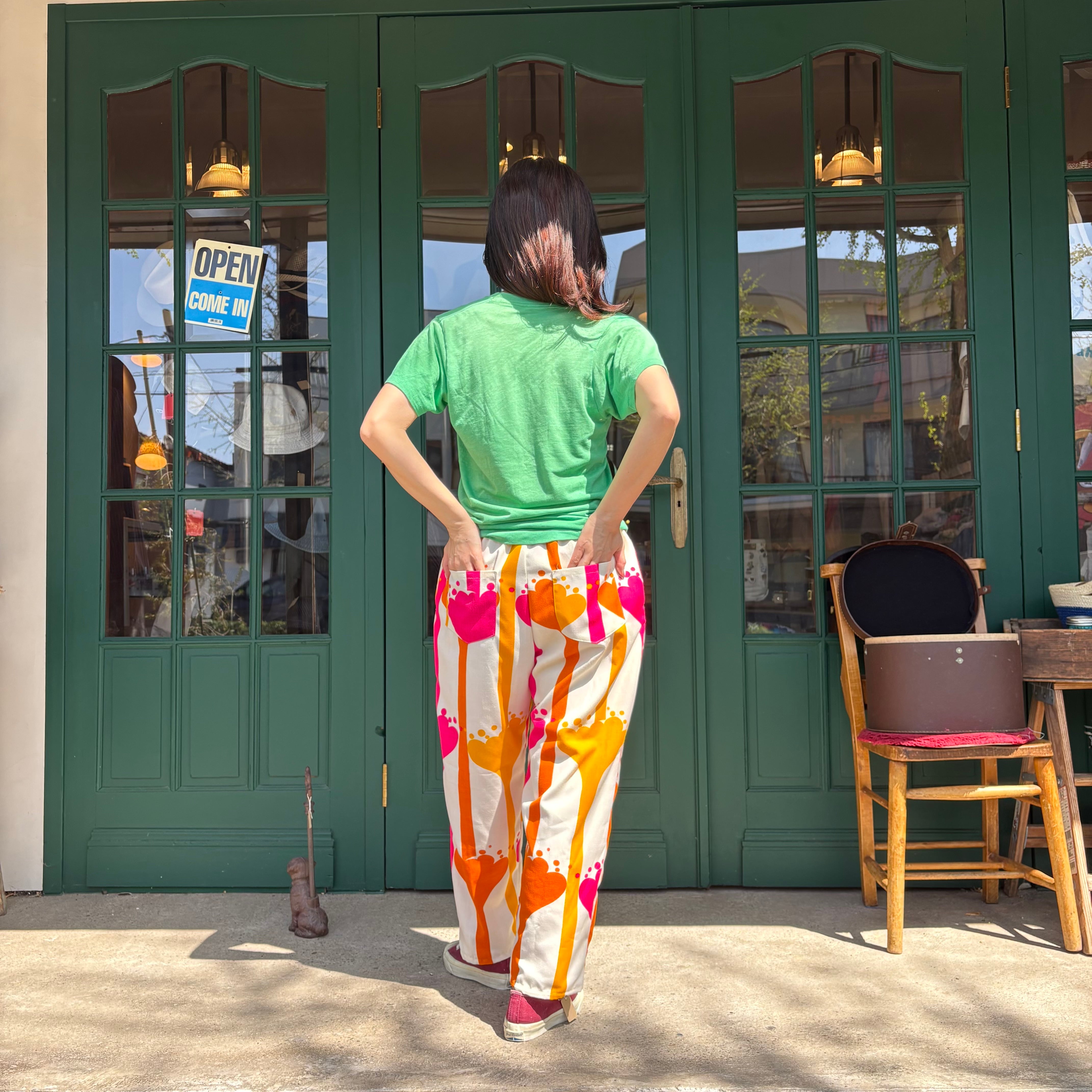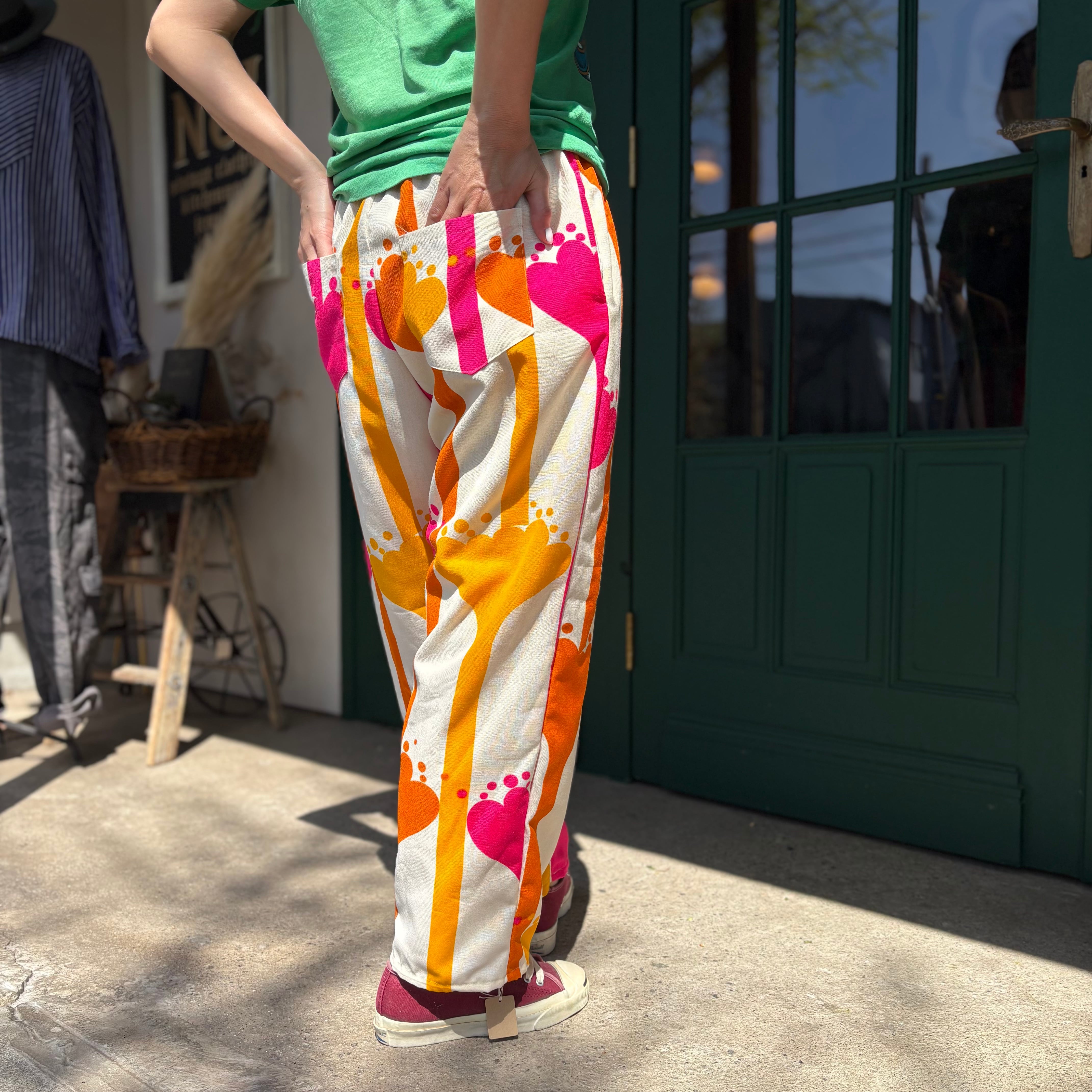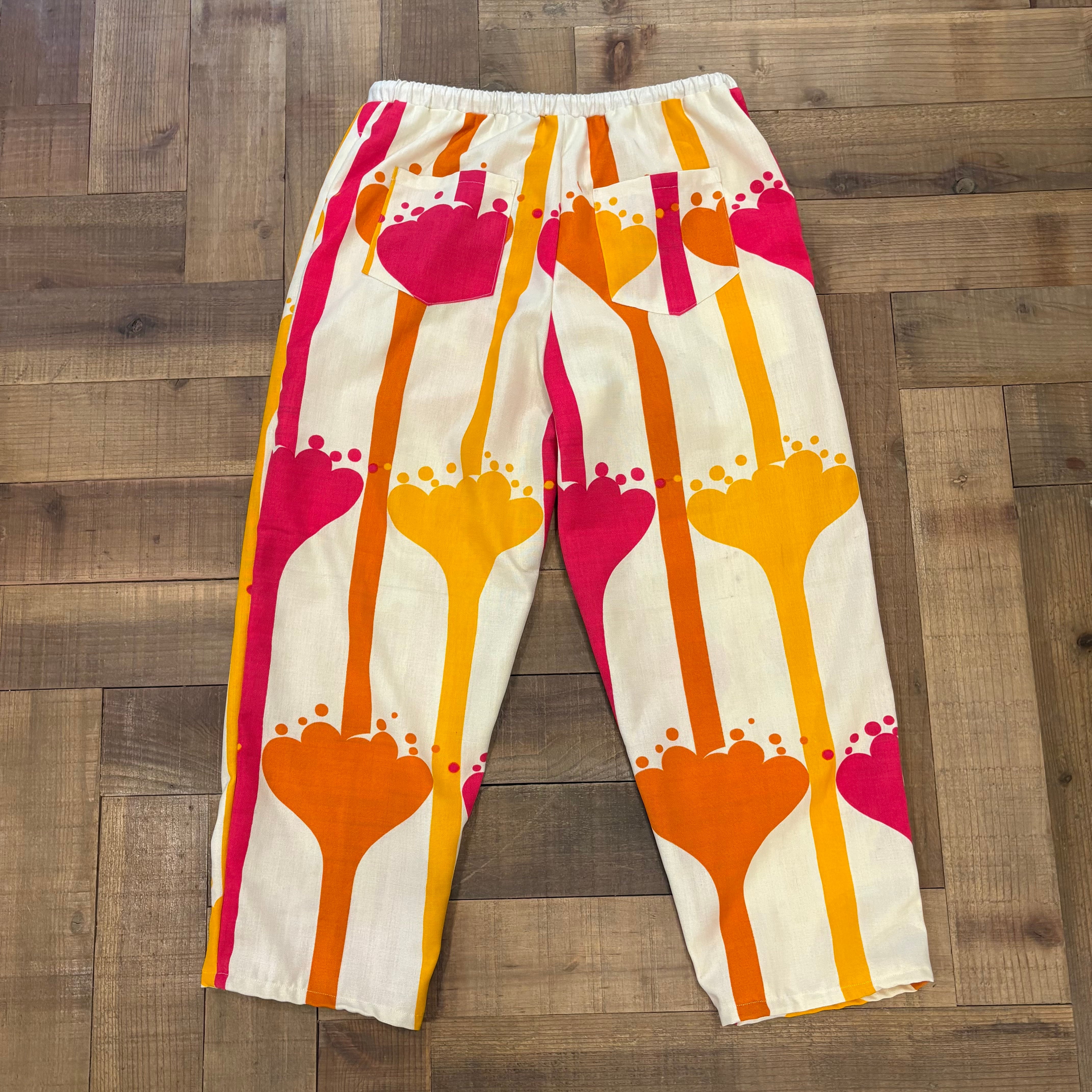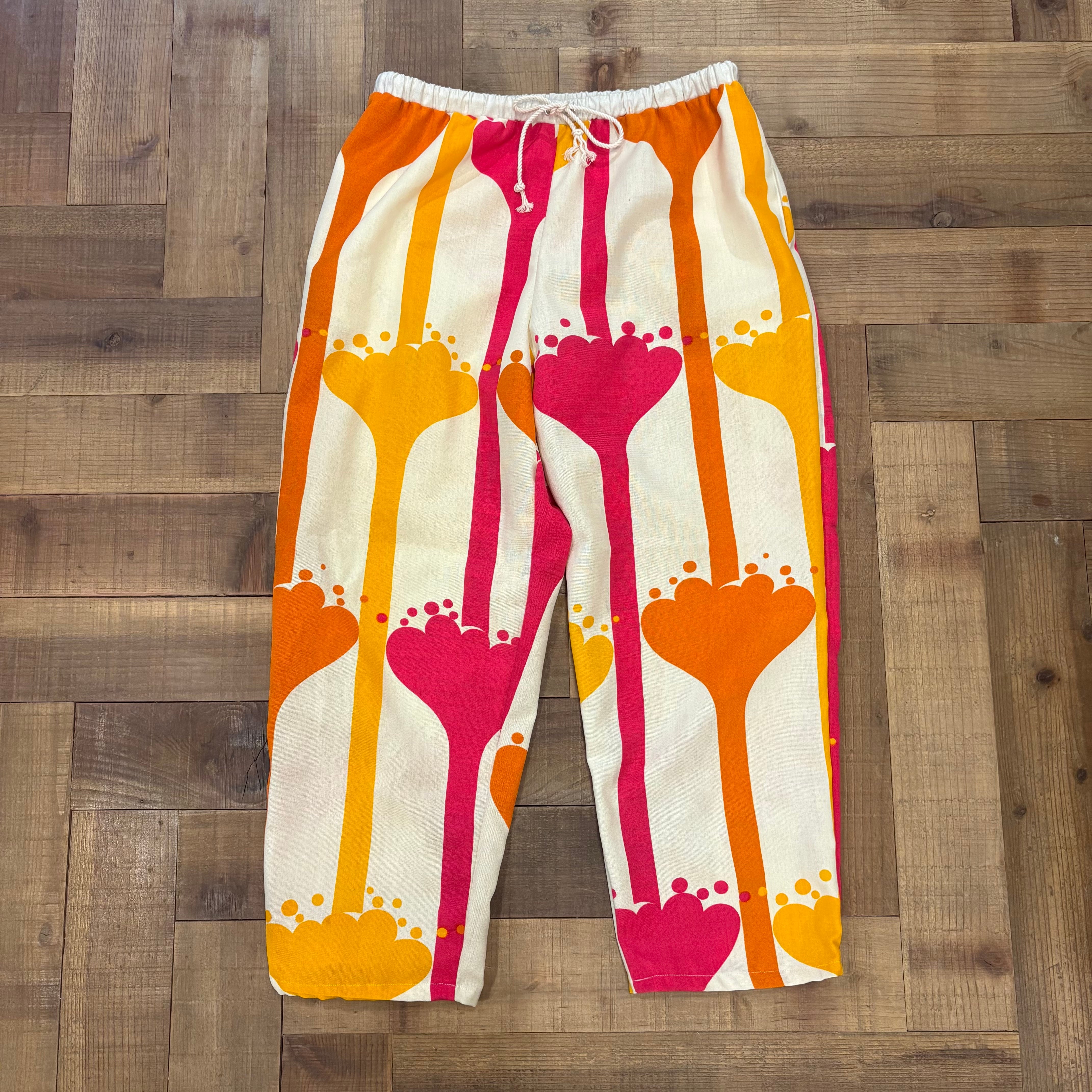 70年代のポップなヴィンテージファブリックを使用し、仕立てた独特なワイドパンツです。ピンクとオレンジのビビットカラーがレトロで、まるでアートのような存在感。ゆったりとしたシルエットで、ウエストはゴムとドローコード仕様になっており、サイズ調整が自在に可能です。両サイドとヒップにポケットを付けました。薄手ながら透け感はなく、軽やかに履いていただけます。お洒落なアイテムです。