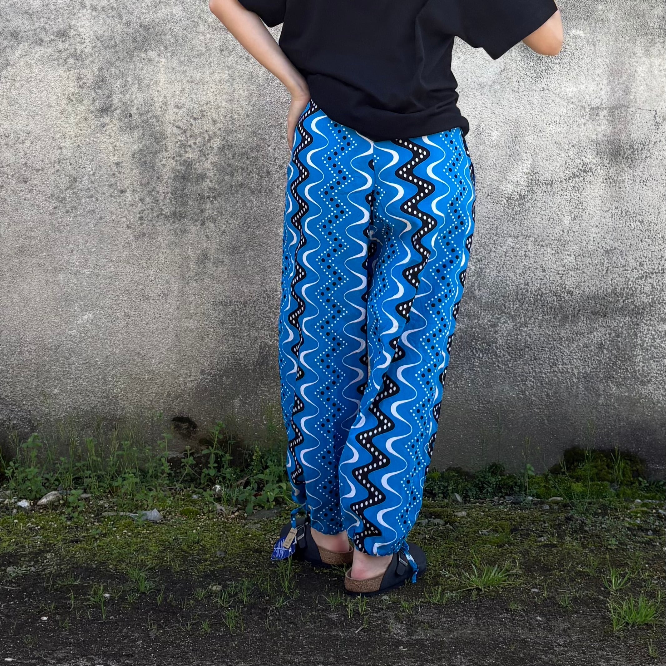 鮮やかな色彩と独特な柄が目を引くアフリカンバティック生地のワイドパンツです。風や海をイメージさせる素敵なデザインは、スタイルに多彩なアクセントを加えてくれます。ゆったりとしたシルエットで快適に着用できるのが魅力です。