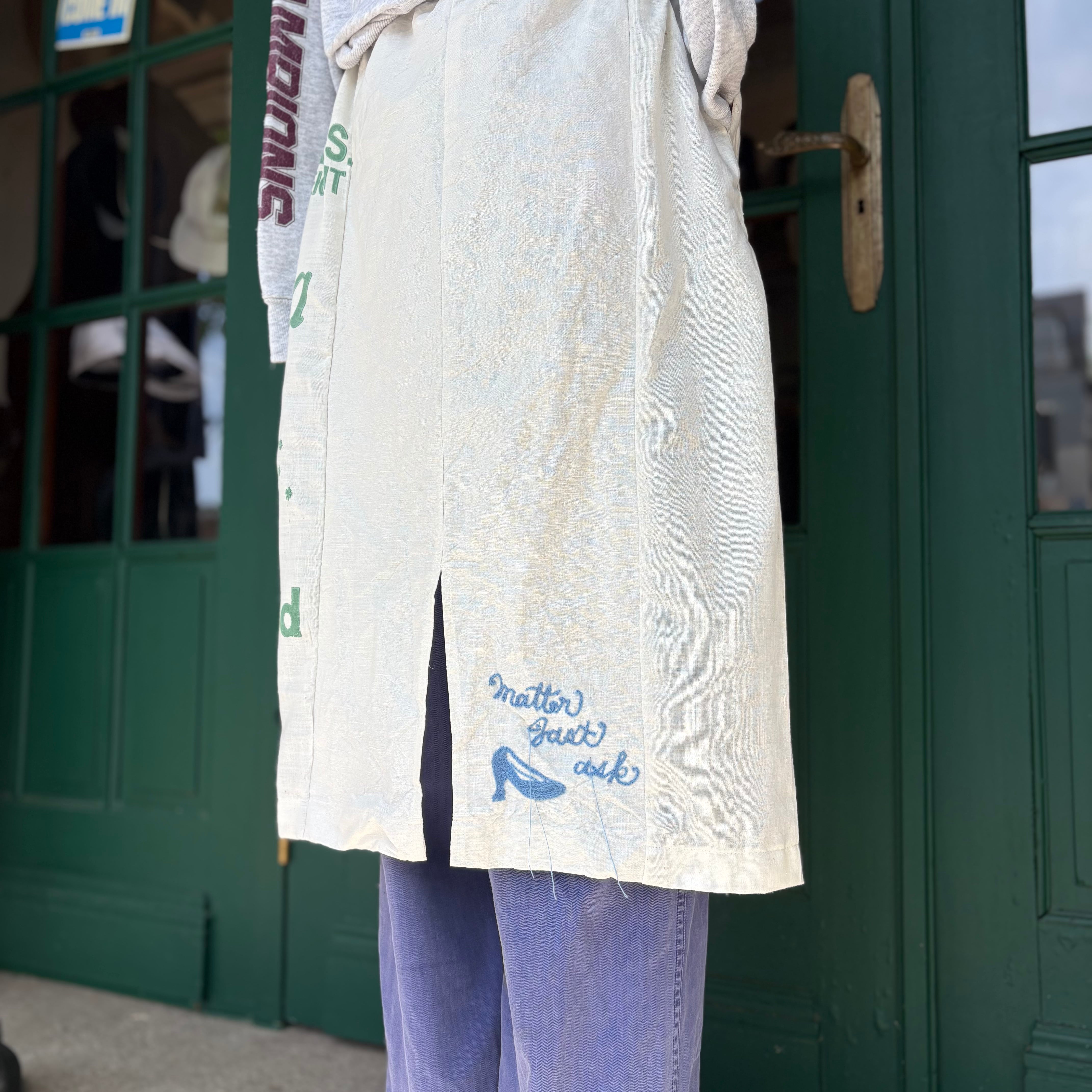 ヴィンテージのフィードサックを使用し仕立てたエプロンスカートです。ヴィンテージのプリントとほんのりと透け感のある生地は、軽やかで動きやすく、パンツやスカートとのレイヤードスタイルを楽しむことができます。後ろ側にはリネンの生地を張り合わせており、透けません。左手にポケットを付けました。