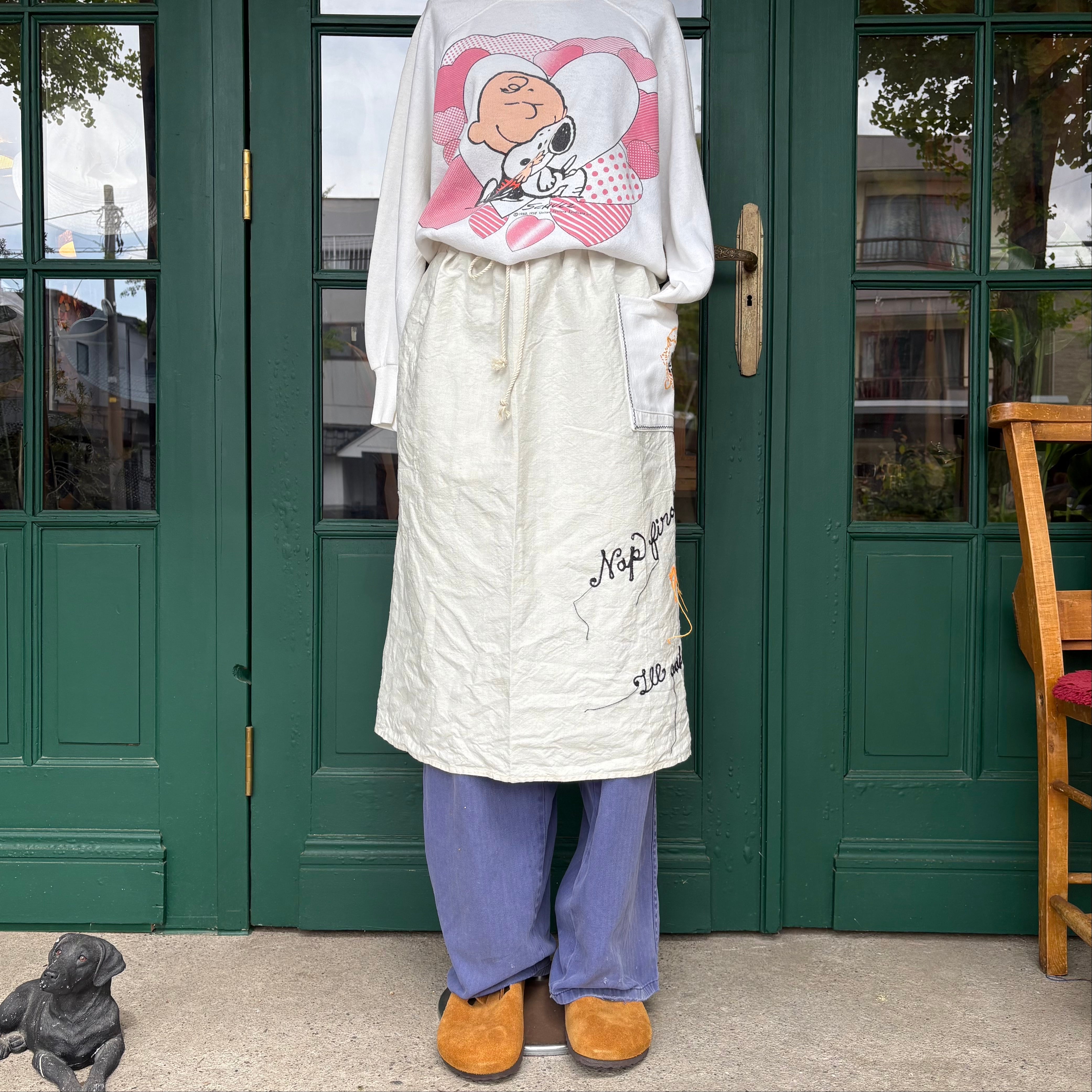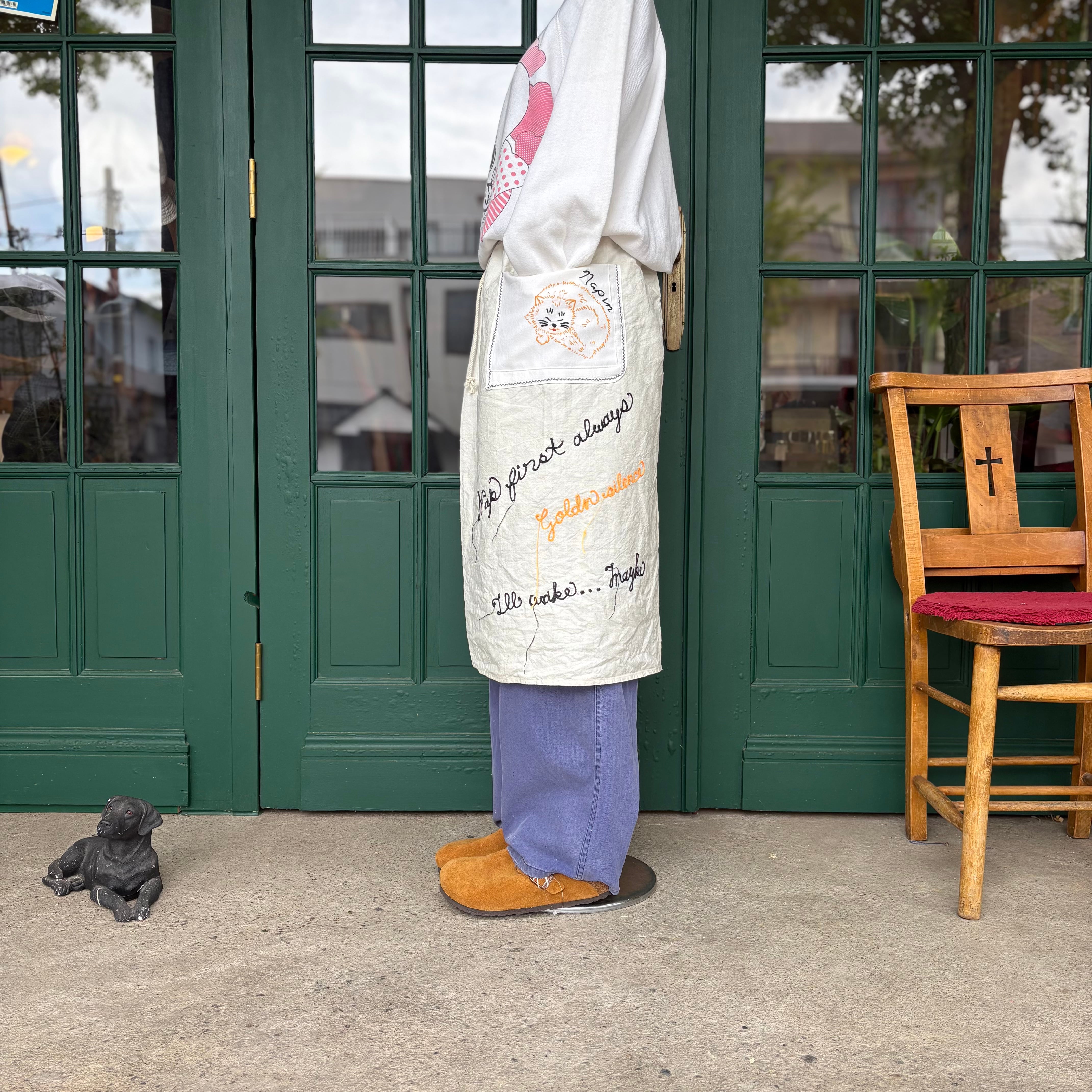 ヴィンテージの猫刺繍クロスをポケットに仕立てた、エプロンスカートです。アンティークフレンチリネンを使用し、透け感のない軽やかな生地で、心地よい着心地。スッキリとしたストレートシルエットが特徴で、どんなスタイルにも合わせやすい一着です。