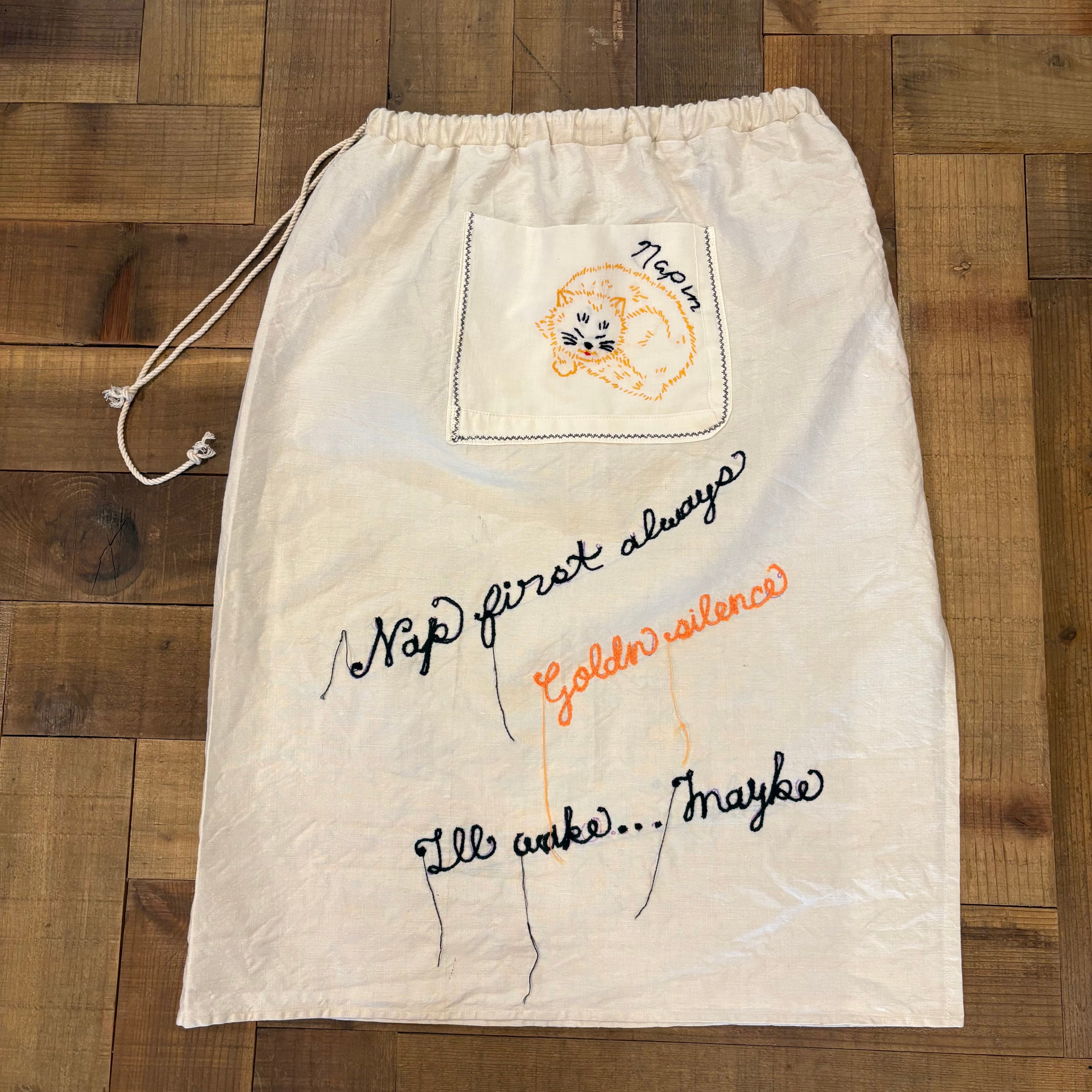 フロントには眠たげな猫の刺繍寄り添うように ”Nap First always" "Golden...." "I'll wake...."