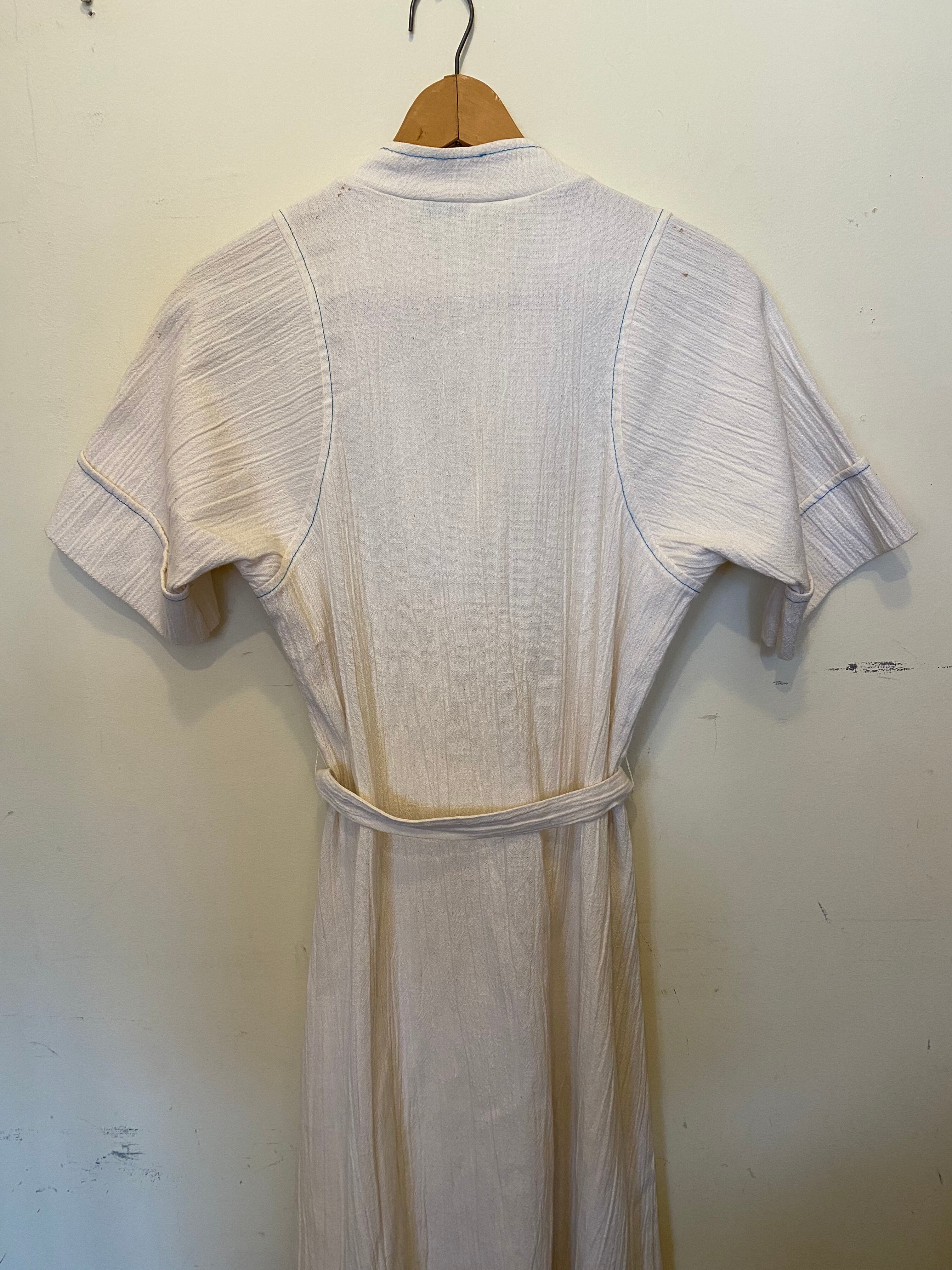 シワ加工のガーゼ素材、襟元はバンドカラー。