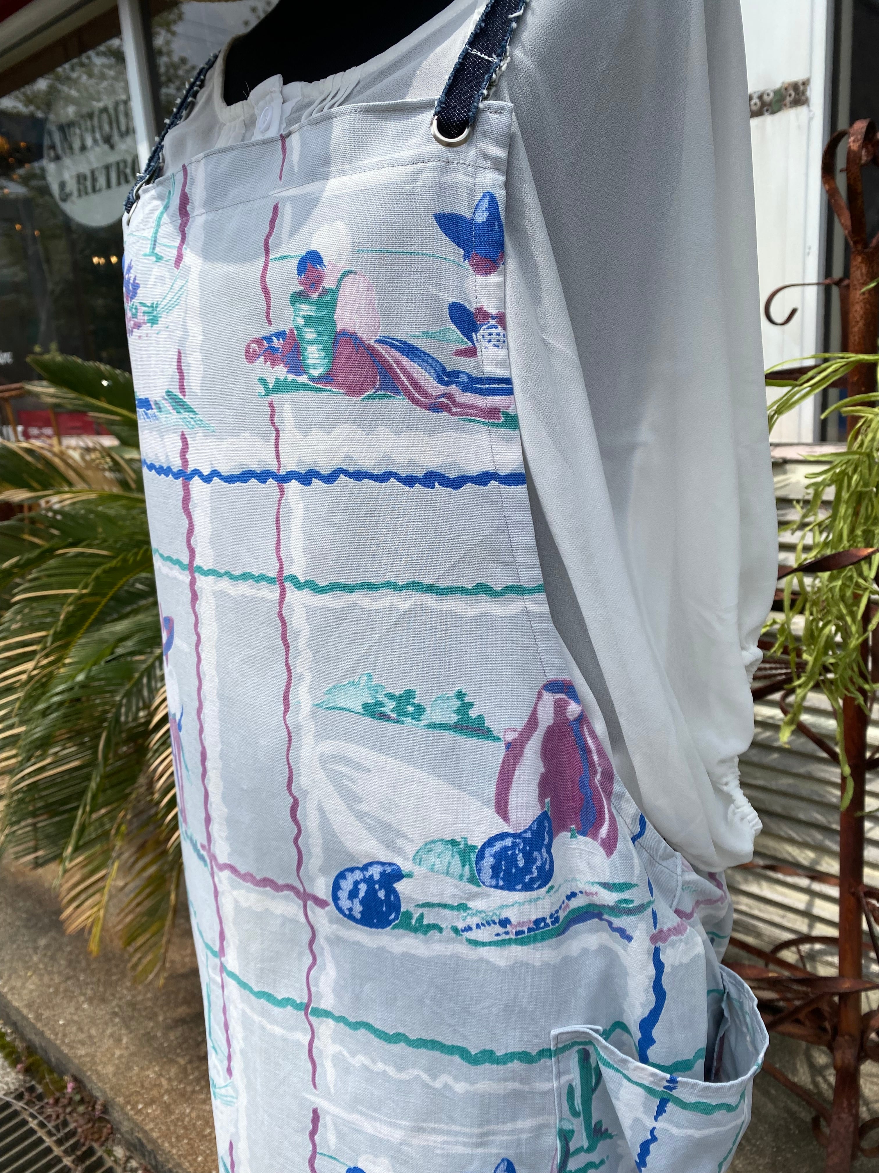 リメイクアイテムならではの、味わいのある風合いと、エプロン風のデザインが魅力的な一着です。 60年代の素敵な柄のコットンクロス使用しました。まさに、世界にひとつのドレスです。 エプロン風デザインは、おしゃれなだけでなく、動きやすさも兼ね備えています。肩紐は、裏がビニール素材のデニムを使用。紐がずれ落ちるのを防ぎます。後ろボタンで調整可能なウェストラインは、誰にでもフィットするため、プレゼントとしてもおすすめです。