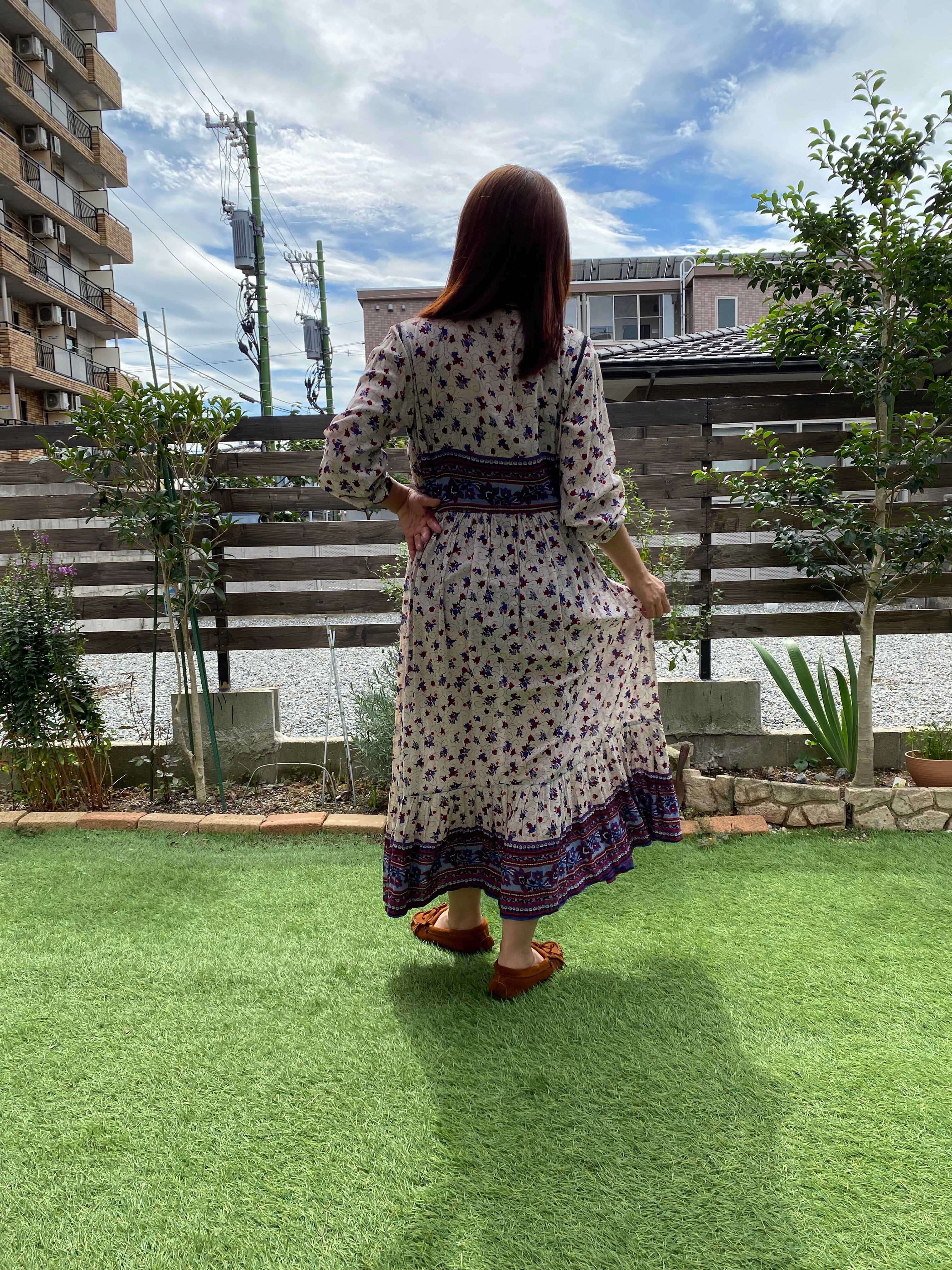 ガーゼ素材の軽やかな風合いが、女性らしい魅力を引き立てるフラワーロングドレス。