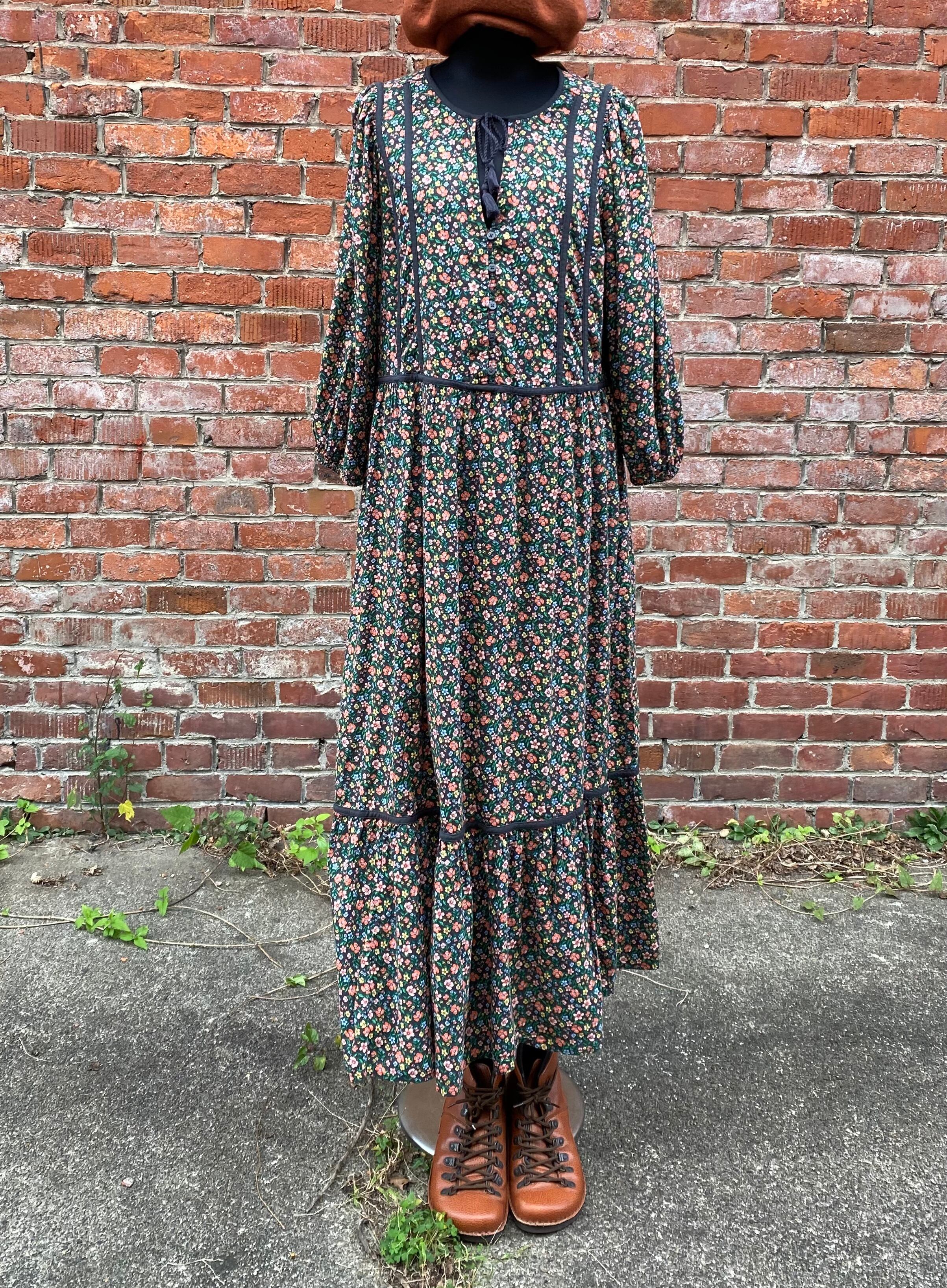 小花柄が可愛いロングドレスです。ゆったりとしたサイズですが、レーヨン素材なので、シルエットが綺麗に出て、いい感じです。重ね着などしておしゃれを楽しめますね。黒地の小花柄なので、他との相性も良く、何にでも合わせやすいと思います。