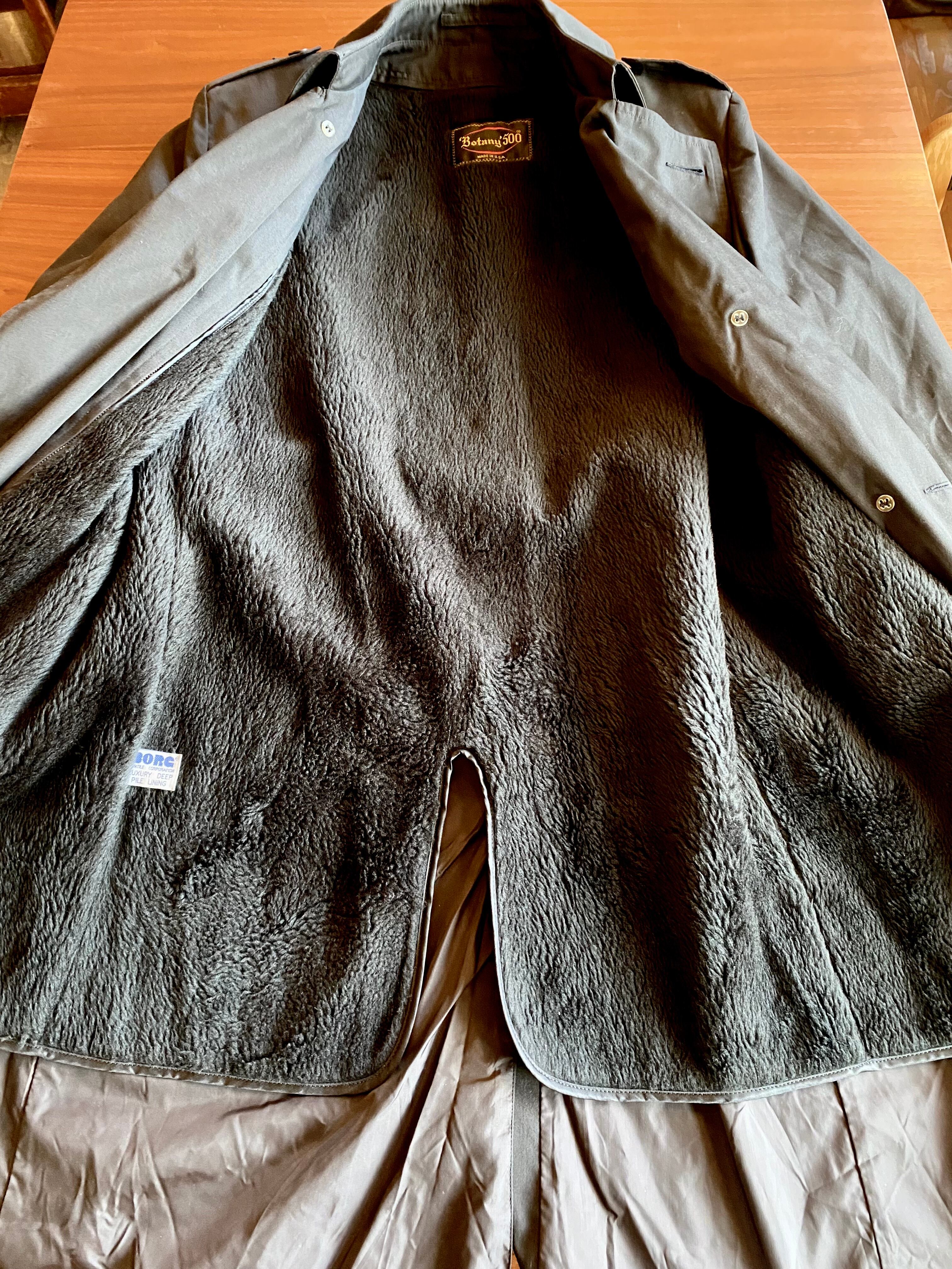 Botanyのロングサイズのトレンチコートです。アメリカ、フィラデルフィアで生まれたクラシックなメンズドレスの老舗ブランド。防寒性のあるライニング付です。メンズのサイズ38ですがオーバーサイズで着用するとこなれ感が出て良い感じになります。光の加減で、色が少し分かりづらいですが、ライナーも全ブラック色です。