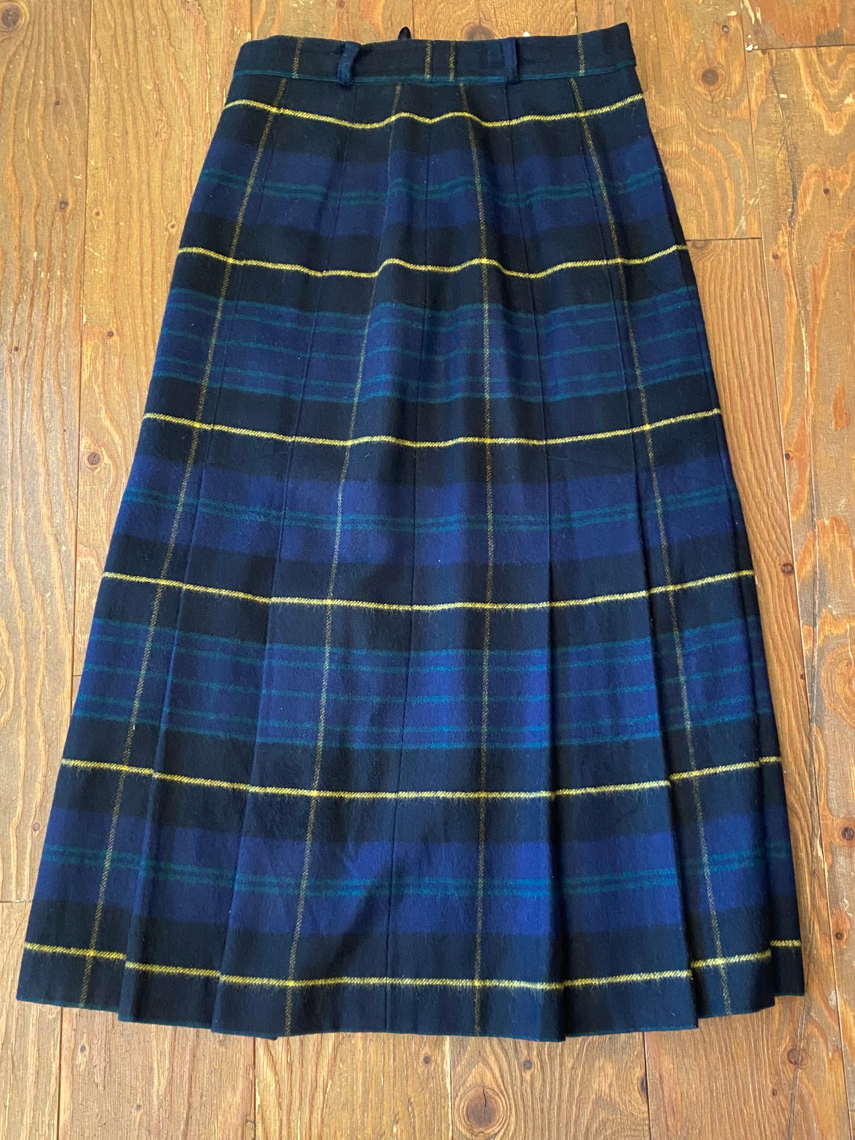 ヴィンテージのボックスプリーツスカートです。パリのメーカーの商品ですが生産は、西ドイツ。上質なラムウールとカシミア素材を使用しており肌触り着心地も良く暖かい、一日中快適に過ごせます。採寸は長めでタイトなラインが女性らしさを引き立て、途中から広がるプリーツが大人っぽい雰囲気を演出します。