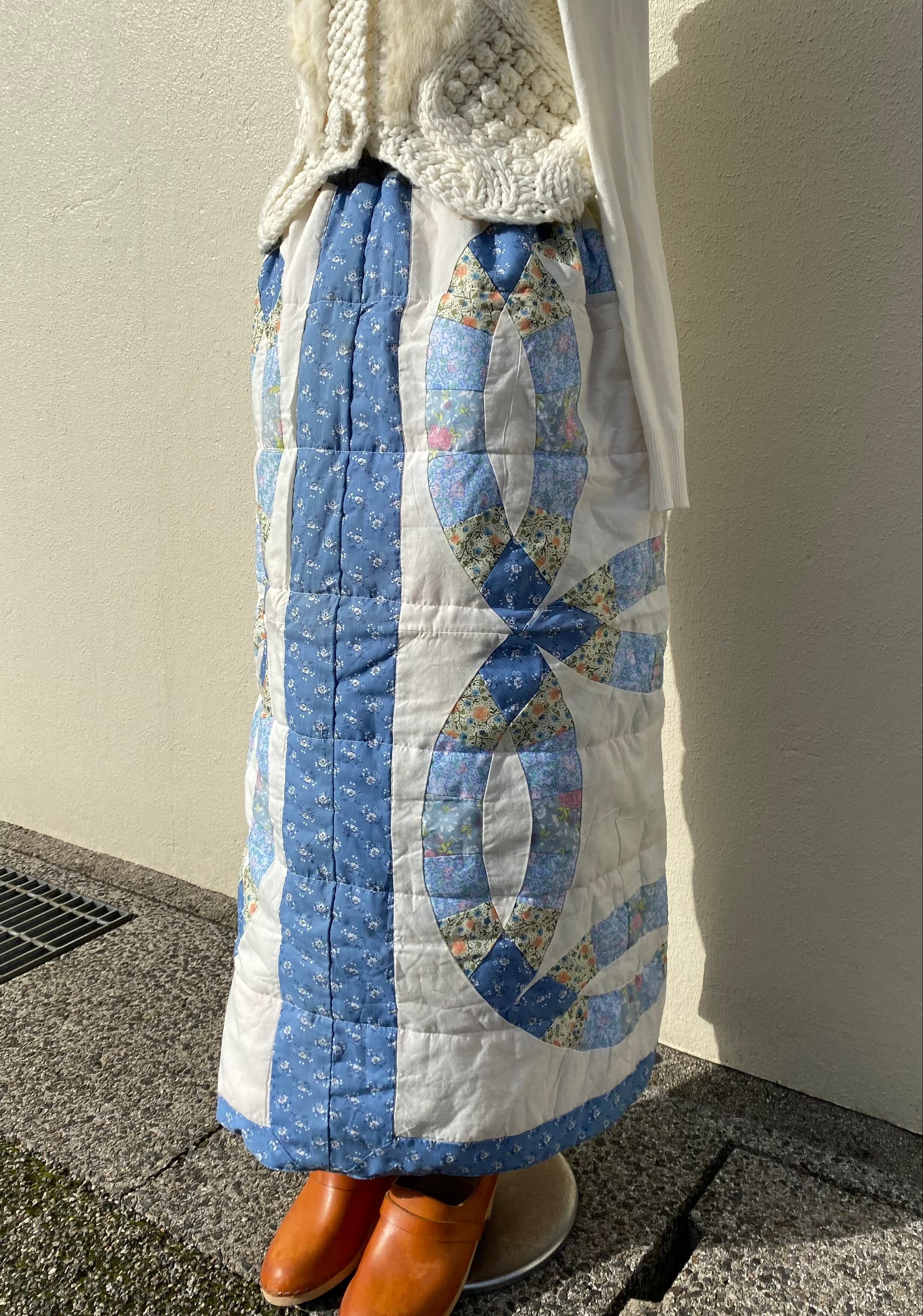 キルティングのパッチワークで製作したロングスカートです。リバーシブルになっていて2つの柄を楽しむことができます。トレンドのパッチワークデザインが、オシャレ度をアップさせてくれます。