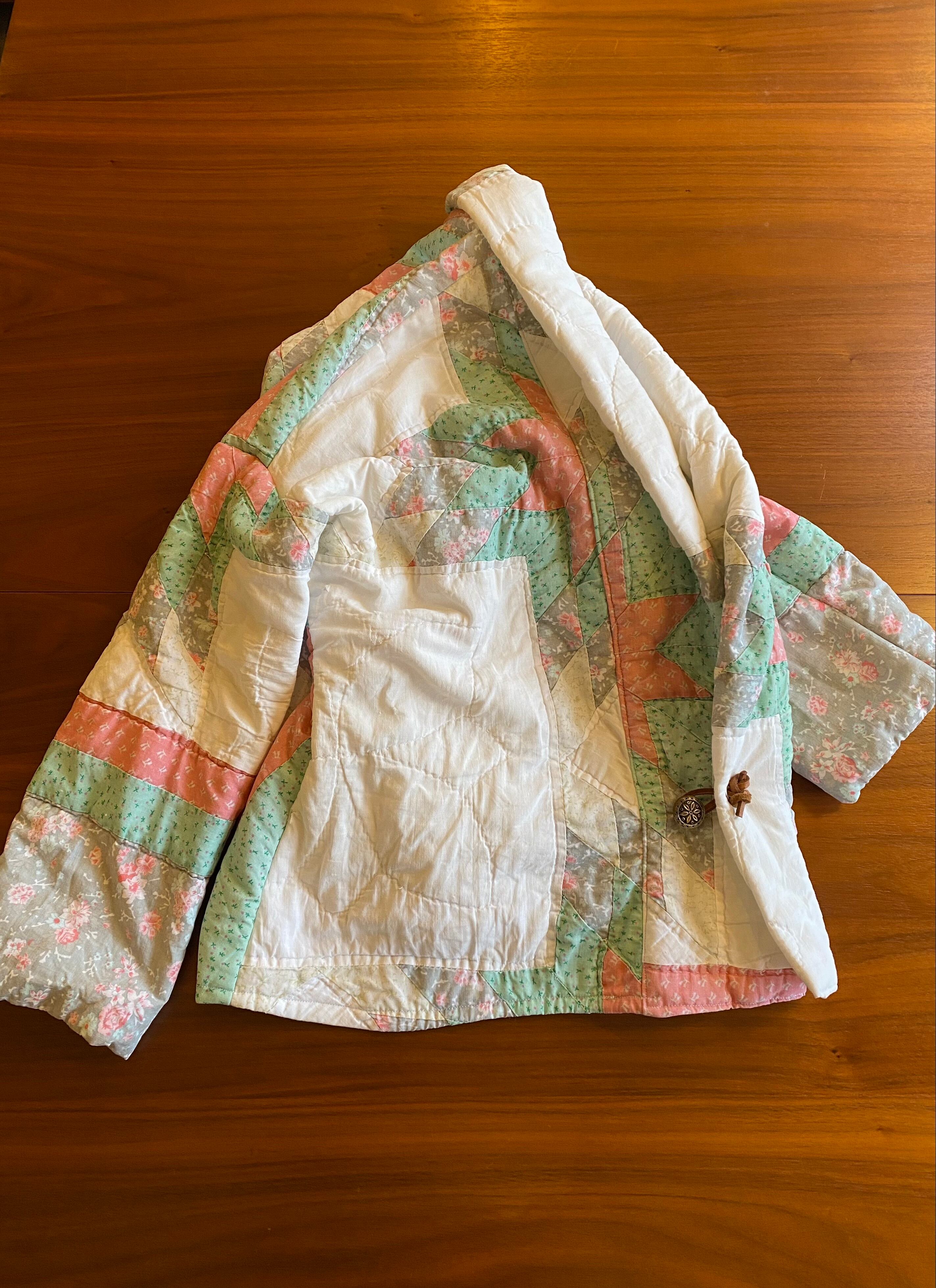 手作業で生地を継ぎ合わせたパッチワークデザインが特徴でヴィンテージの生地を使用しています。中綿入りで、軽くて暖かく、着心地も良いです。