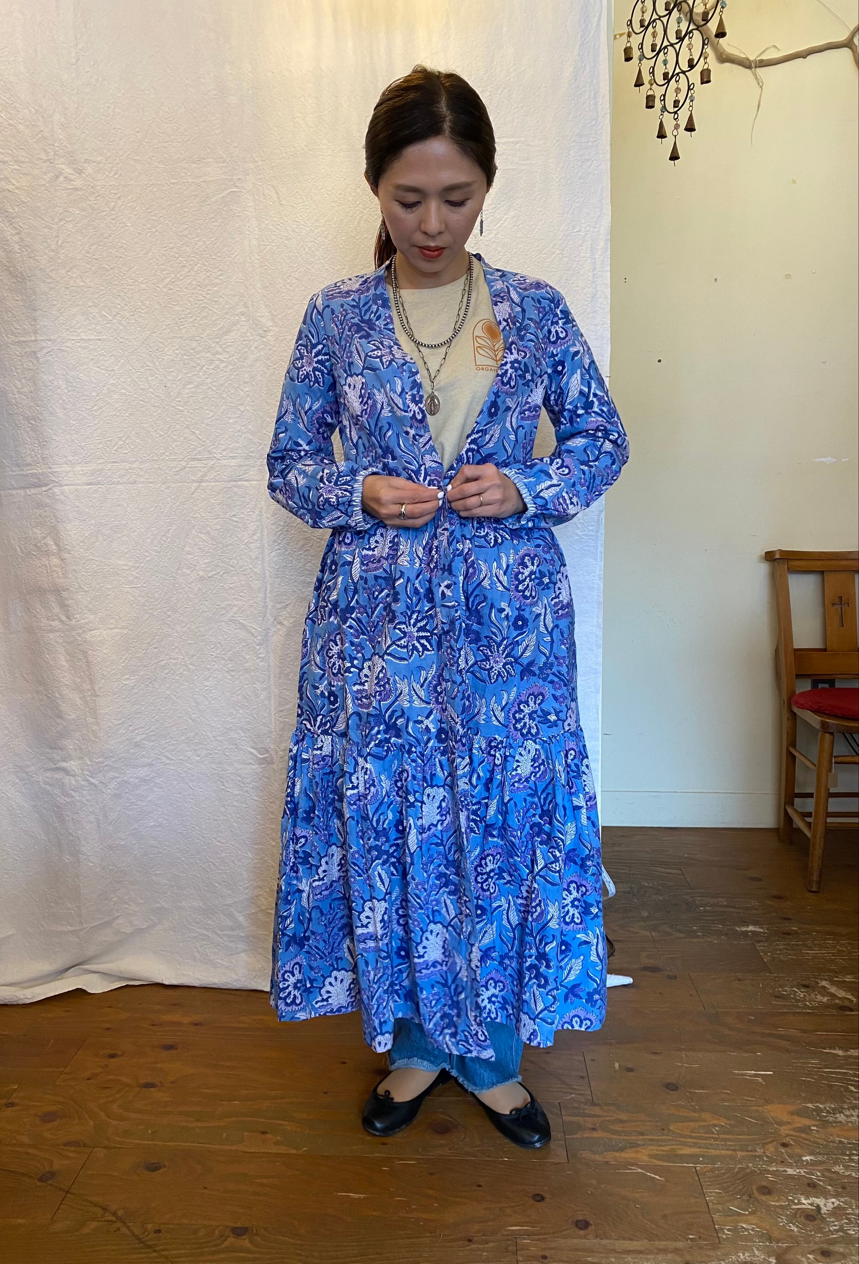 着心地の良いコットン素材と美しいブロックプリント柄が特徴のワンピース、ボタンを前全開にすると、羽織りとしてもお使いいただけます。スタイリッシュな装いにもすごく合います。