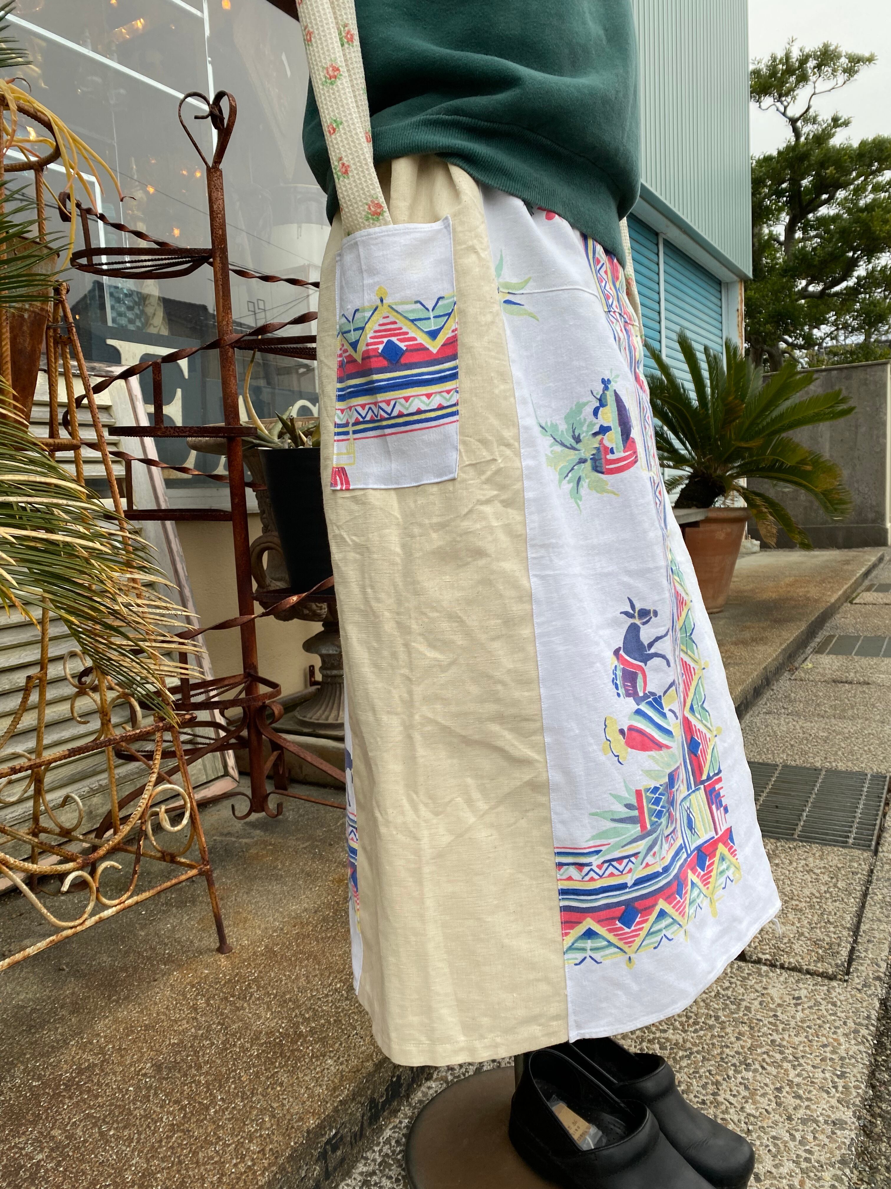 こちらのリネンスカートは、フランスのヴィンテージ生地を使用しております。いろんな生地を縫い合わせて製作したパッチワークスカートです。ウエストは紐で調節が可能で、お好みに合わせて前後どちらでも着用できます。あえてギャザーをつけずボリュームを出さずにすっきりとしたラインにしました。