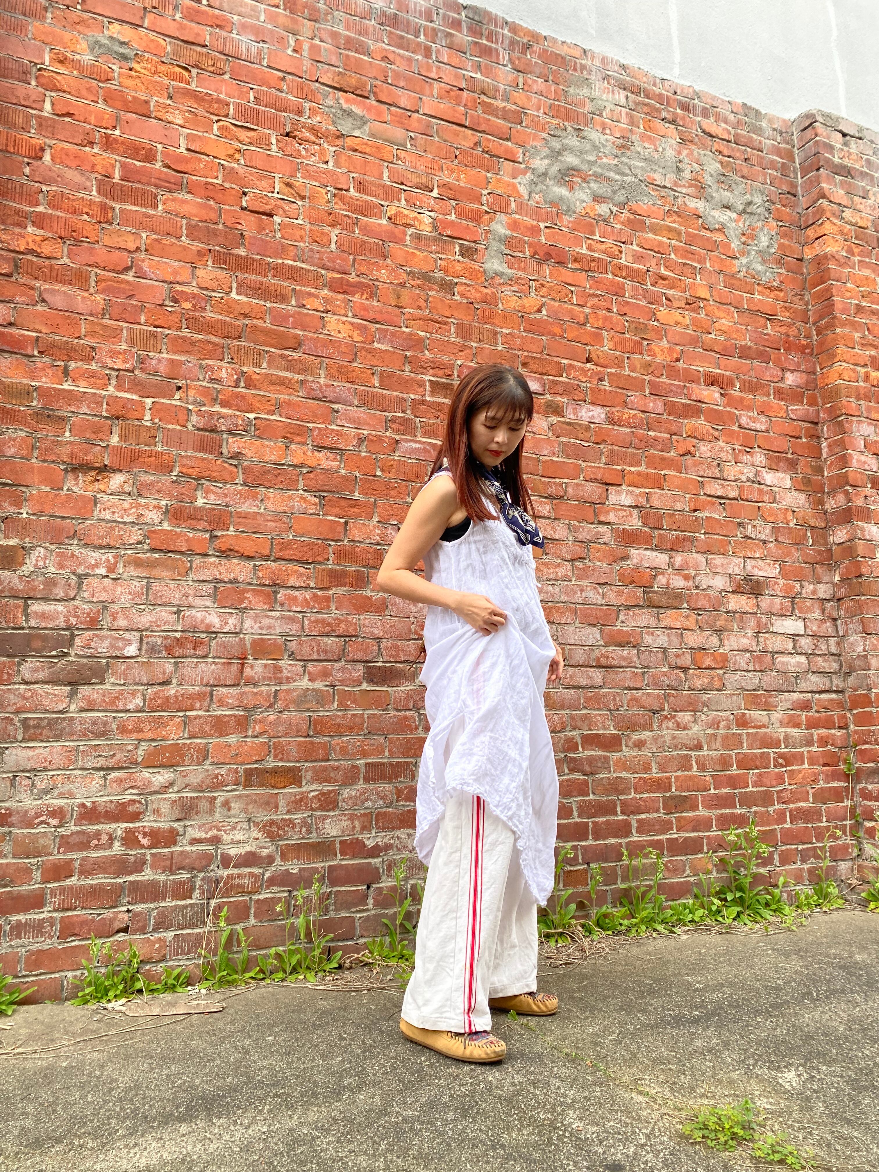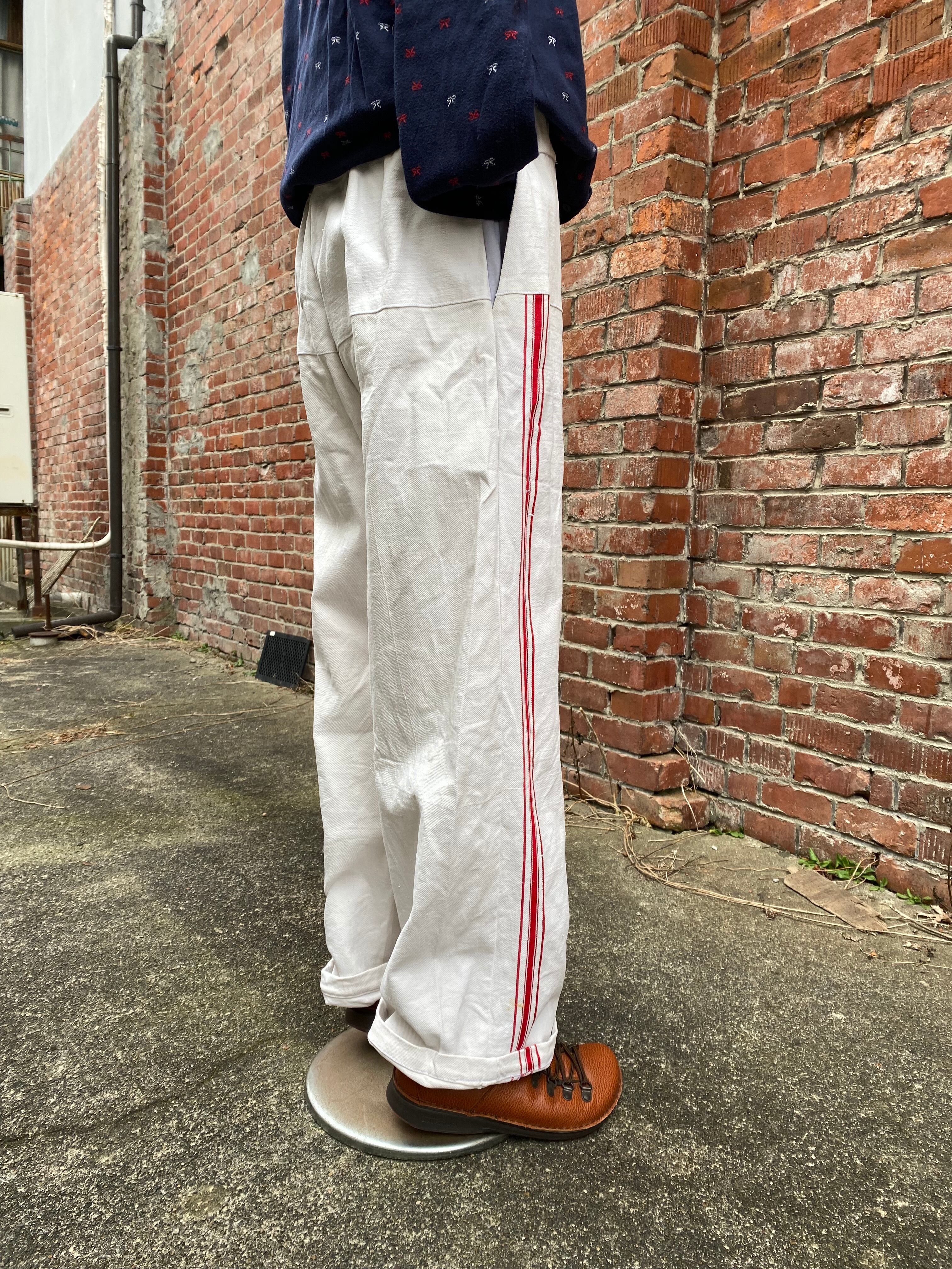 しっかりとした厚手のヴィンテージリネン素材を使用して制作したパンツです。赤のラインがポイントとなっており、ヴィンテージ感をさらに引き立たせています。