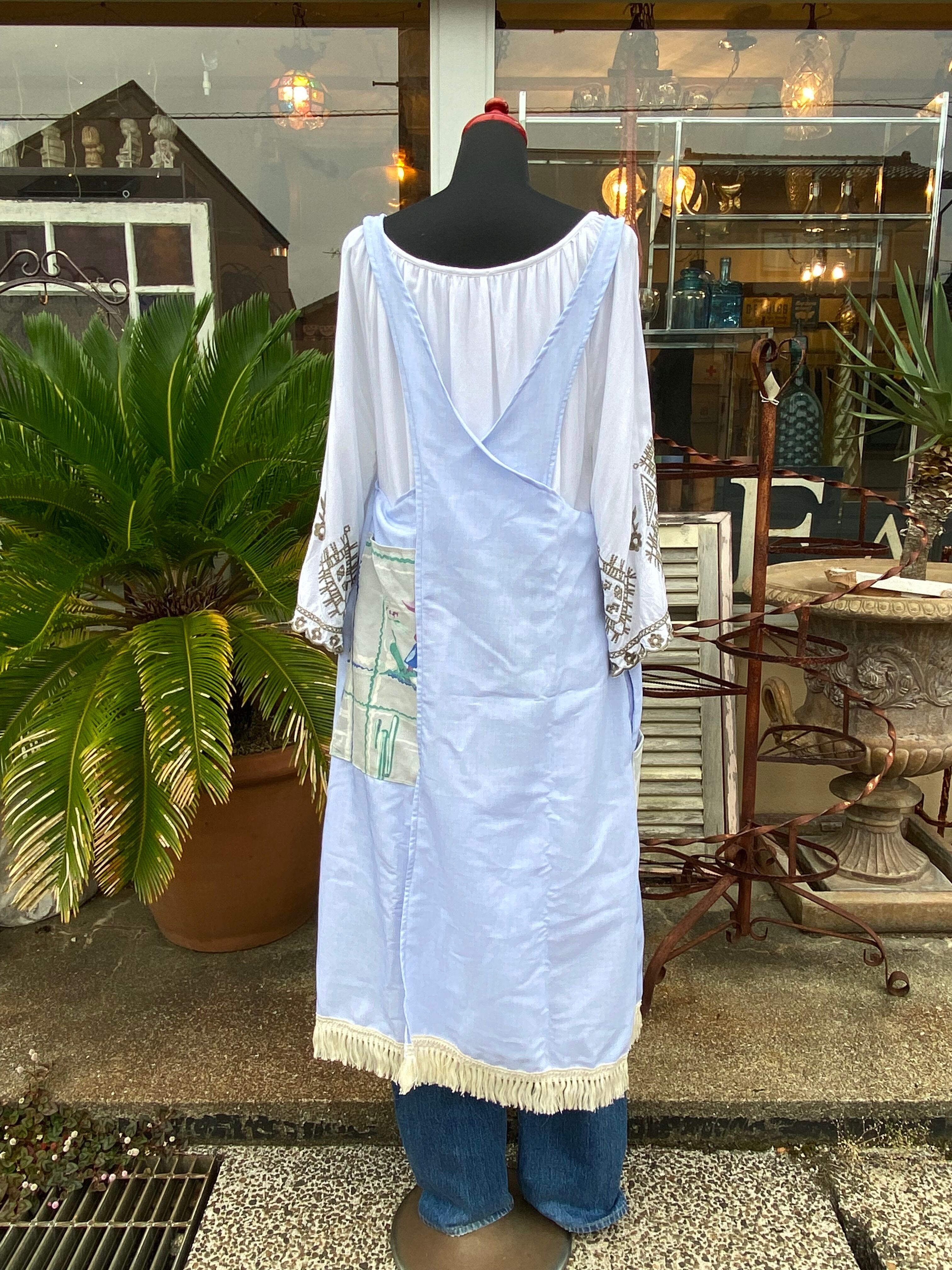 フリンジデザインがポイントのエプロンワンピースを製作しました。ポケットにはヴィンテージの生地を使用し、個性的な雰囲気を演出。普段のコーディネートに一手間加えたい方におすすめです。さっと着用でき、軽い素材で動きやすい、快適なドレスです。