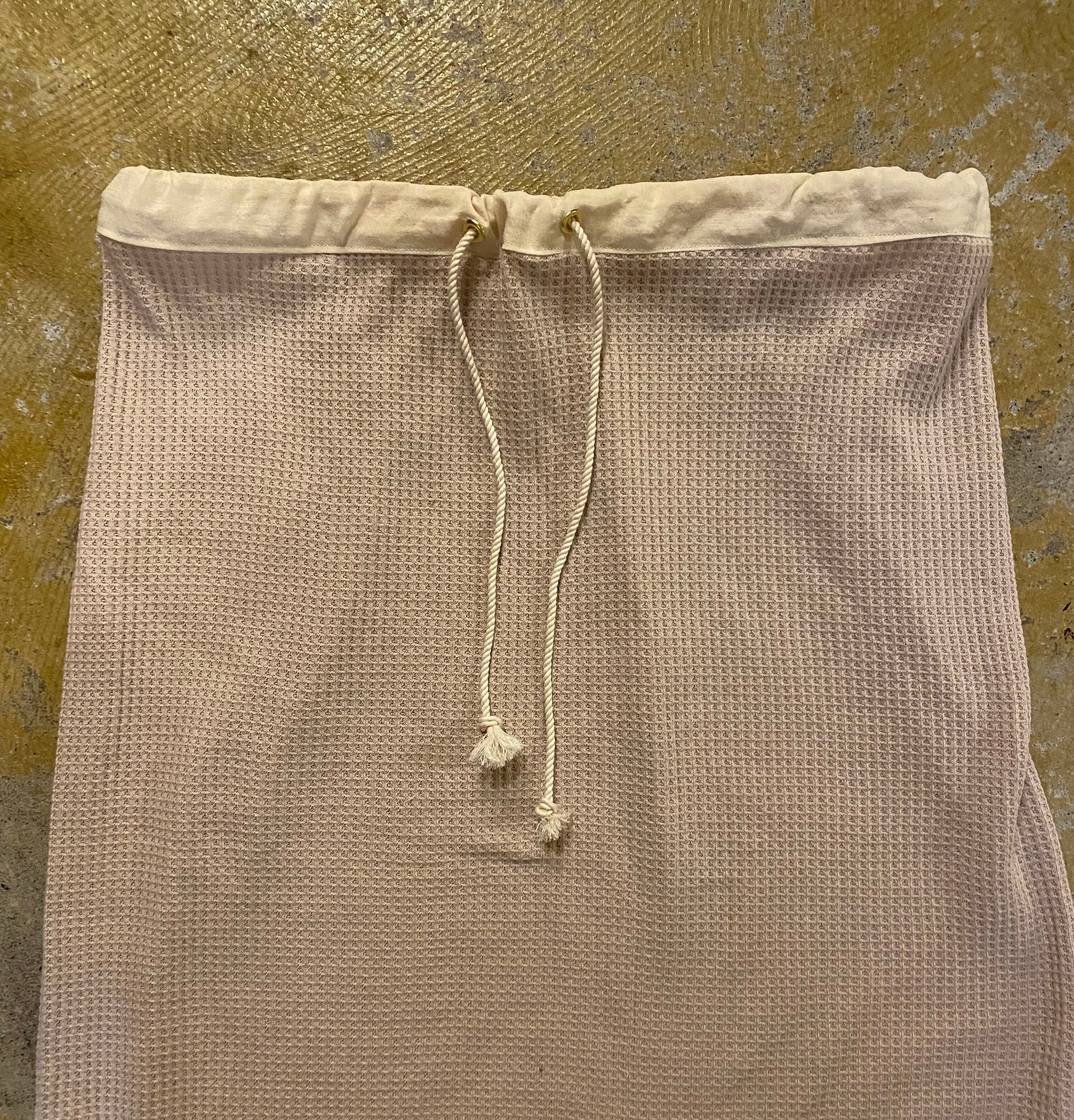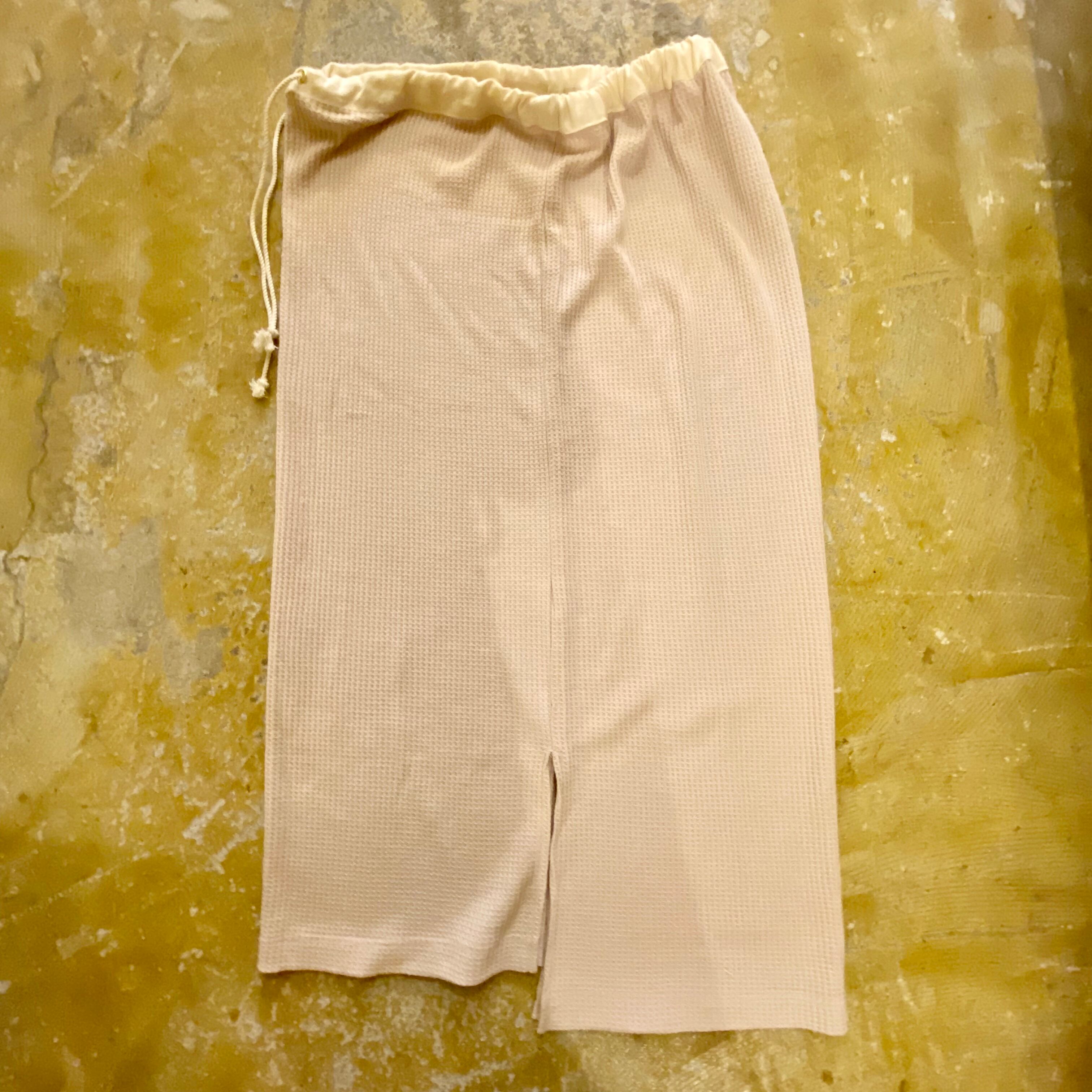 ワッフル素材のロングスカートを製作しました。伸縮性があり、動きやすいのが特徴。さらに、軽い着心地で快適にお過ごしいただけます。サイドにはスリットを施し、さらに動きやすく。ウエストはゴムと紐で調節可能なので、誰にでもフィットします。着心地もよく、すぐに乾く、ワッフル素材。シンプルなデザインなので色々コーディネイトが楽しめます。