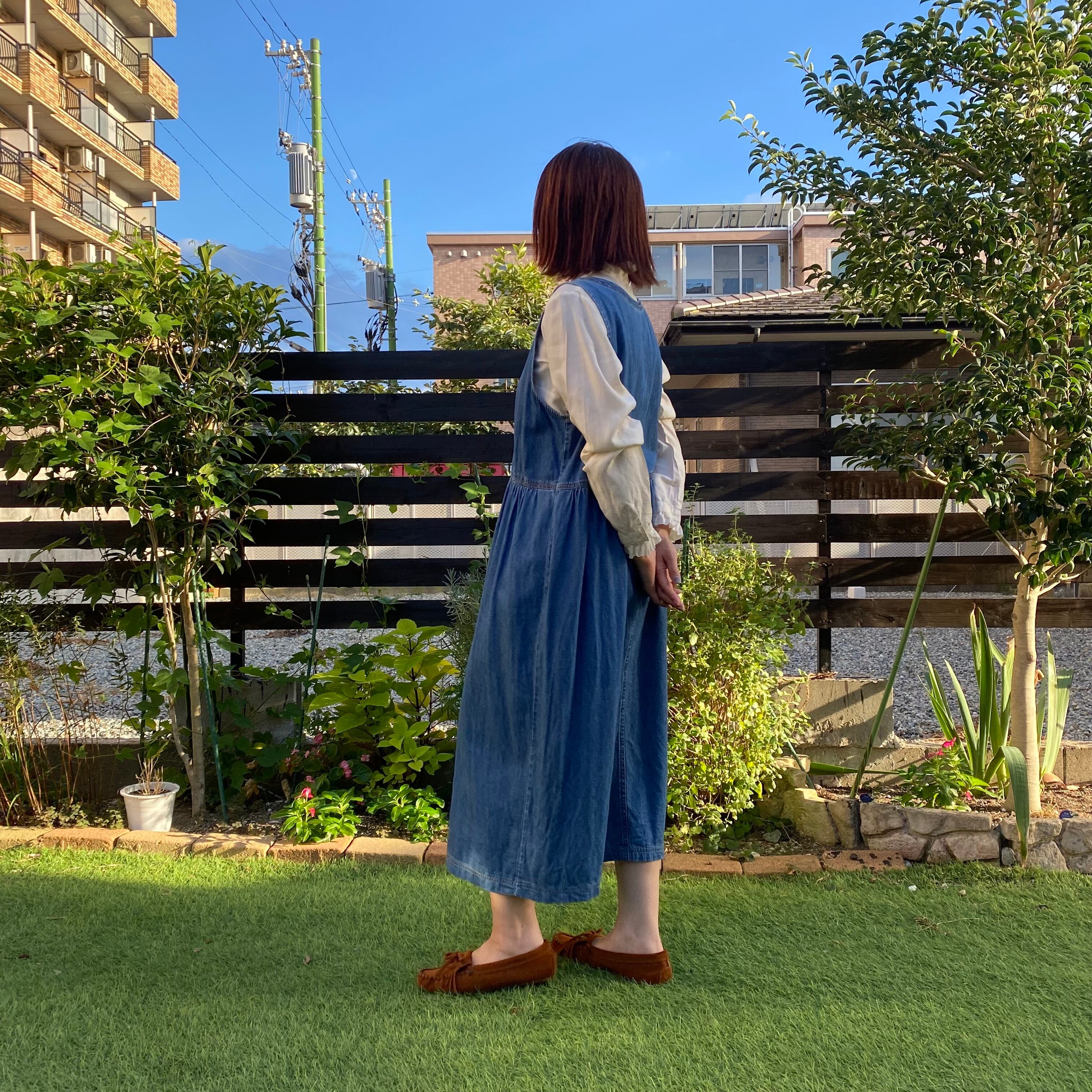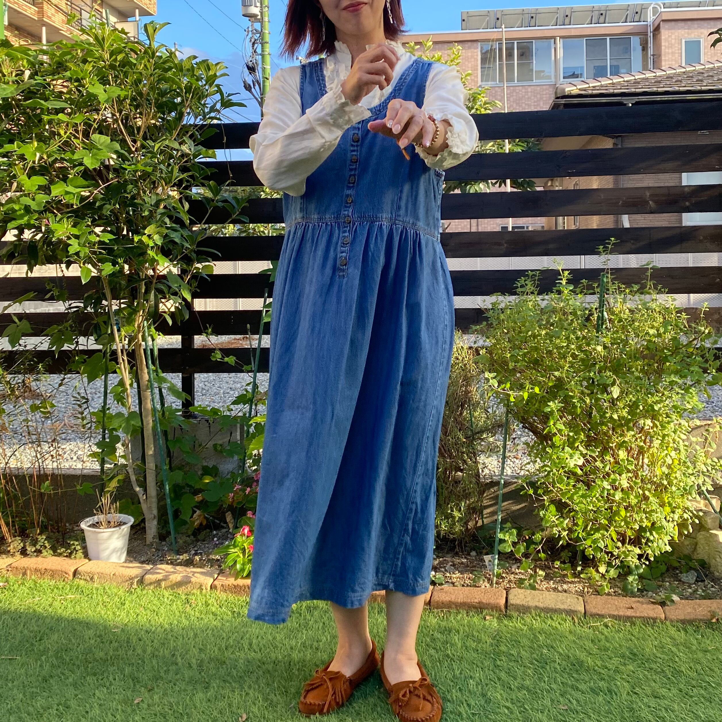 薄手のデニムジャンパースカートです。定番の形で、コーディネートがしやすく、着回しも効いて、日常使いに便利なアイテムです。薄手のデニム素材は、軽やかで着心地も良く、オールシーズンで活躍します。