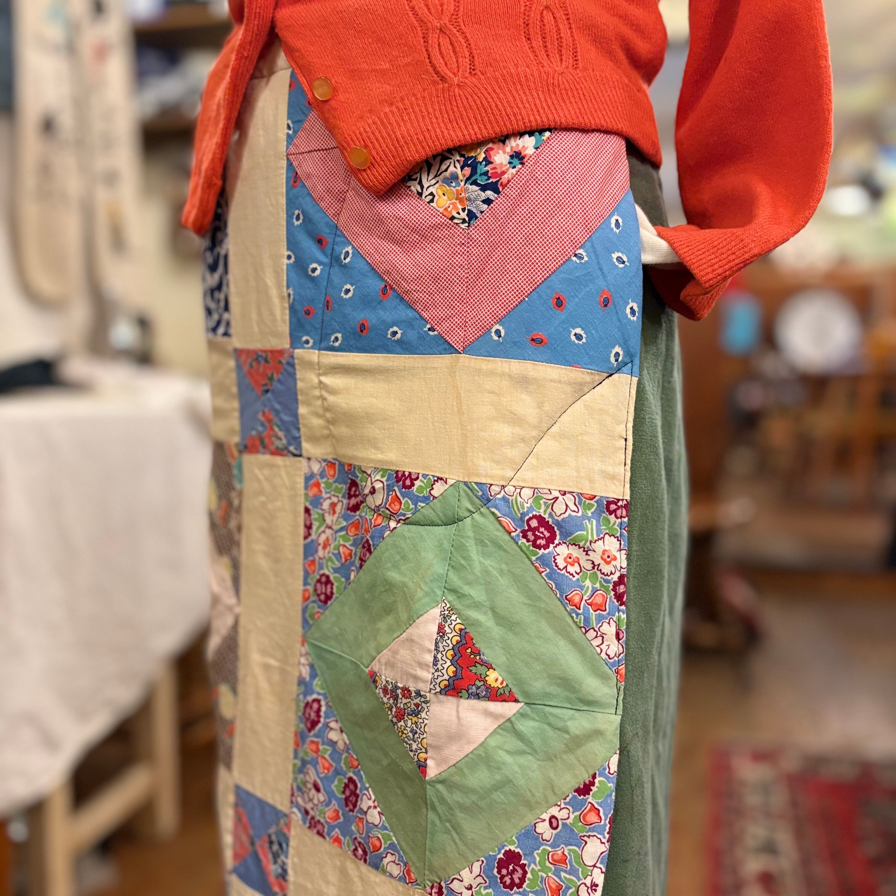 アメリカのアンティークキルトを使用し、制作したリメイクスカートです。フロントには独特なパッチワークデザインのキルトトップにチェックのキルトを張り合わせました。バックにはミリタリーファブリック。サイドに手書きの文字、ナンバーが入っています。リメイクならではのアート感が楽しめます。